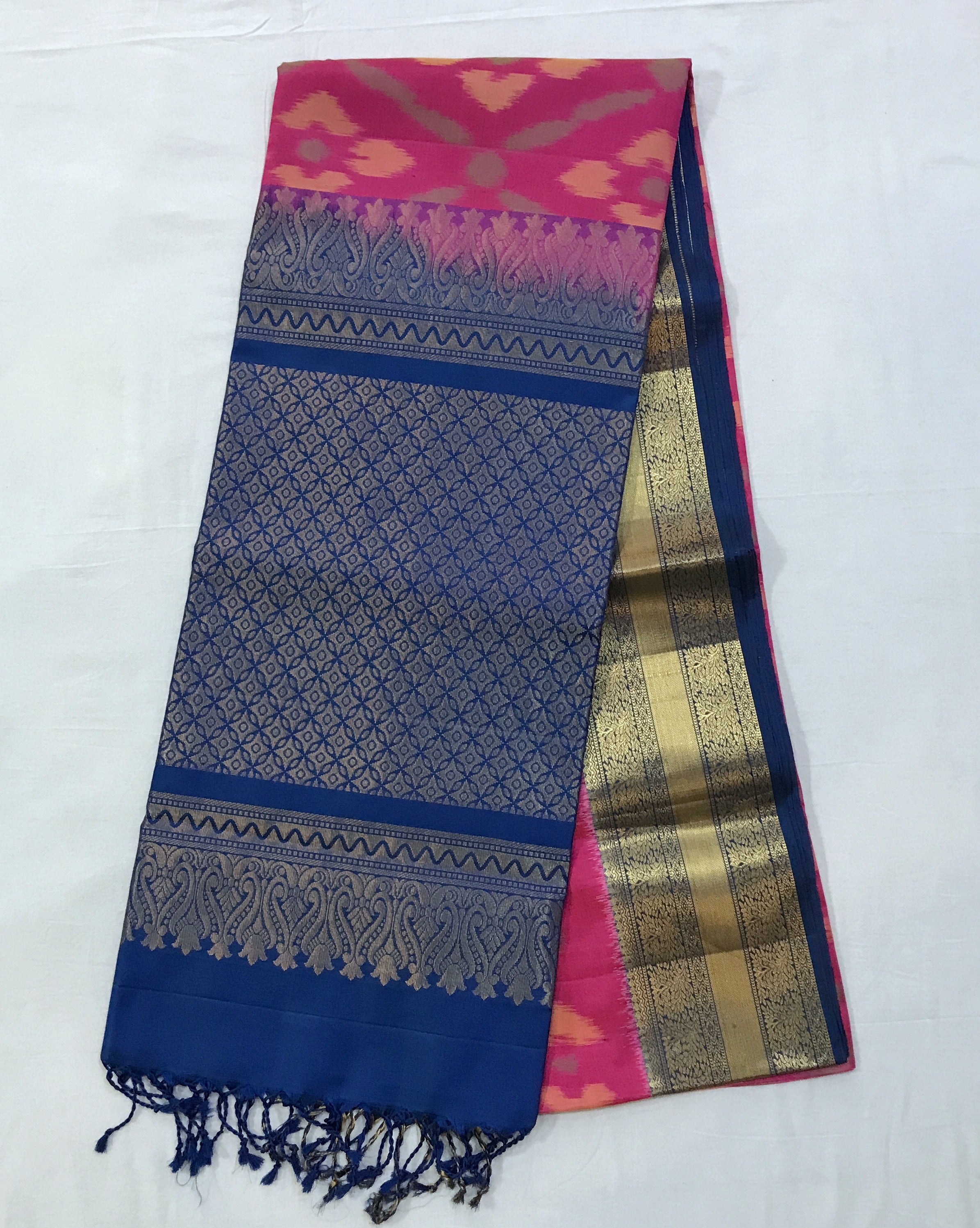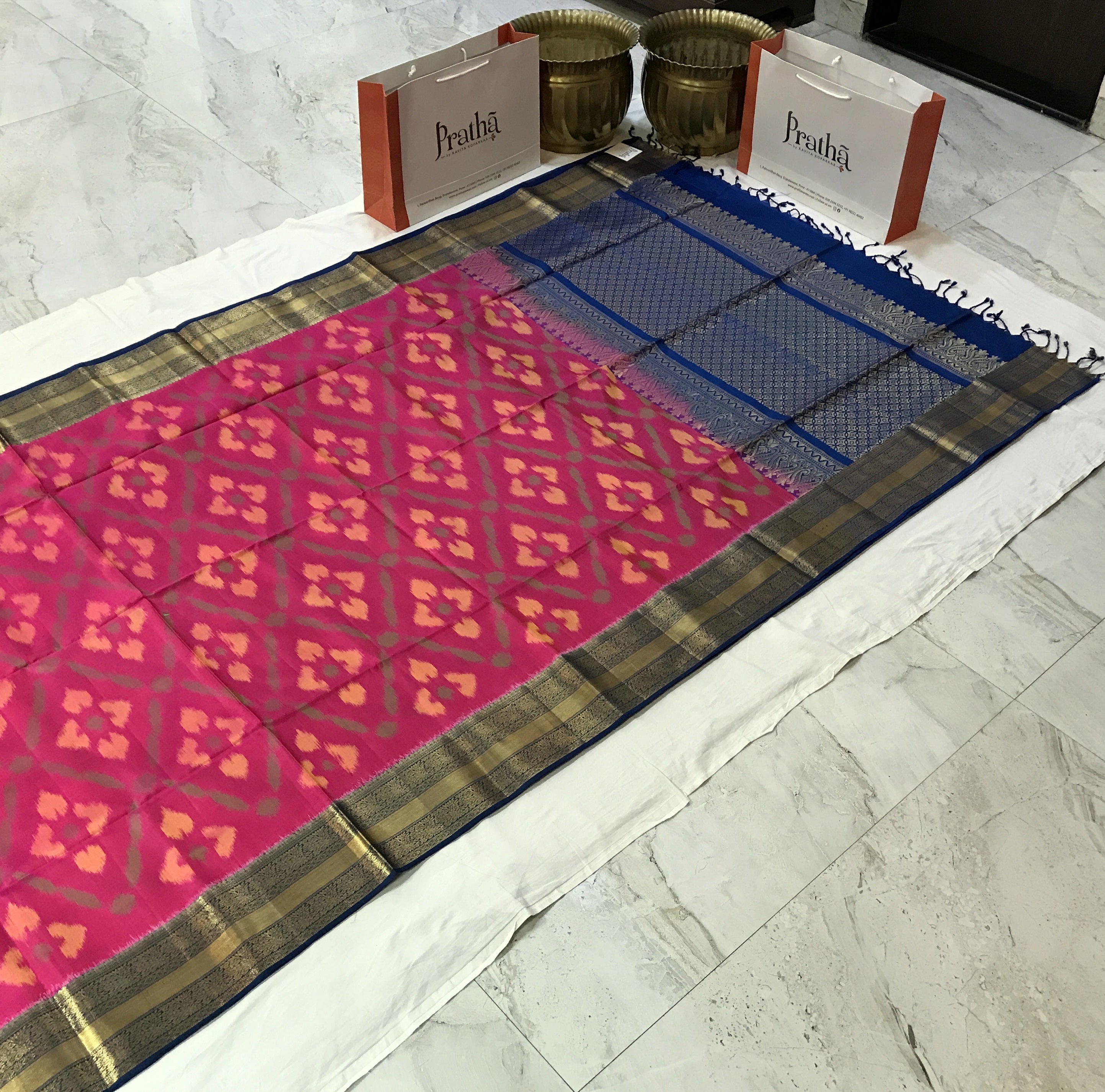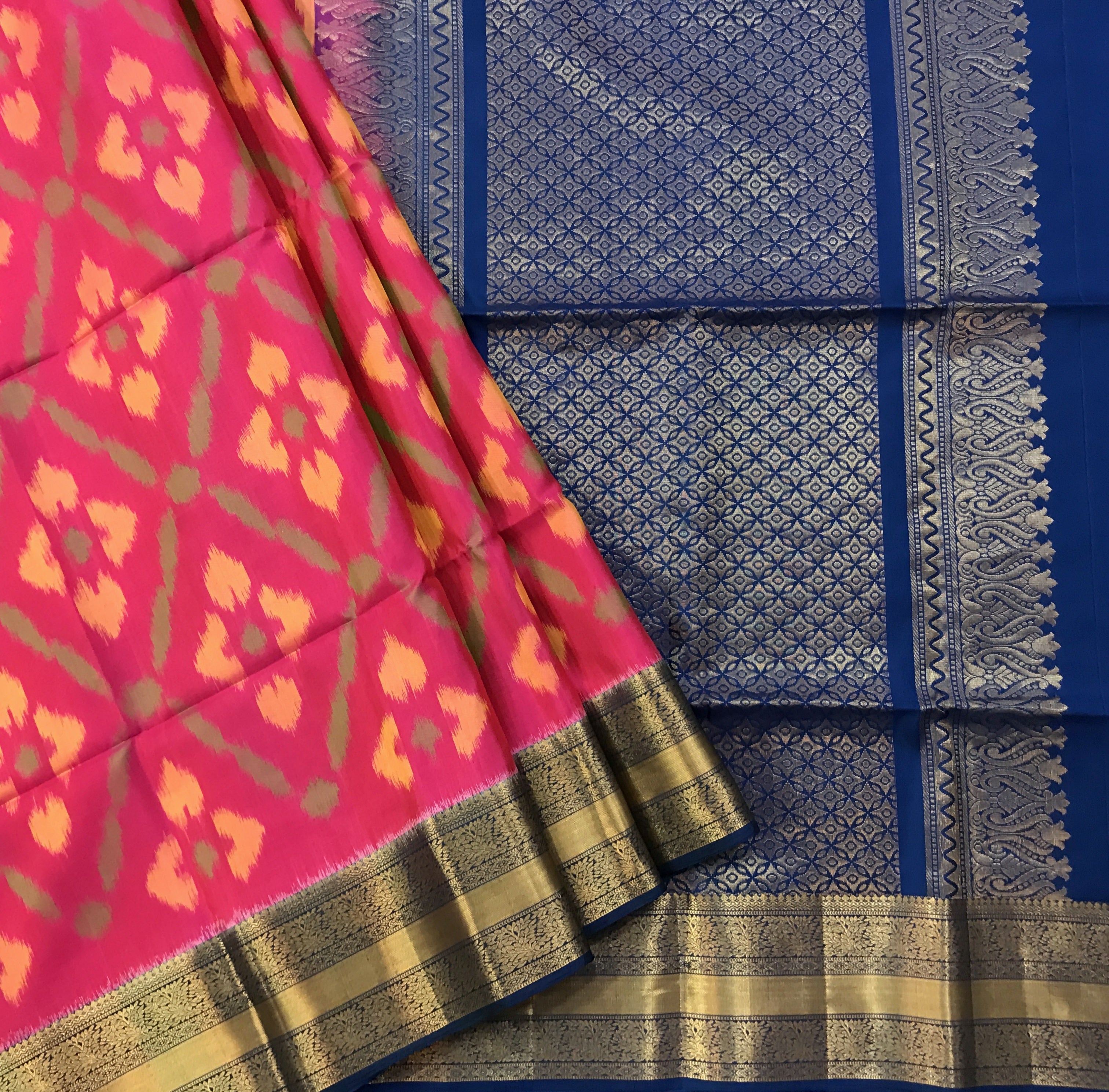 A very beautiful and unusual combination of pink Soft Silk saree with its Ikkat design all over the saree , perfect saree for summers! Don't miss the blue colour traditional contrast golden zari border is looks very fantastic with zari design on pallu. Light in weight and easy to drape.