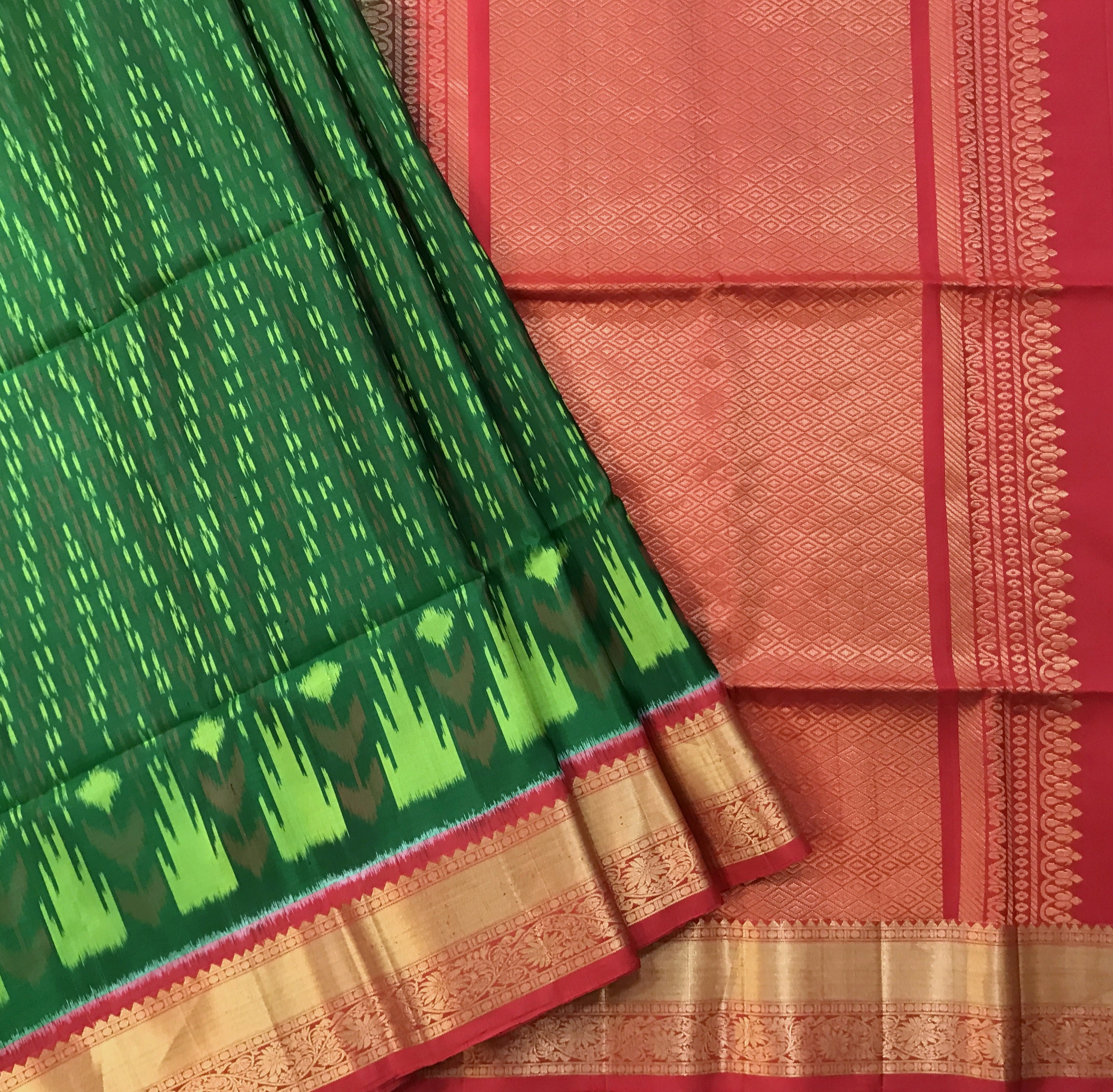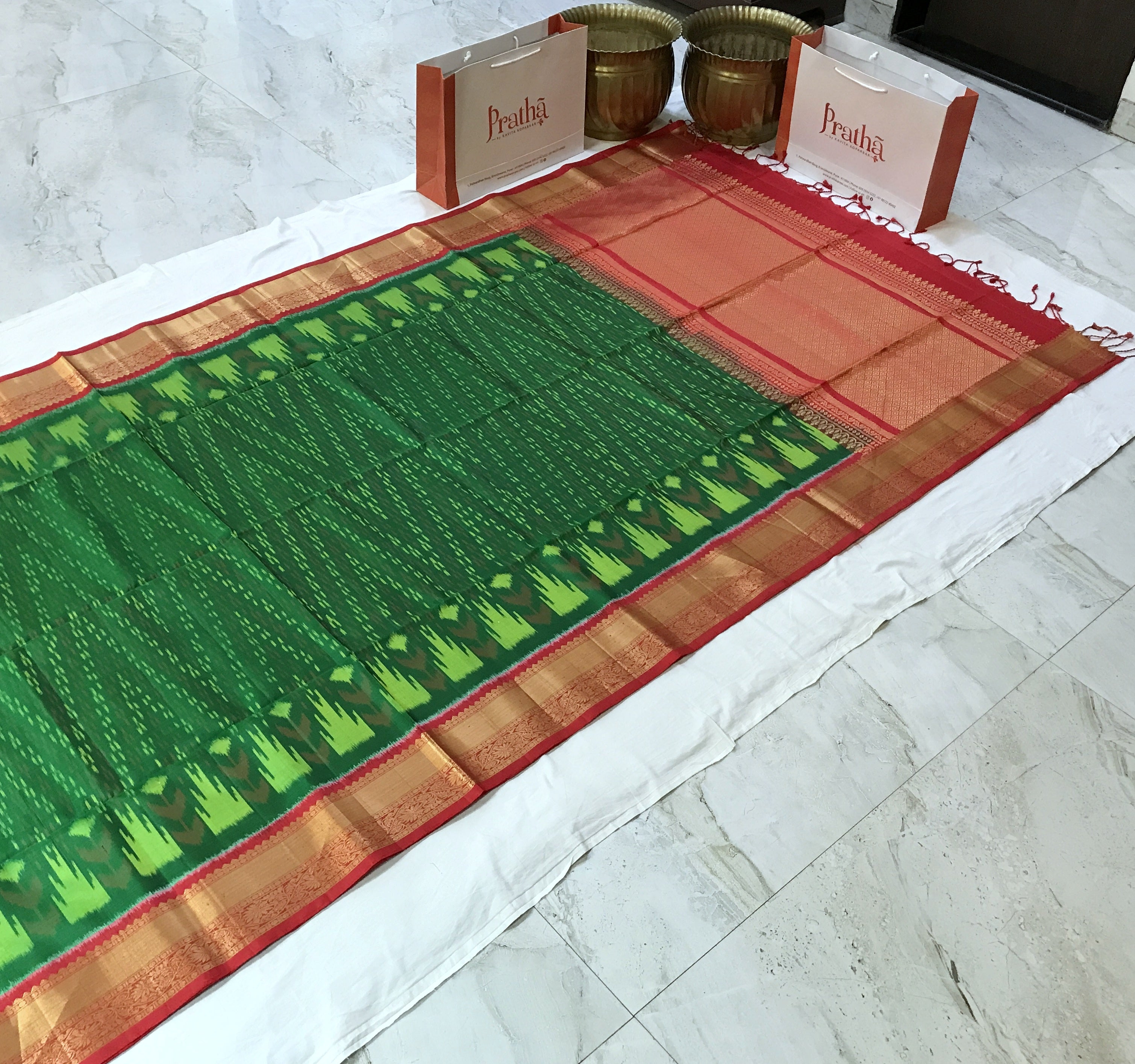 A green coloured saree paired with red is a perfect mixture, this Soft Silk saree flaunts beautiful ikkat design with contrast red golden zari traditional border and zari pallu give this weave a classy feel. Comfortable to wear and easy to drape this saree is look special. This green and red combination makes this saree a prefect casual or party wear weave.