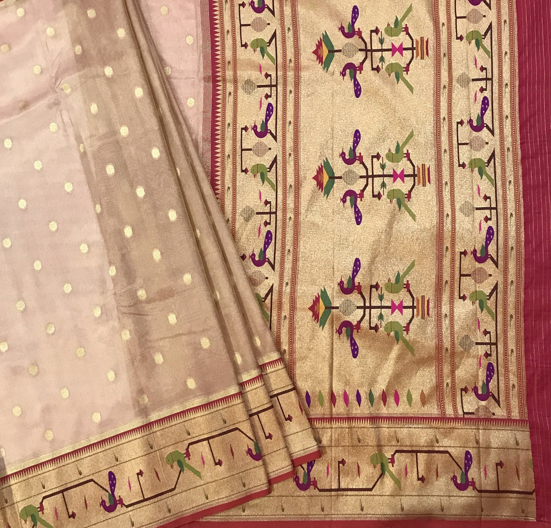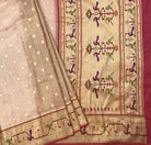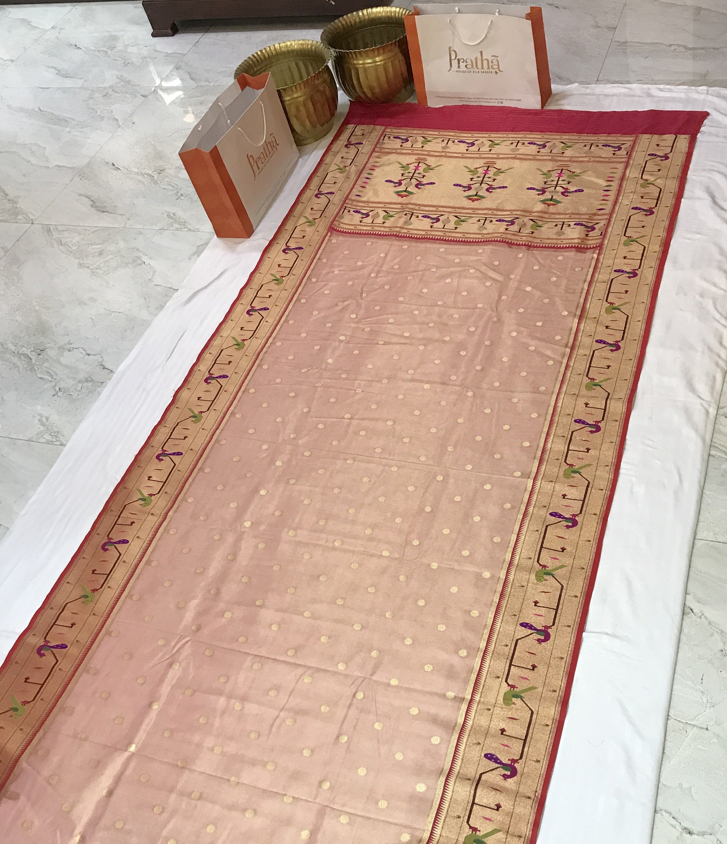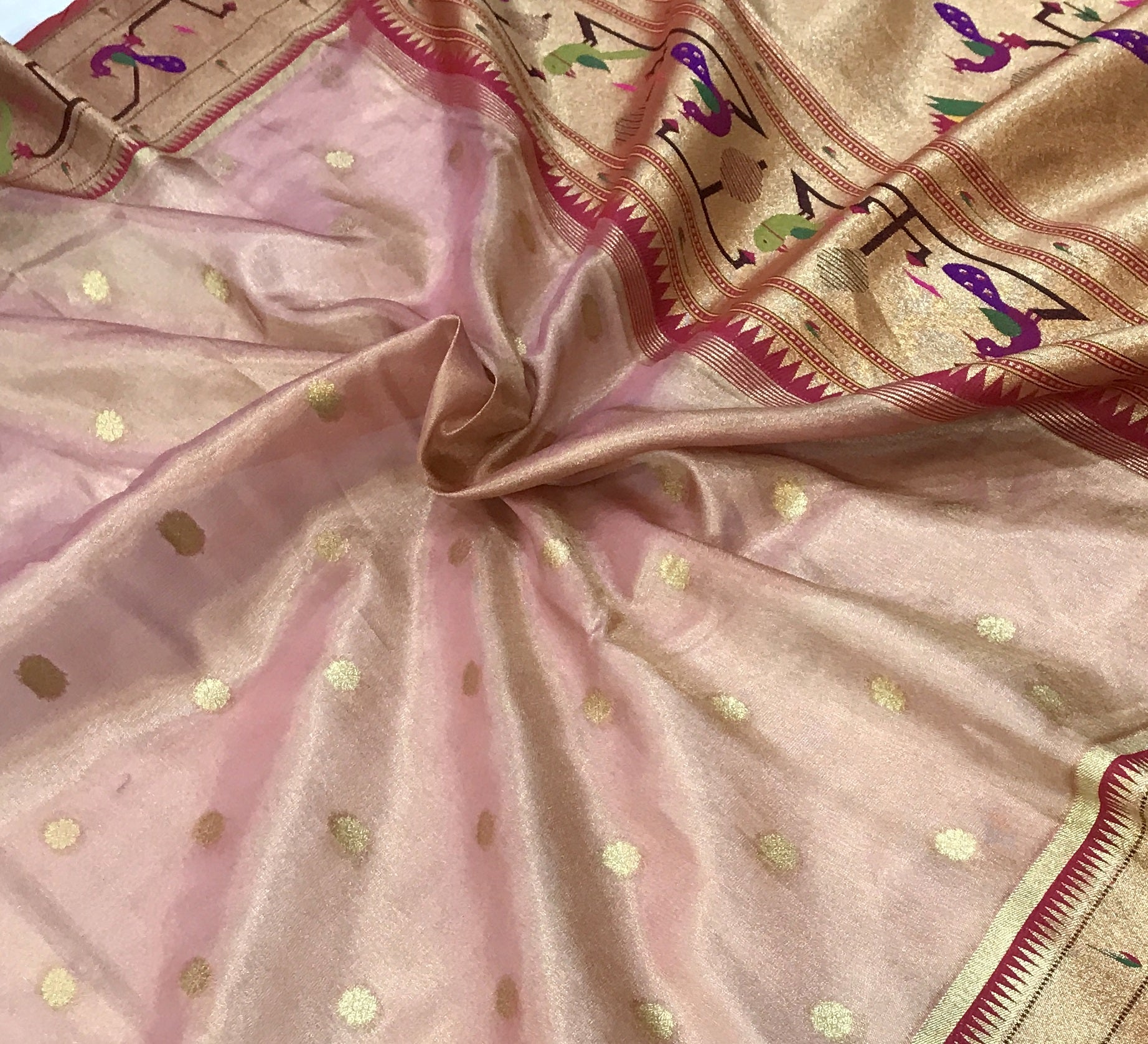 This elegant tissue Paithani in a soothing pastel pink shade exudes a rich festive charm. The delicate golden tissue weave paired with subtle gold buttis across the body gives it a refined, sophisticated glow. The beautifully crafted golden tissue border adorned with vibrant floral and peacock motifs in pink, purple, and green adds a timeless Paithani grace. The exquisite pallu, featuring the same intricate meena-worked peacocks and florals, enhances the saree with a luxurious, traditional appeal. A perfect pick for celebrations, this tissue Paithani stands out for its classic artistry and understated opulence.