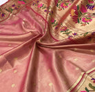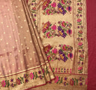 This elegant tissue Paithani in a soothing pastel pink shade exudes a rich festive charm. The delicate golden tissue weave paired with subtle gold buttis across the body gives it a refined, sophisticated glow. The beautifully crafted golden tissue border adorned with vibrant floral and peacock motifs in pink, purple, and green adds a timeless Paithani grace. The exquisite pallu, featuring the same intricate meena-worked peacocks and florals, enhances the saree with a luxurious, traditional appeal. A perfect pick for celebrations, this tissue Paithani stands out for its classic artistry and understated opulence.