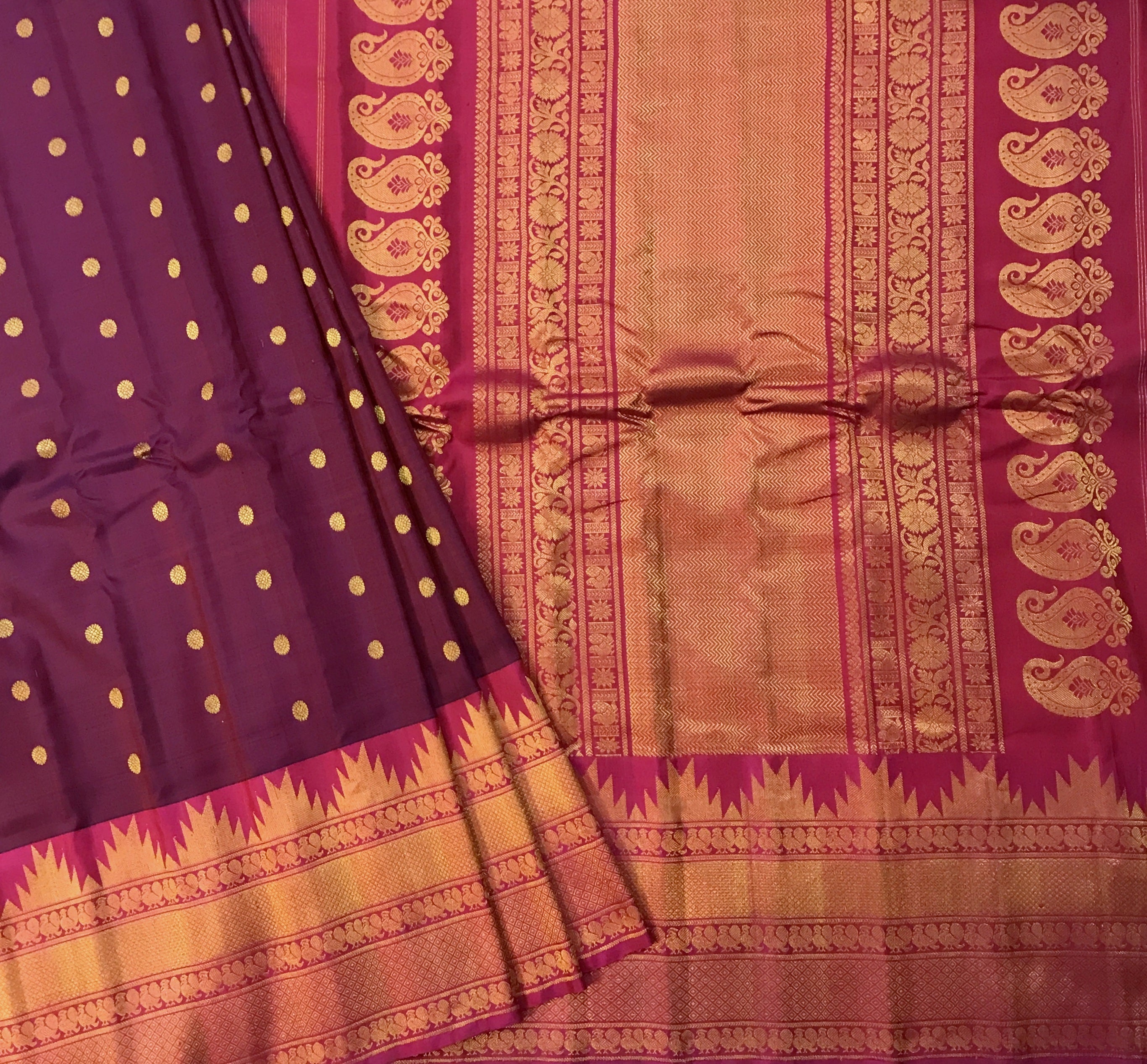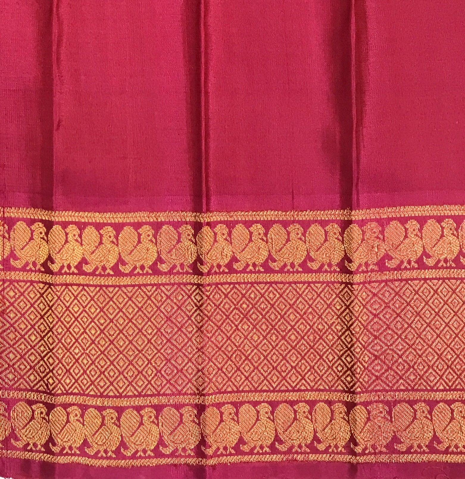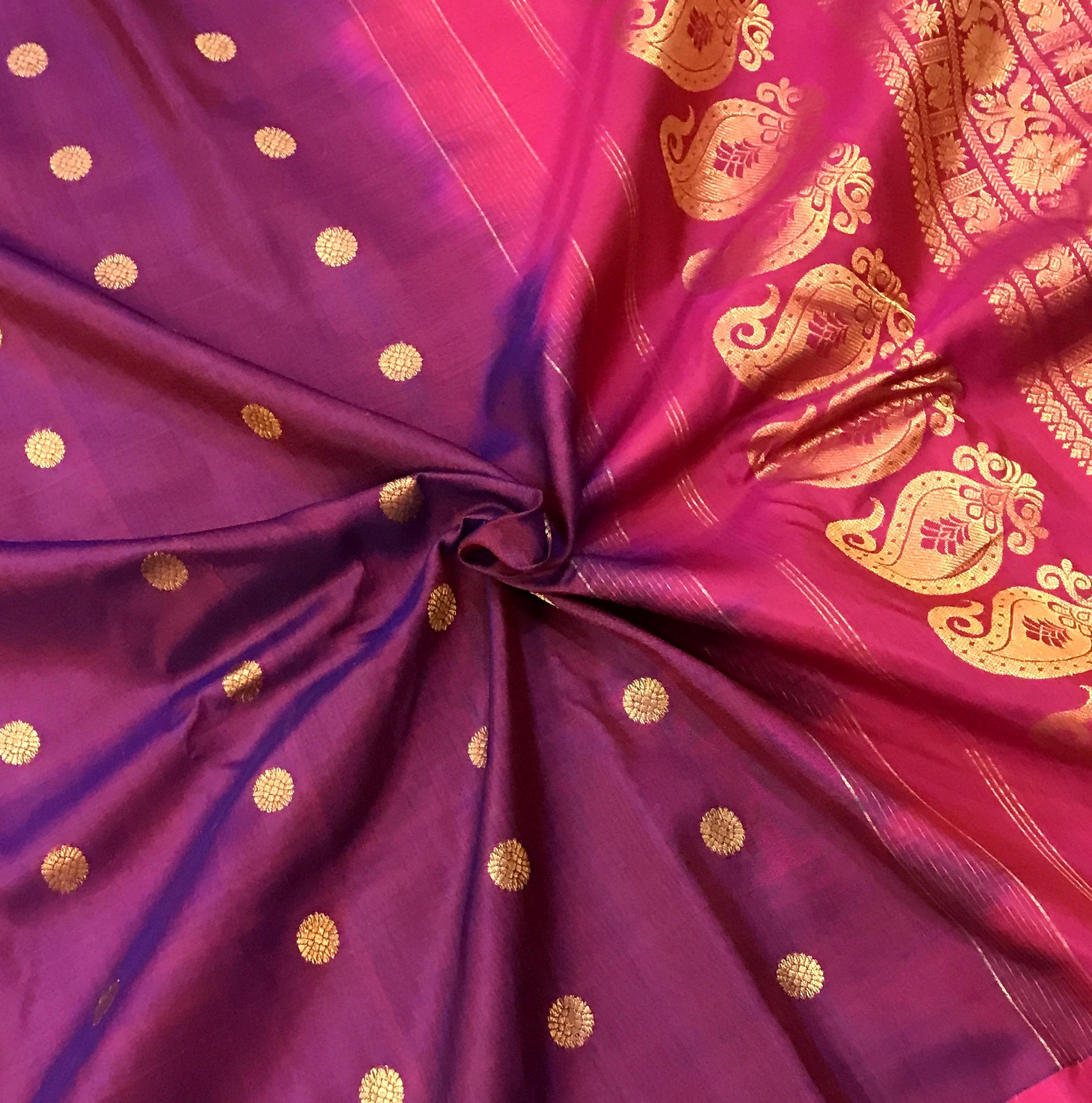 A fresh shade of magenta and fantastic bright lavender border in pure silk Gadhwal looks beautiful in day light as well as night time. This one is special weave, the unique shaped floral butti evenly woven in golden zari thread through the saree give it festive touch. The golden zari border and the traditional pallu complement beautifully with this saree. This is the perfect choice for someone who is looking for traditional saree.