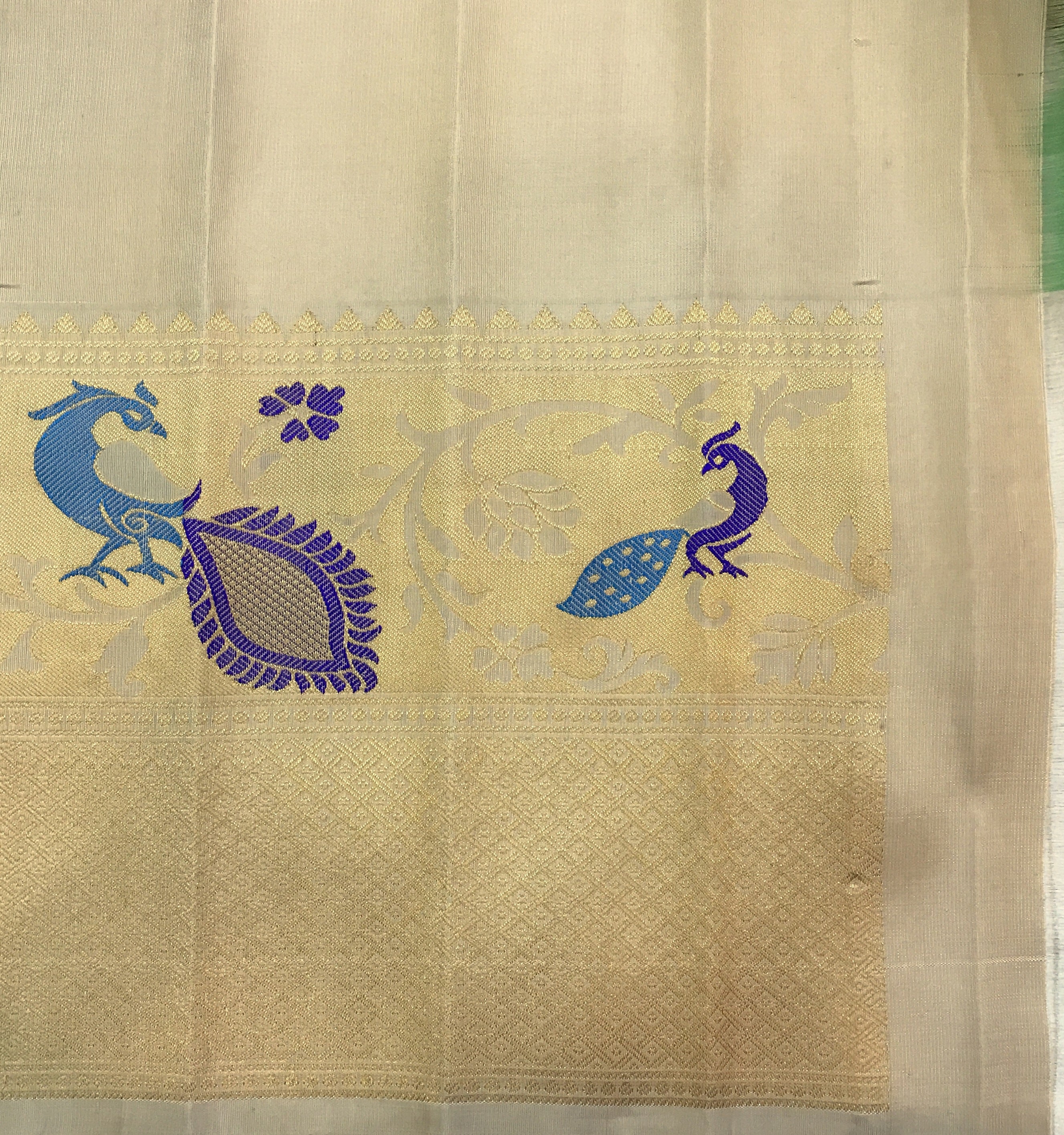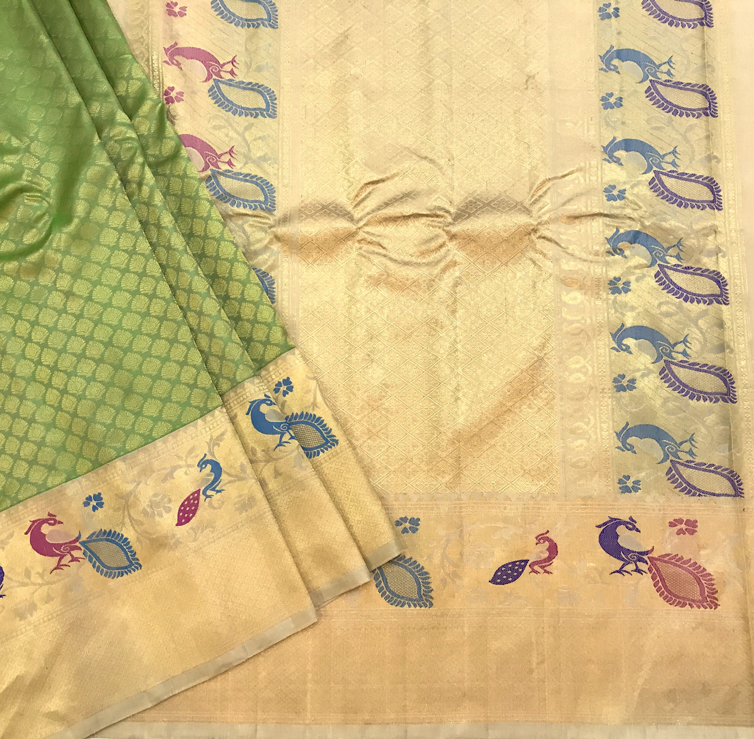 This is a pista-green coloured brocade Gadhwal saree. The golden brocade design is such that it gives an overall sheen effect to the saree making it seem like tissue! One of the most favorite combinations in pure silk- green with off-white ( beige )! The special intricate peacock design border and pallu creates a fascinating effect on this weave! A perfect pick to wear on any special occasion or festival.
