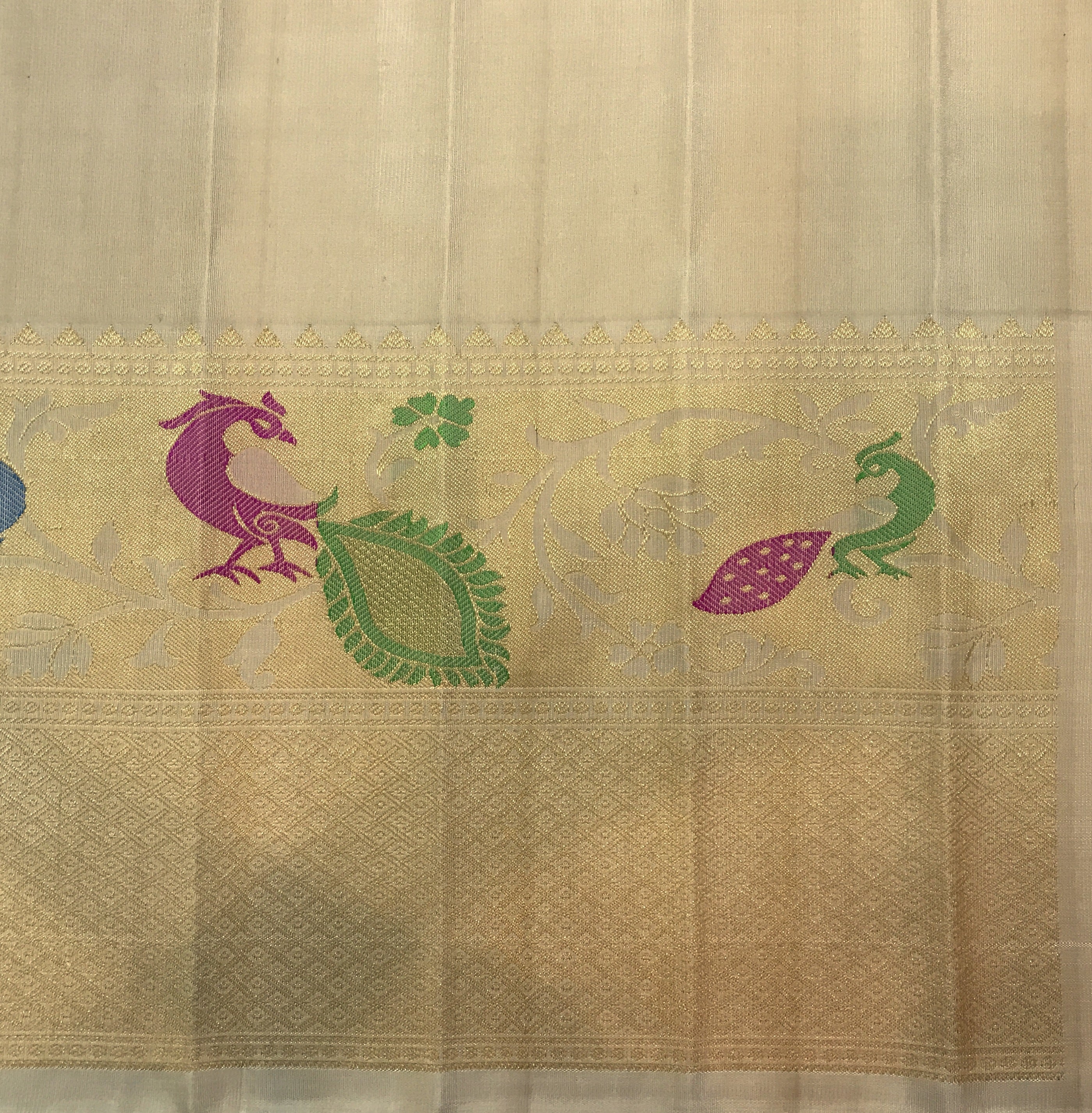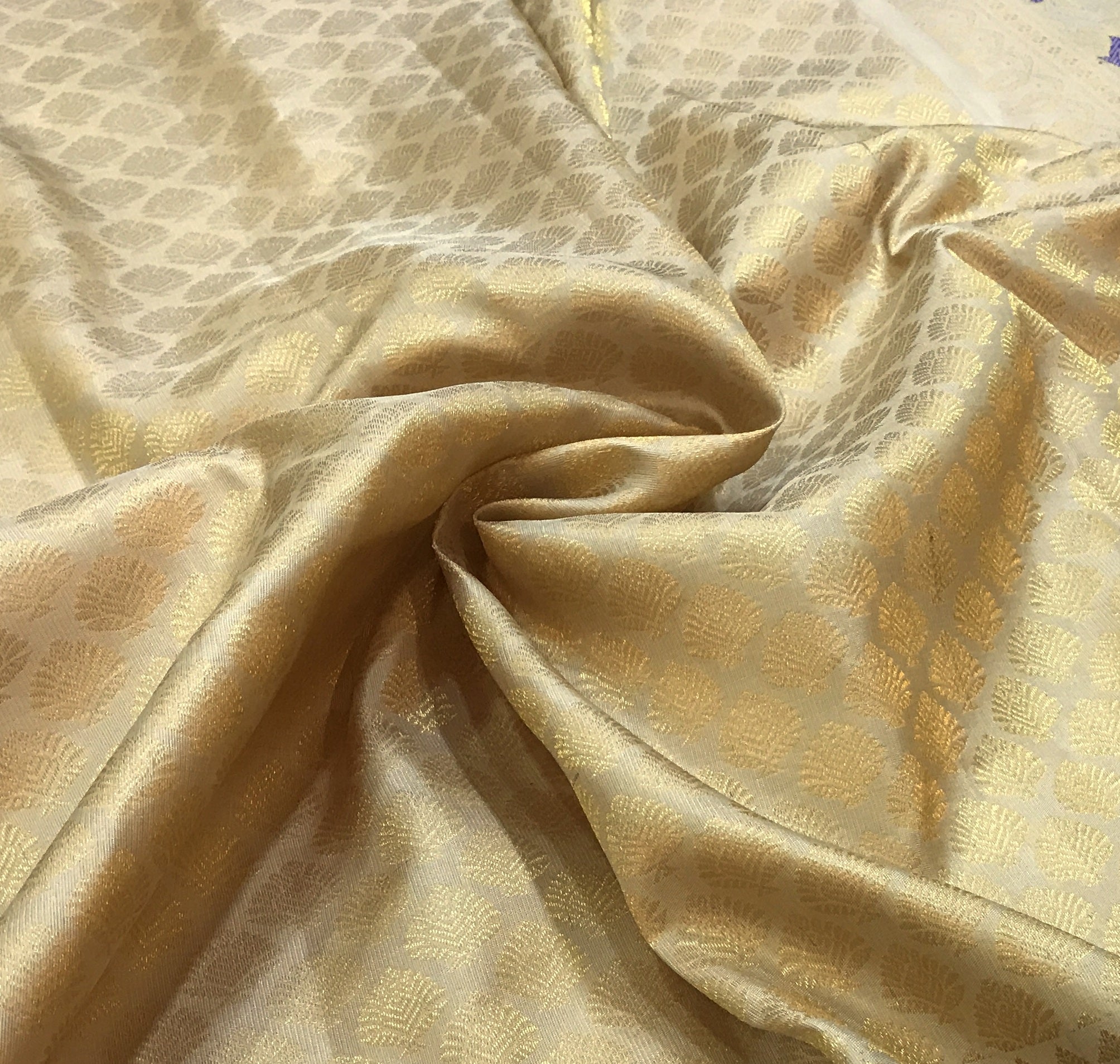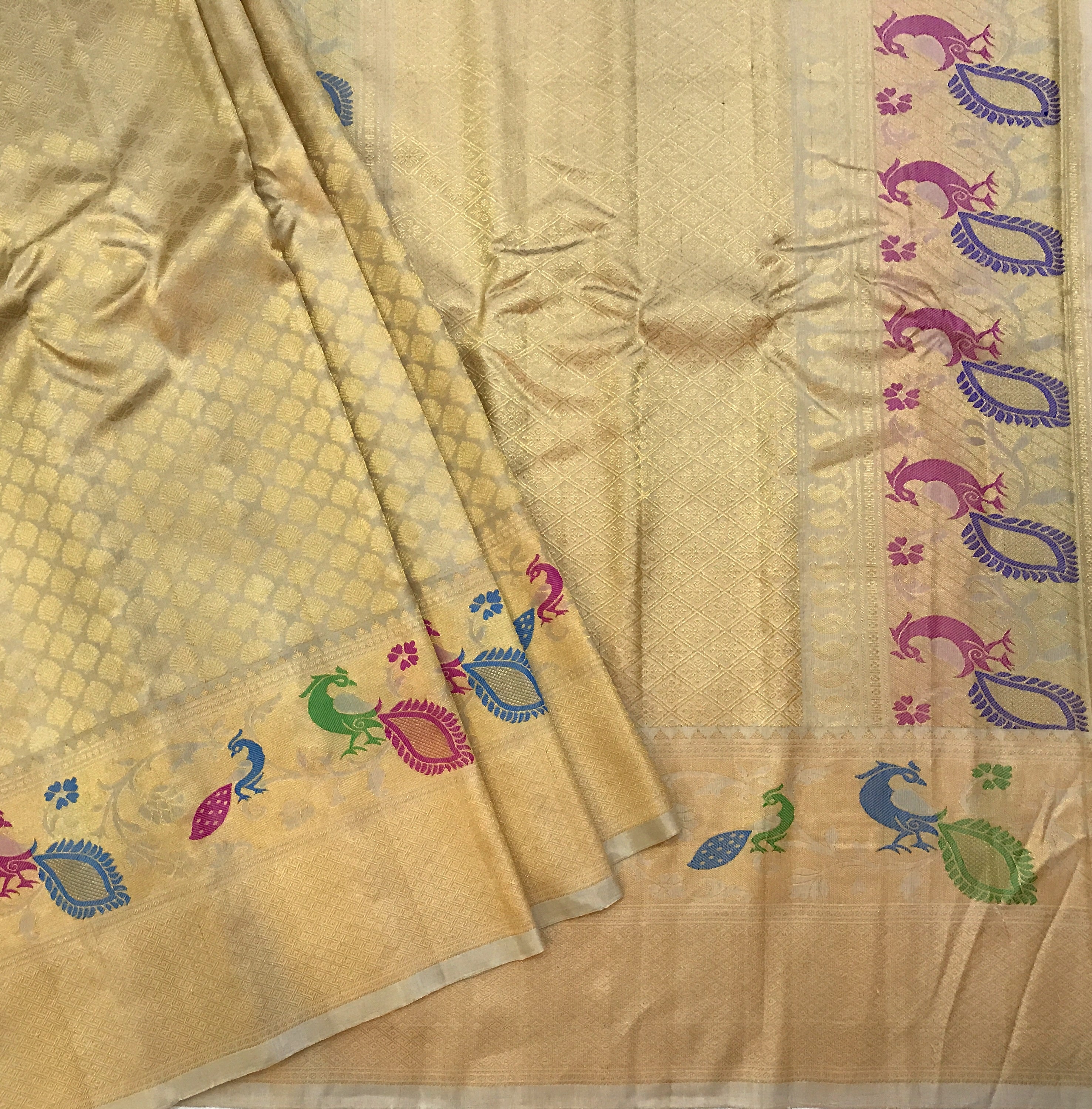 This is a beige coloured brocade Gadhwal saree. The golden brocade design is such that it gives an overall sheen effect to the saree making it seem like tissue! One of the most unique combinations in pure silk- beige with self coloured border! The special intricate peacock design border and pallu creates a fascinating effect on this weave! A perfect pick to wear on any special occasion or festival.