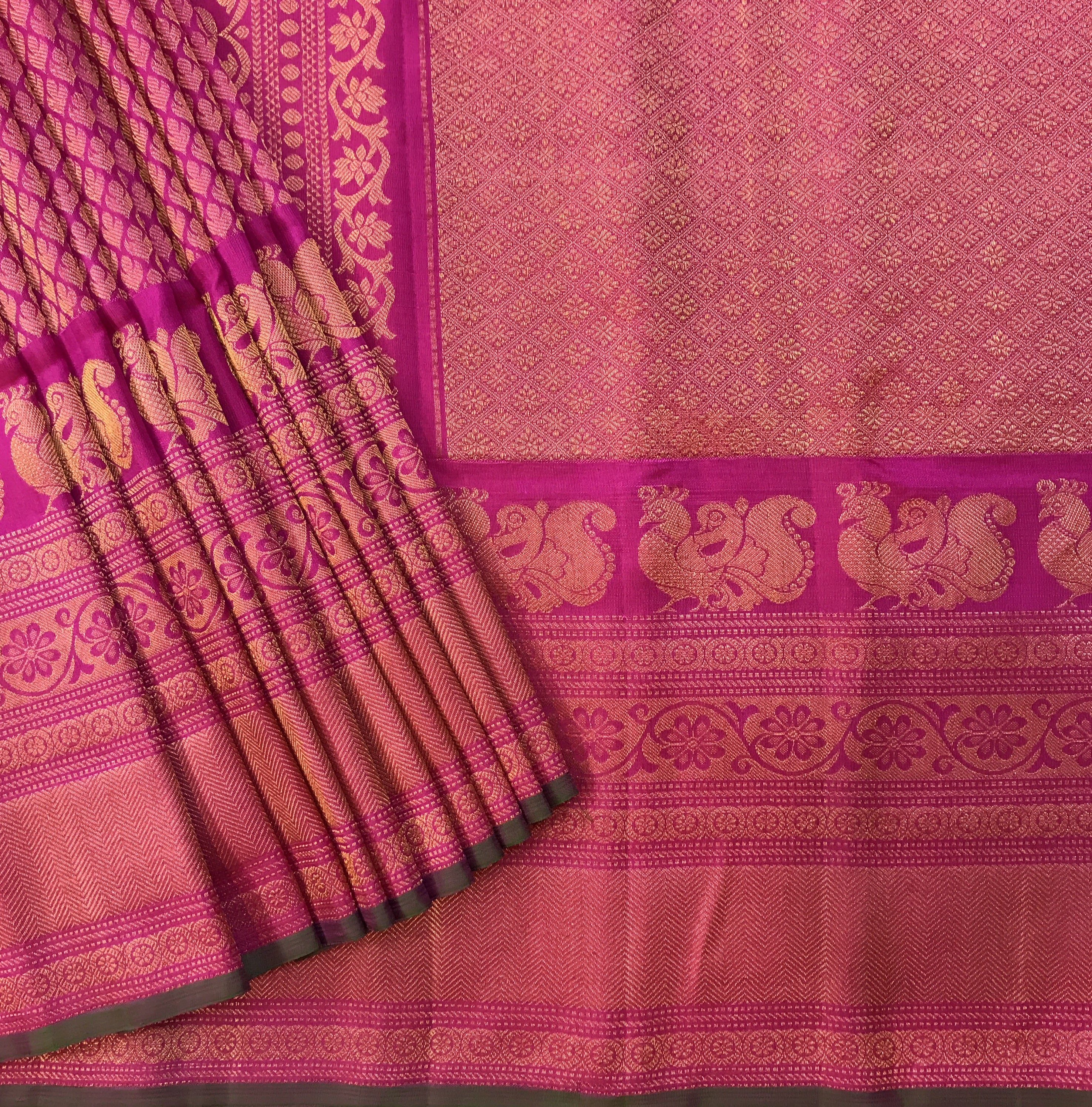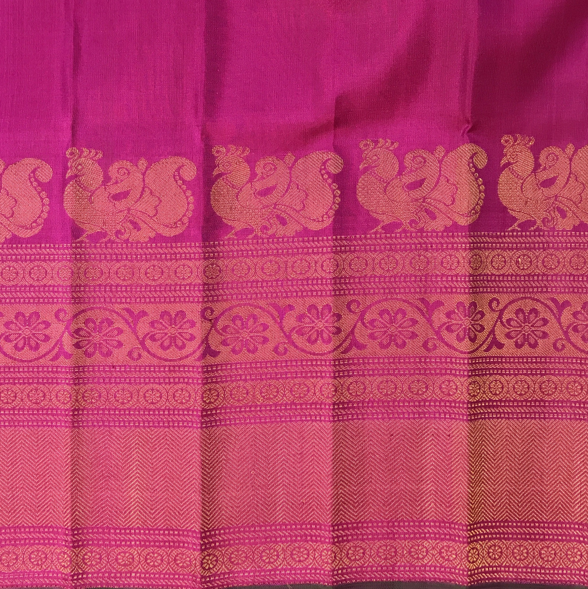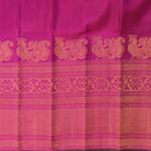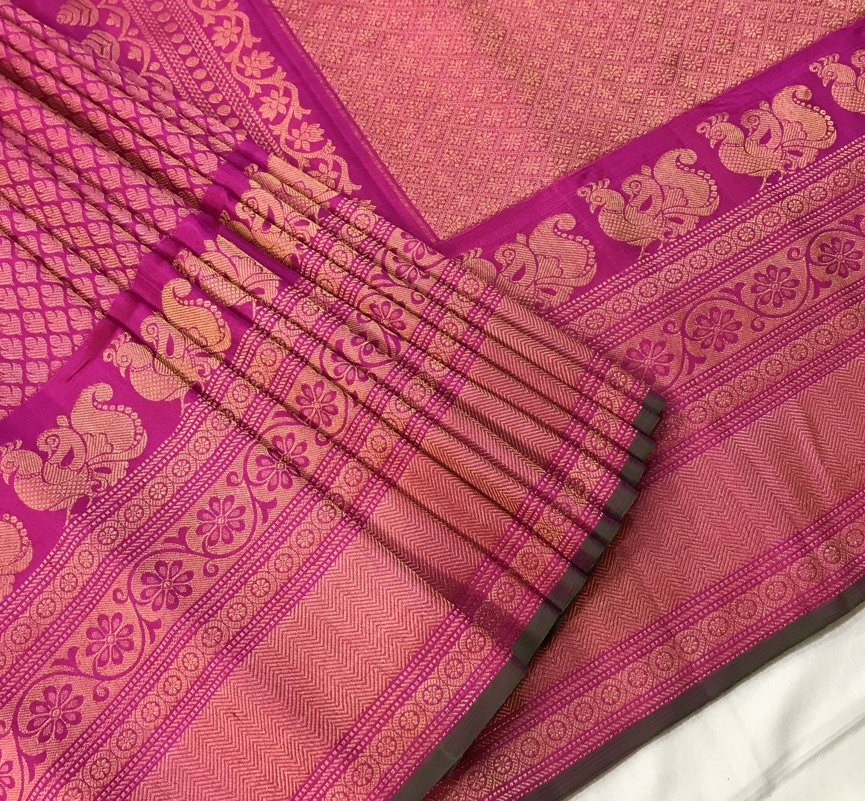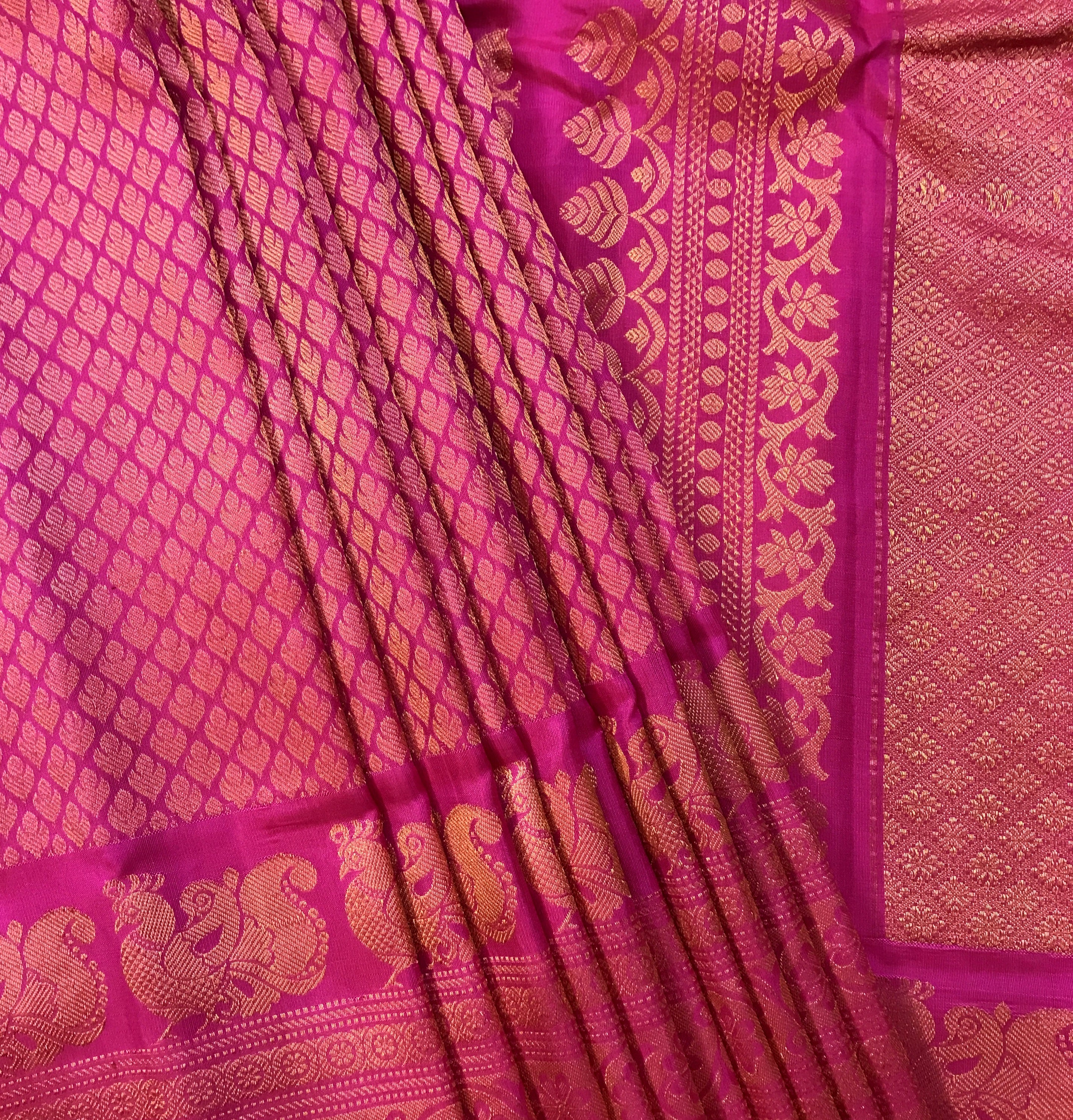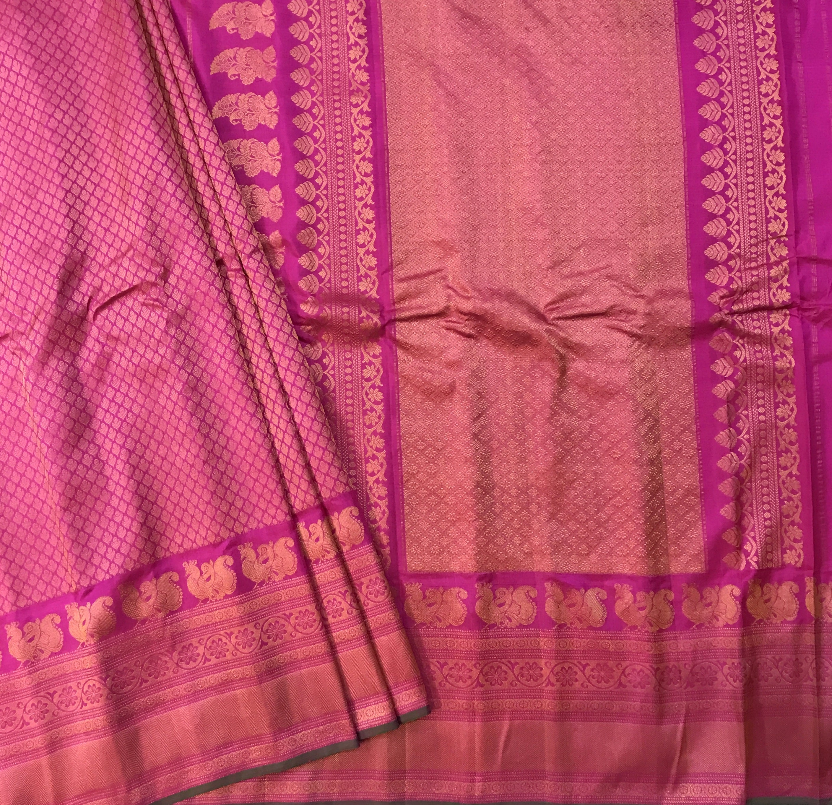 This superb combination in pink Gadhwal with a beautifully golden zari in its border and zari pallu is the perfect festive saree for your special occasion. The intricacy of the brocade work ( floral design ) design and the richly woven pallu make this saree special. The intricate design border represents the traditional Gadhwal style of weaving borders.