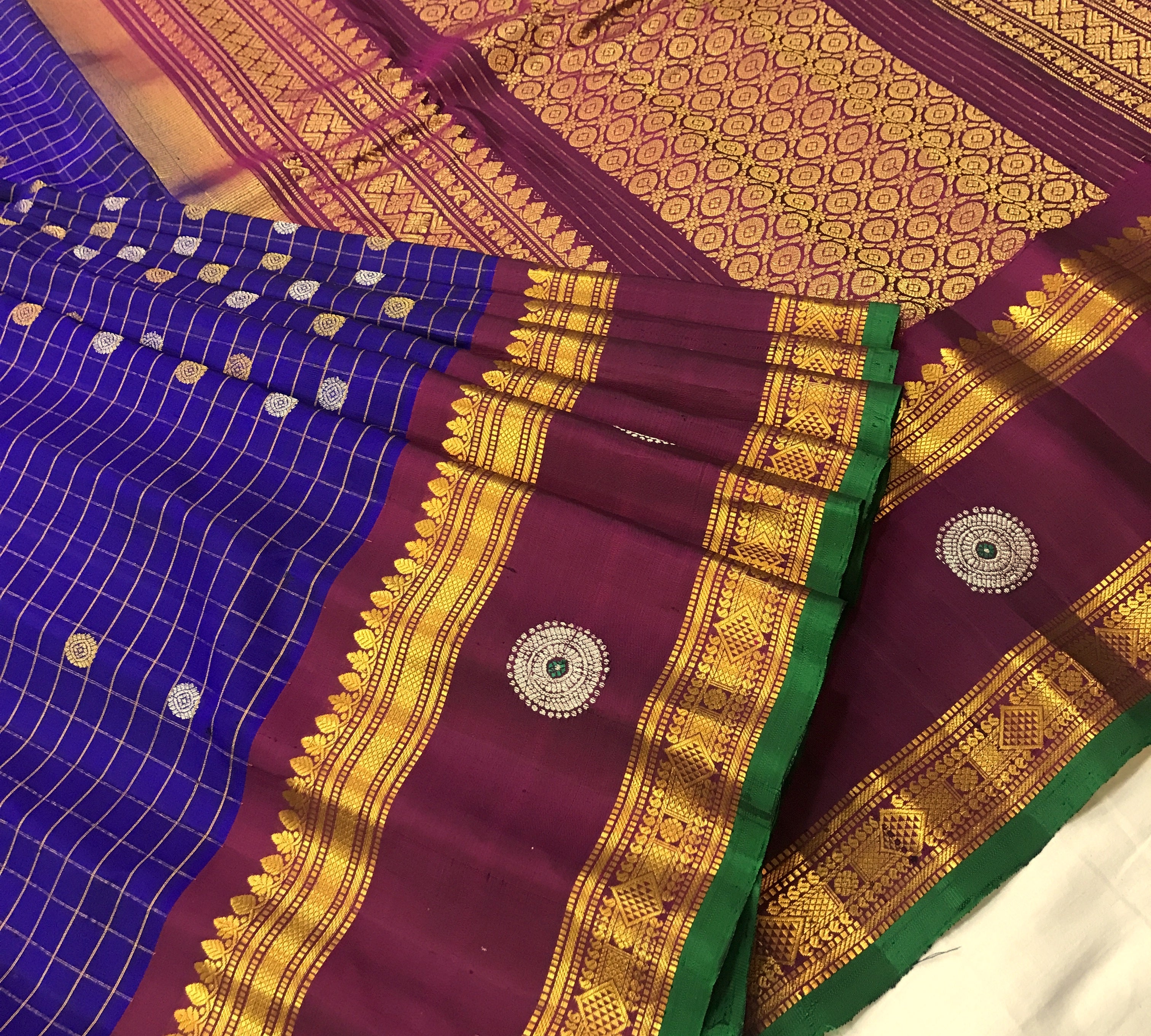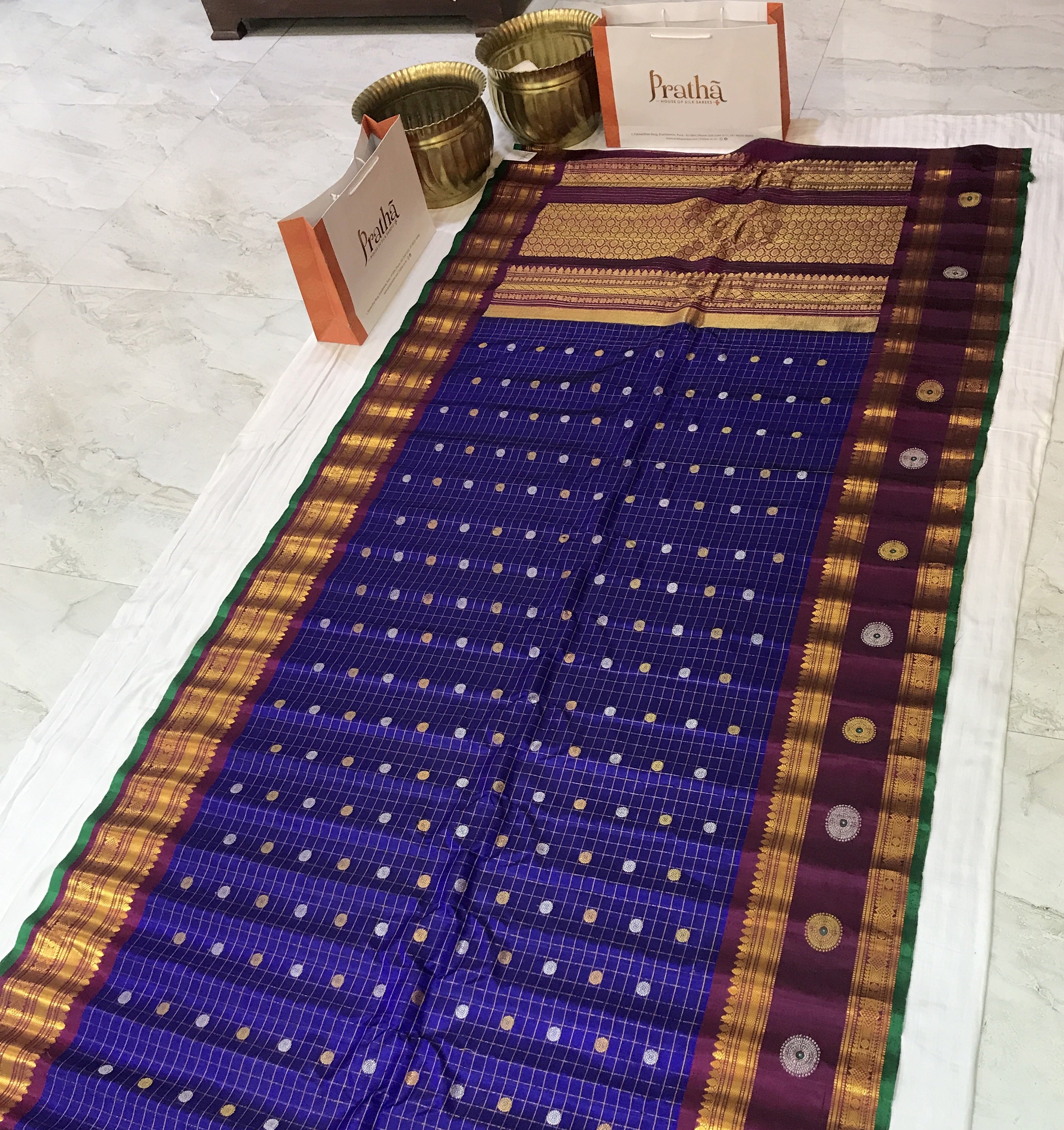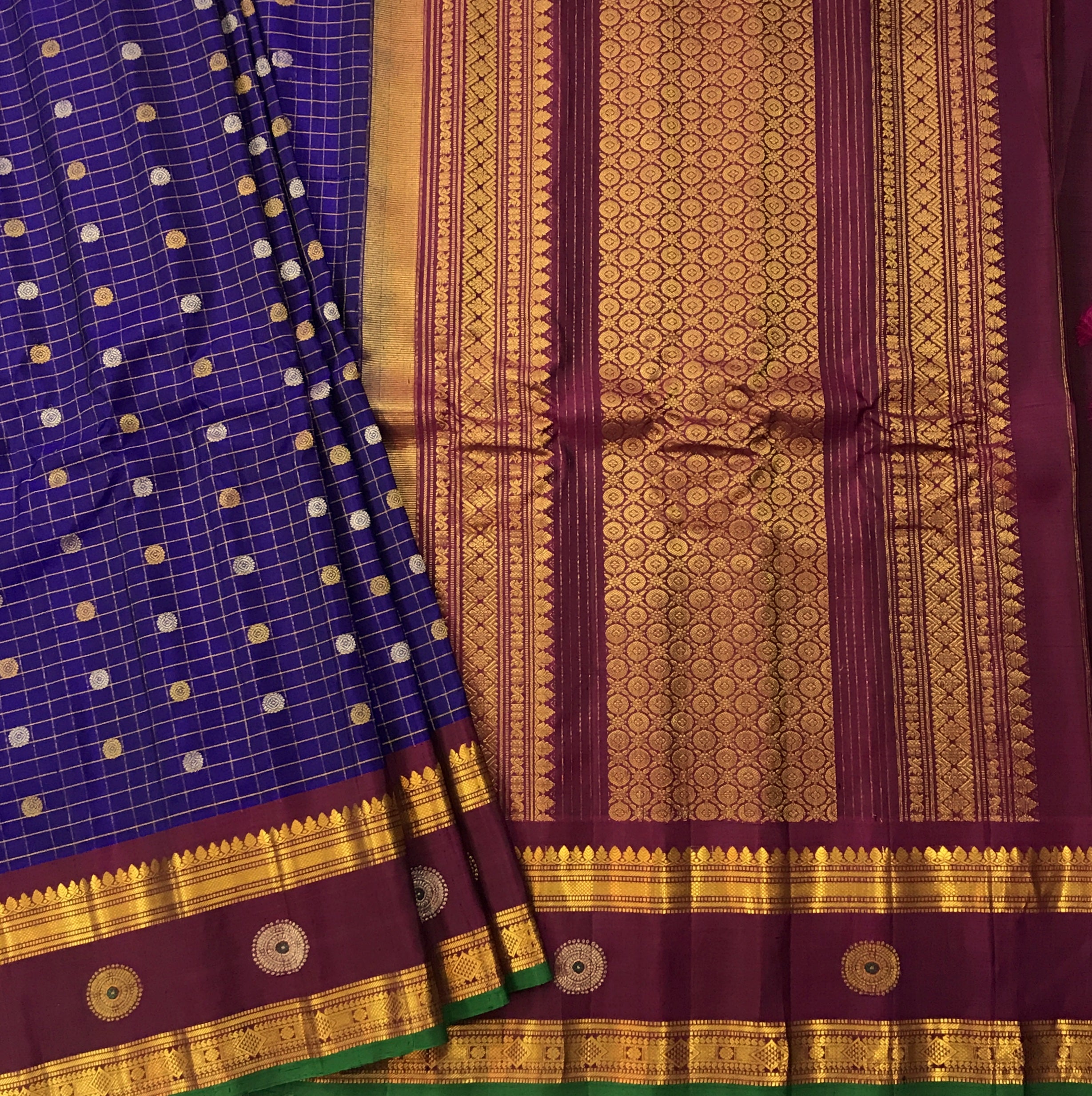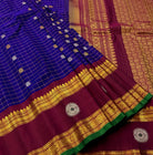 This saree beautifully blends tradition with vibrant elegance! The royal blue body features neat check patterns highlighted with golden and silver butti, giving it a lively and refined look. The contrasting maroon border with circles, adorned with grand golden zari and striking circular motifs, adds richness and festive appeal. The pallu stands out with its intricately woven zari brocade, showcasing classic craftsmanship and making the saree perfect for special occasions.