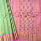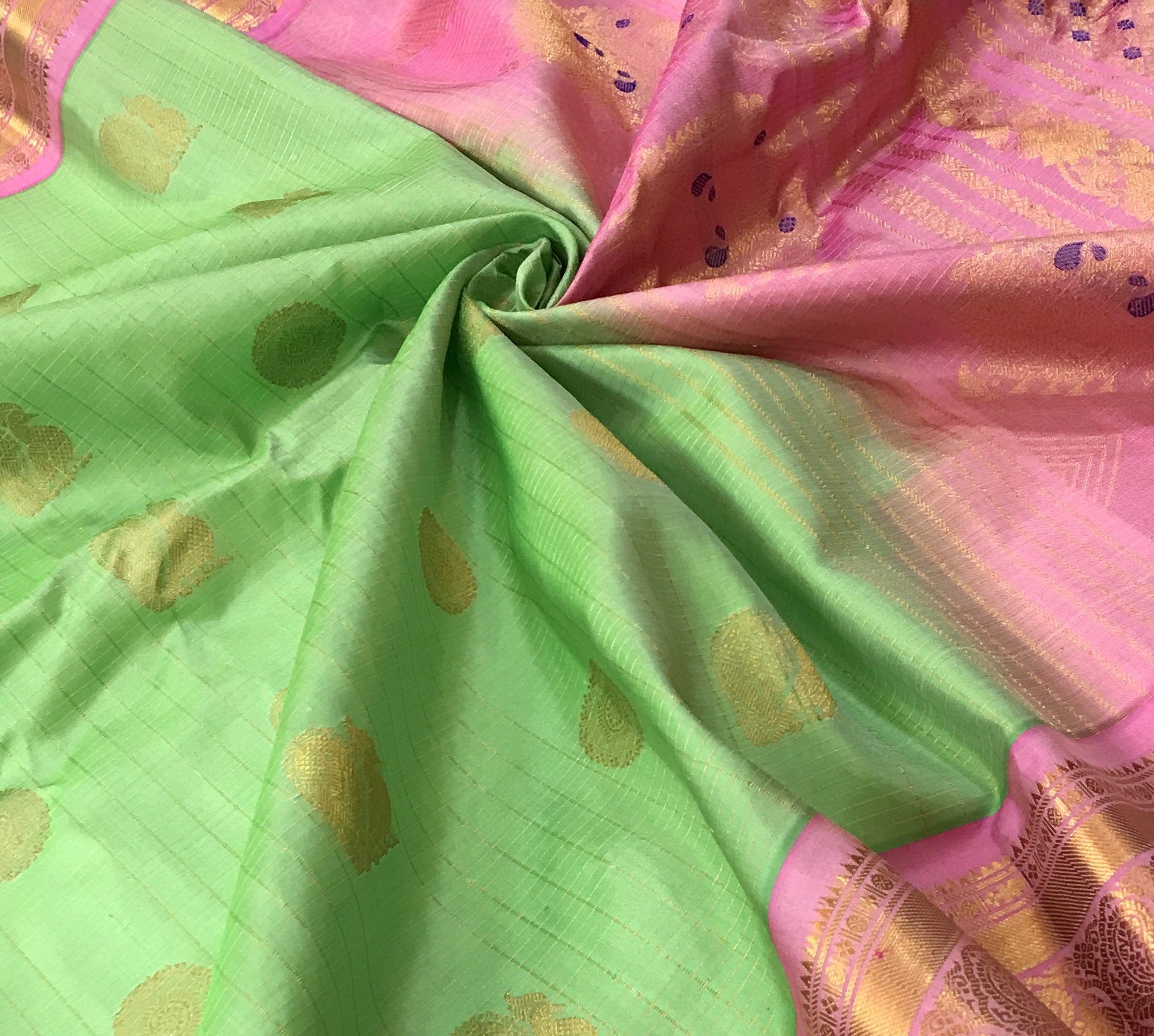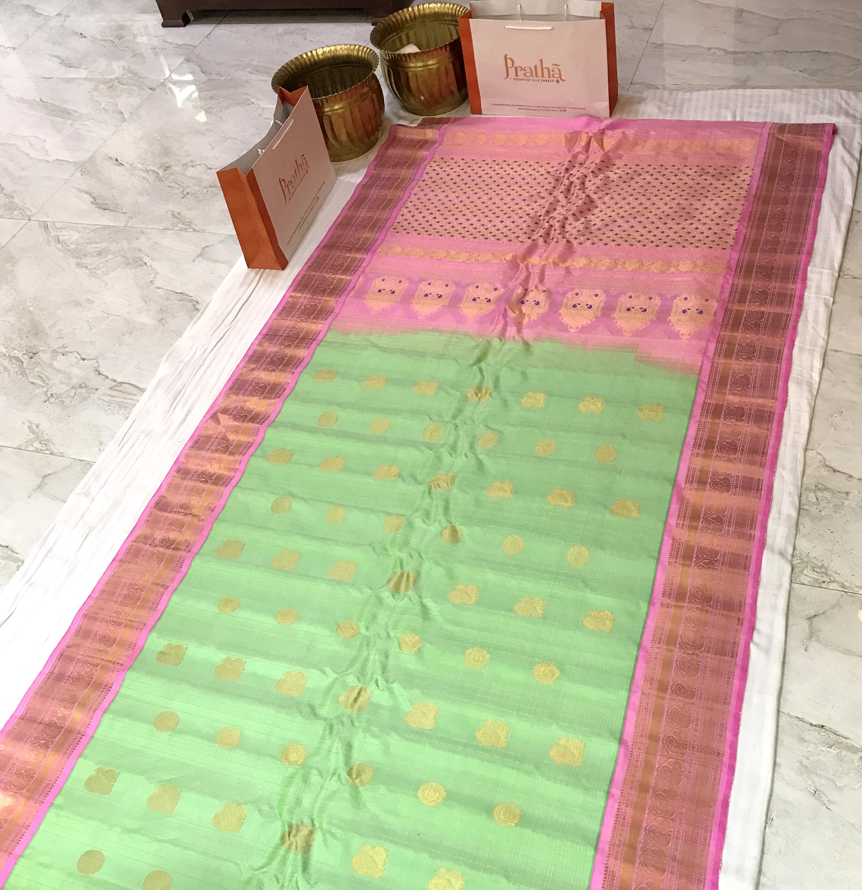 This is a beautiful combination and a unique one too! Pista green Checks Gadhwal with a pink border and pallu. The traditional style woven border stand beautifully against the pista saree! The delicate checks design with butti design of this saree is equally outstanding in forms of alternet floral and peacock in golden zari look fantastic . For those who are on the lookout for something different, this one is just for you!