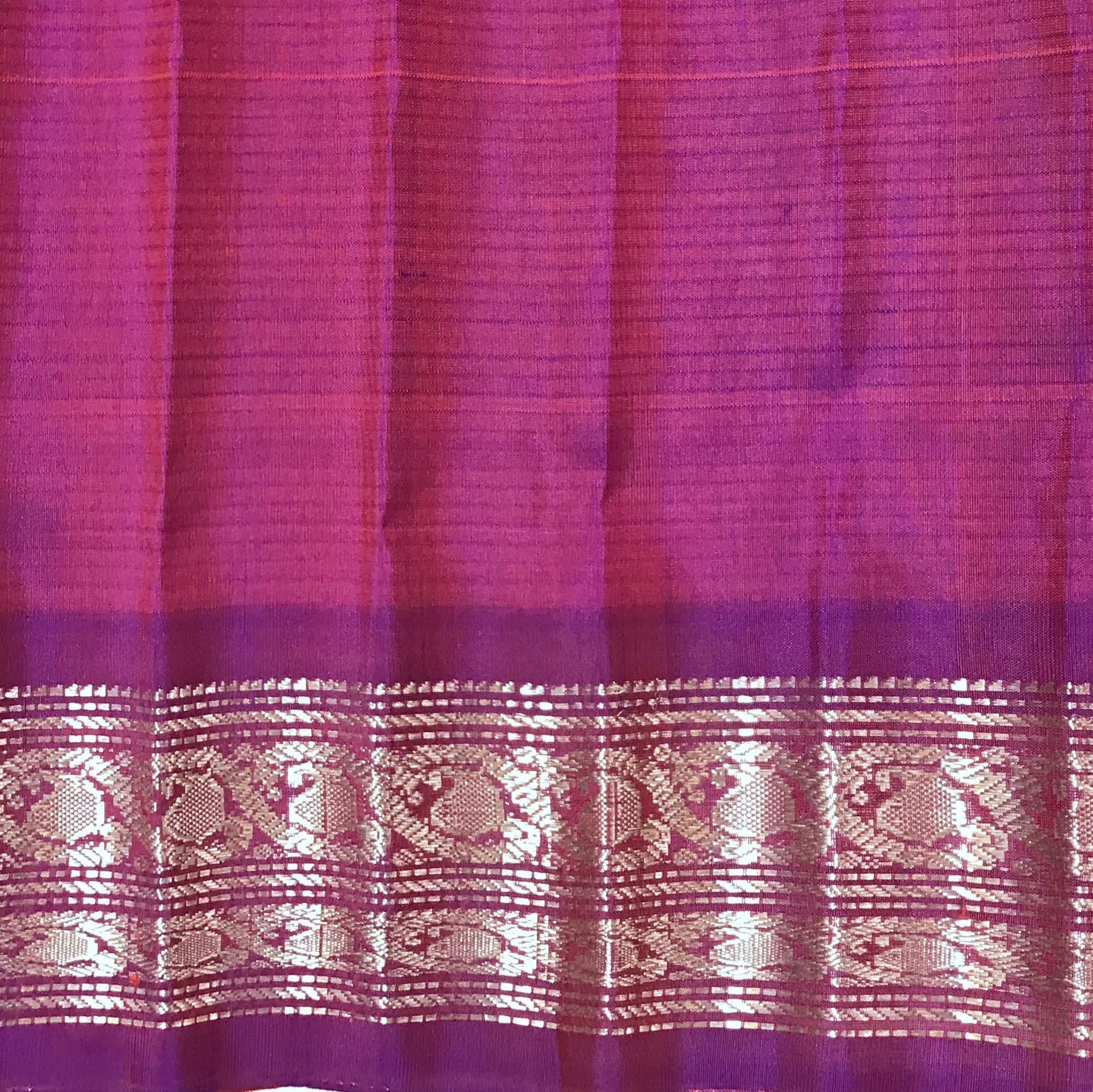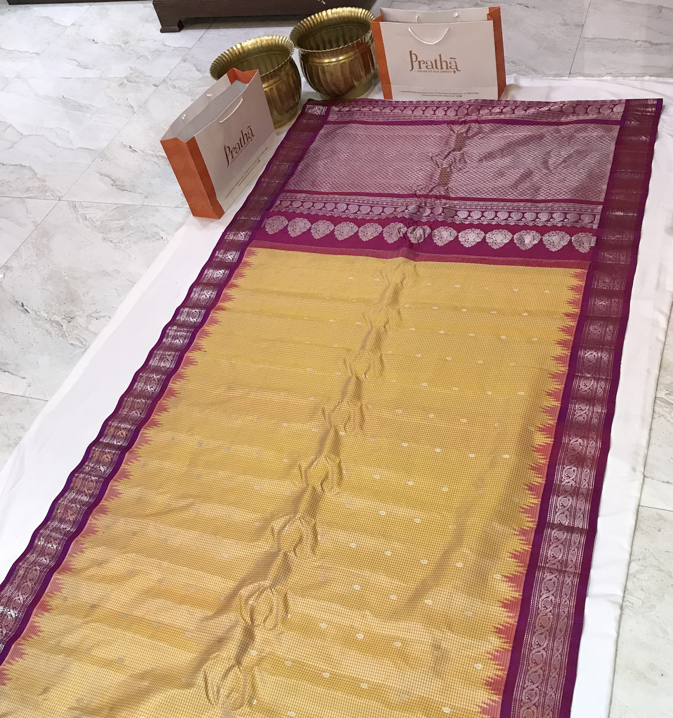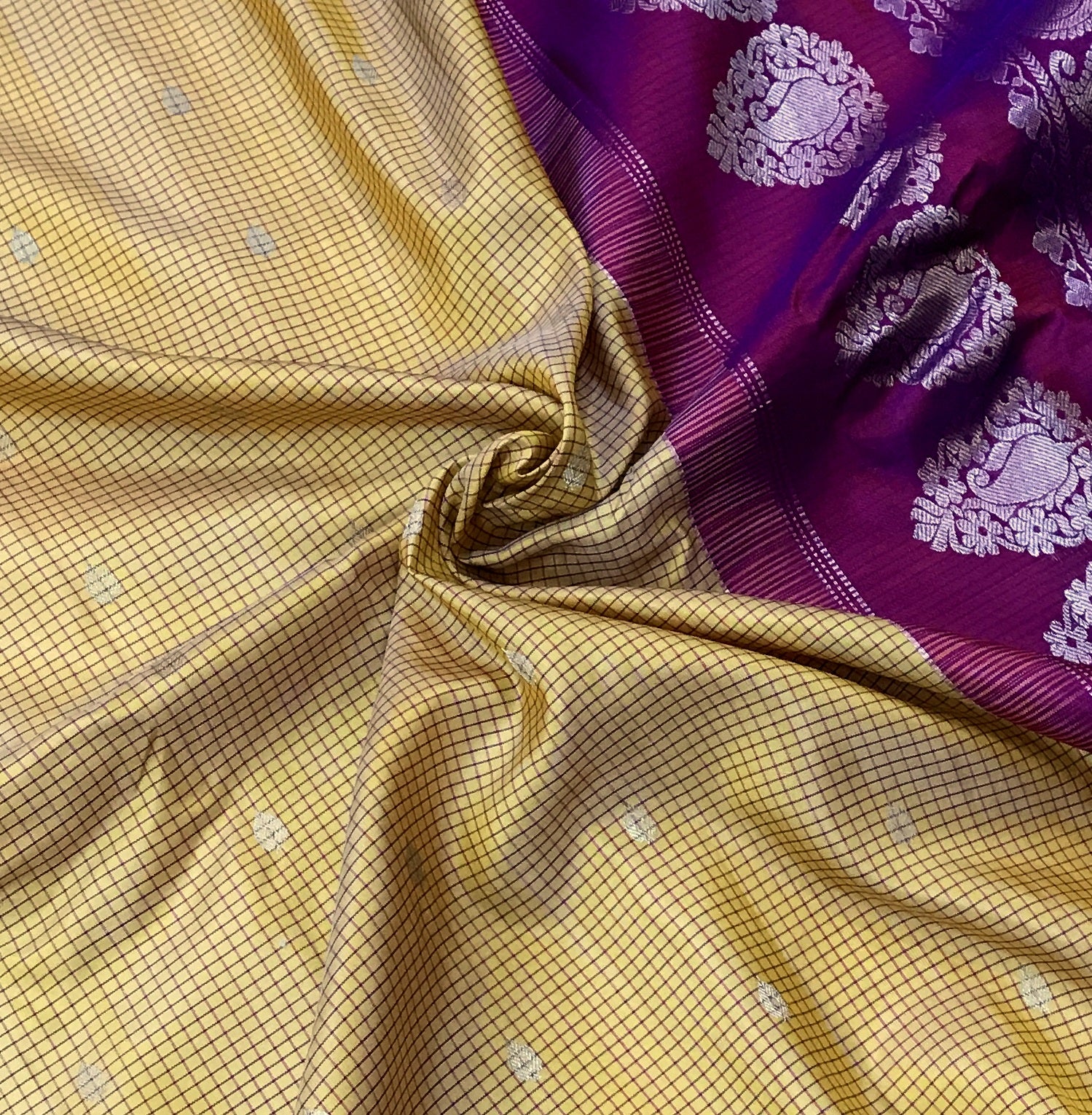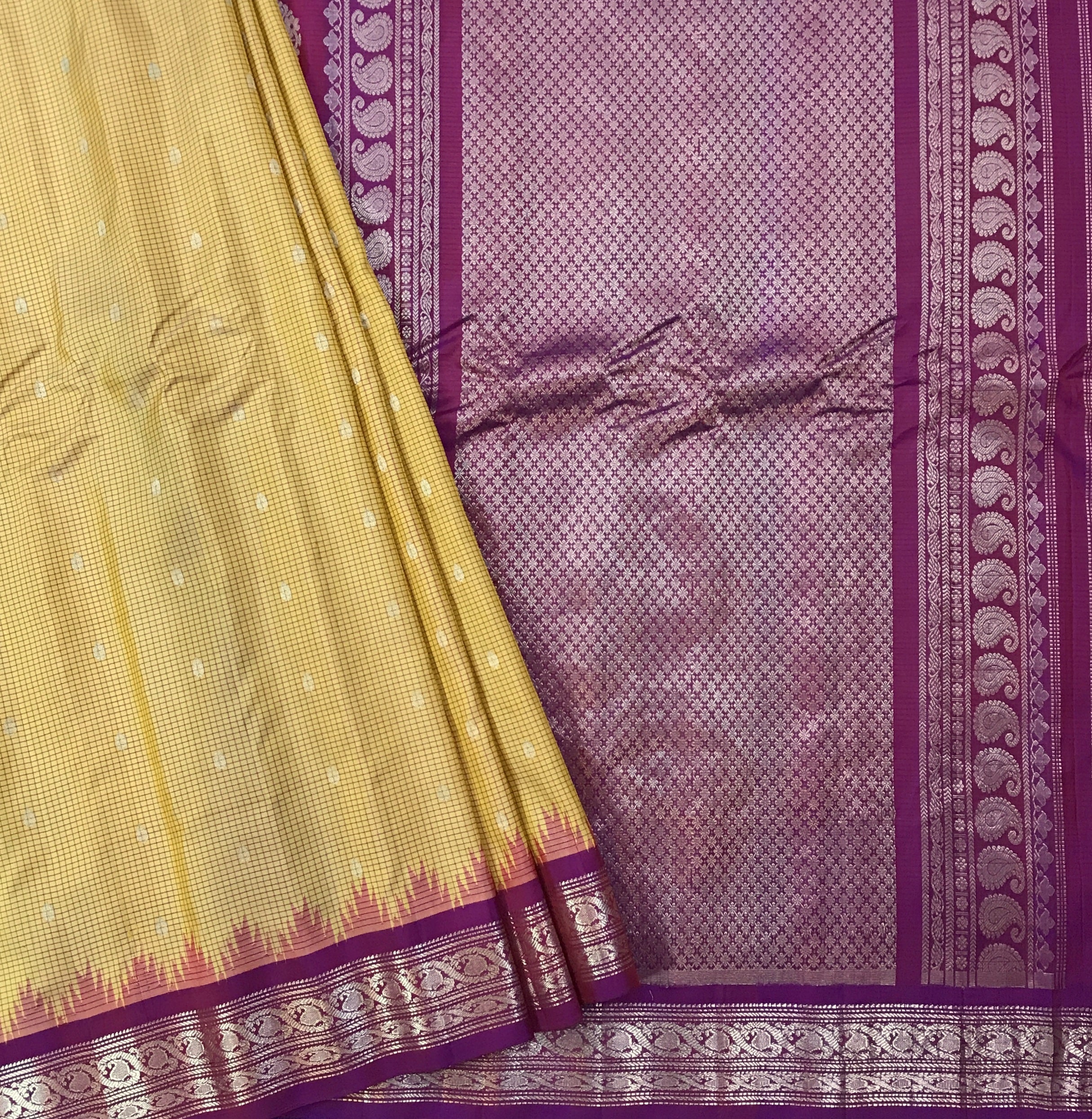 This is a beautiful combination and a unique one too! Fresh yellow Checks Gadhwal with a dark magenta border and pallu. The traditional style woven border stand beautifully against the yellow saree! The delicate checks patterms with butti design of this saree is equally outstanding in forms of floral in silk and zari thread look fantastic . For those who are on the lookout for something different, this one is just for you!