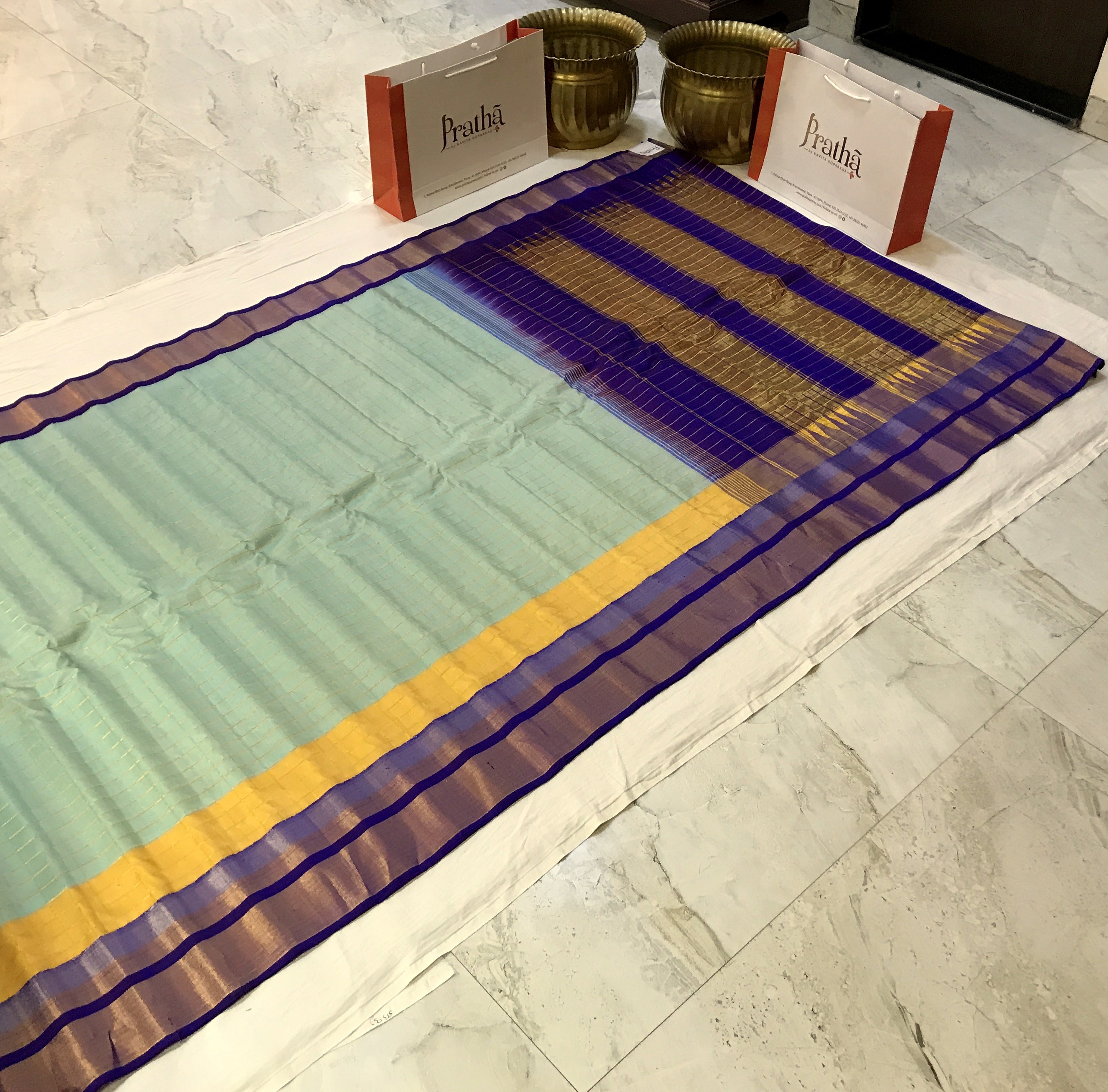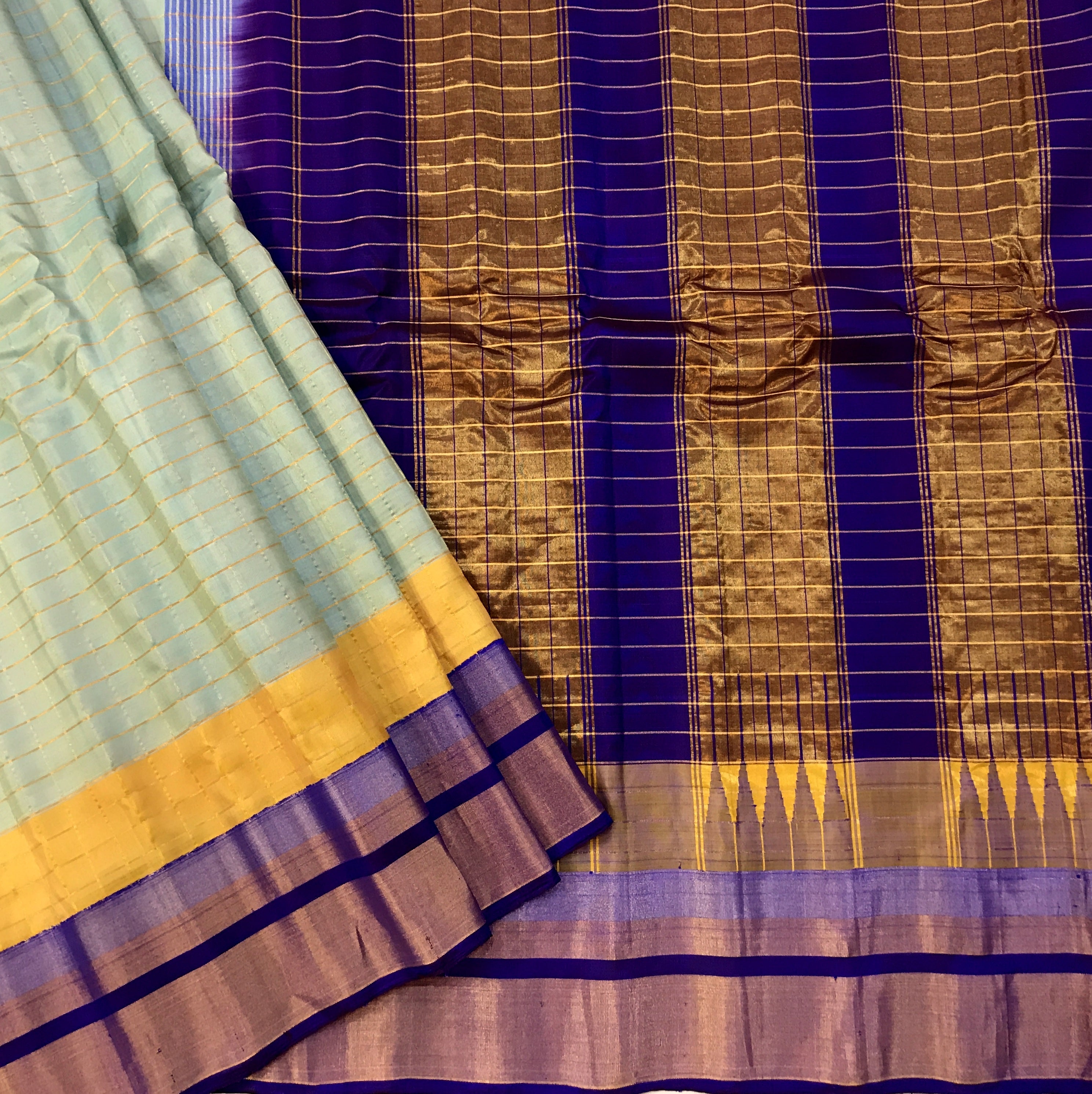 A very pretty and uncommon shade of pista-green pure silk Checks Gadhwal looks beautiful in day light as well as night time. This one is special weave, as it has different types of triple border as well as its delicate zari checks pattern. This pattern of check is particularly special for it 'small checks' design. The plain zari border and the traditional pallu complement beautifully with this saree. This kind of saree will look great on a bride or on any of your special days!