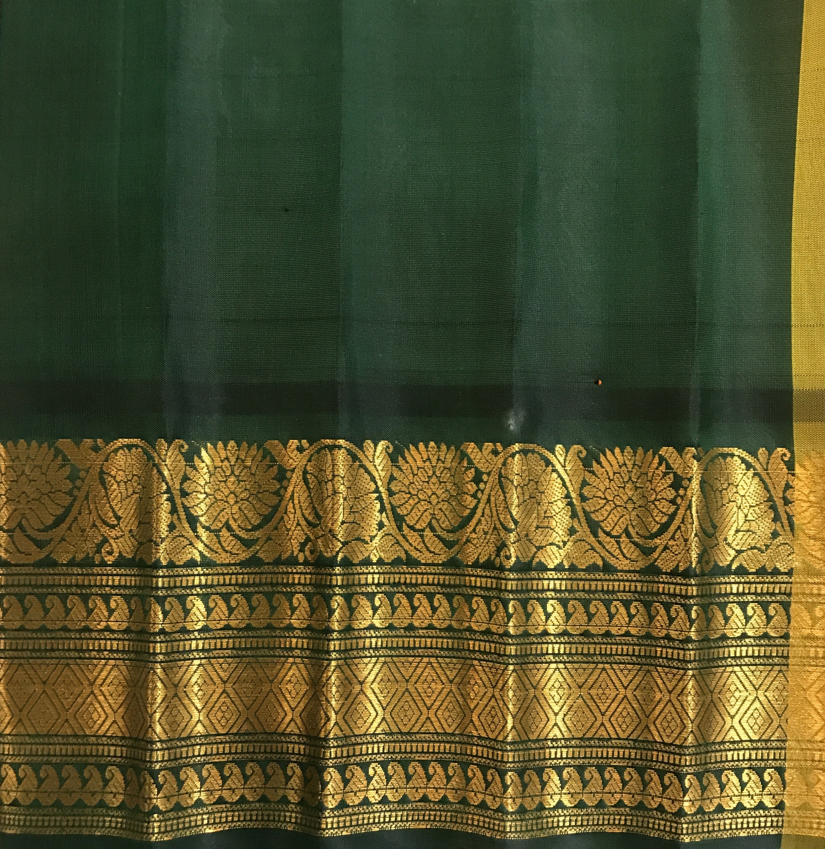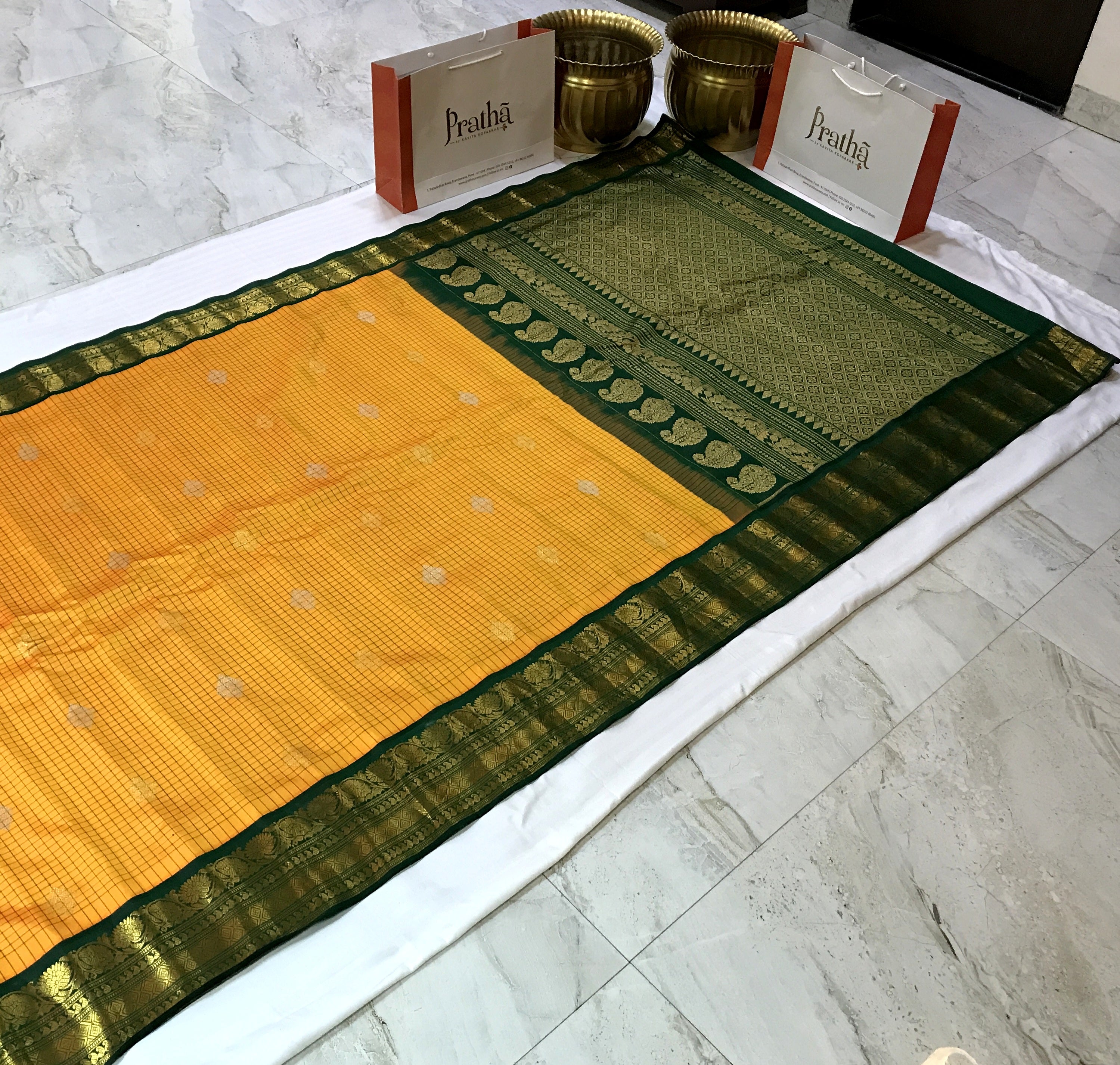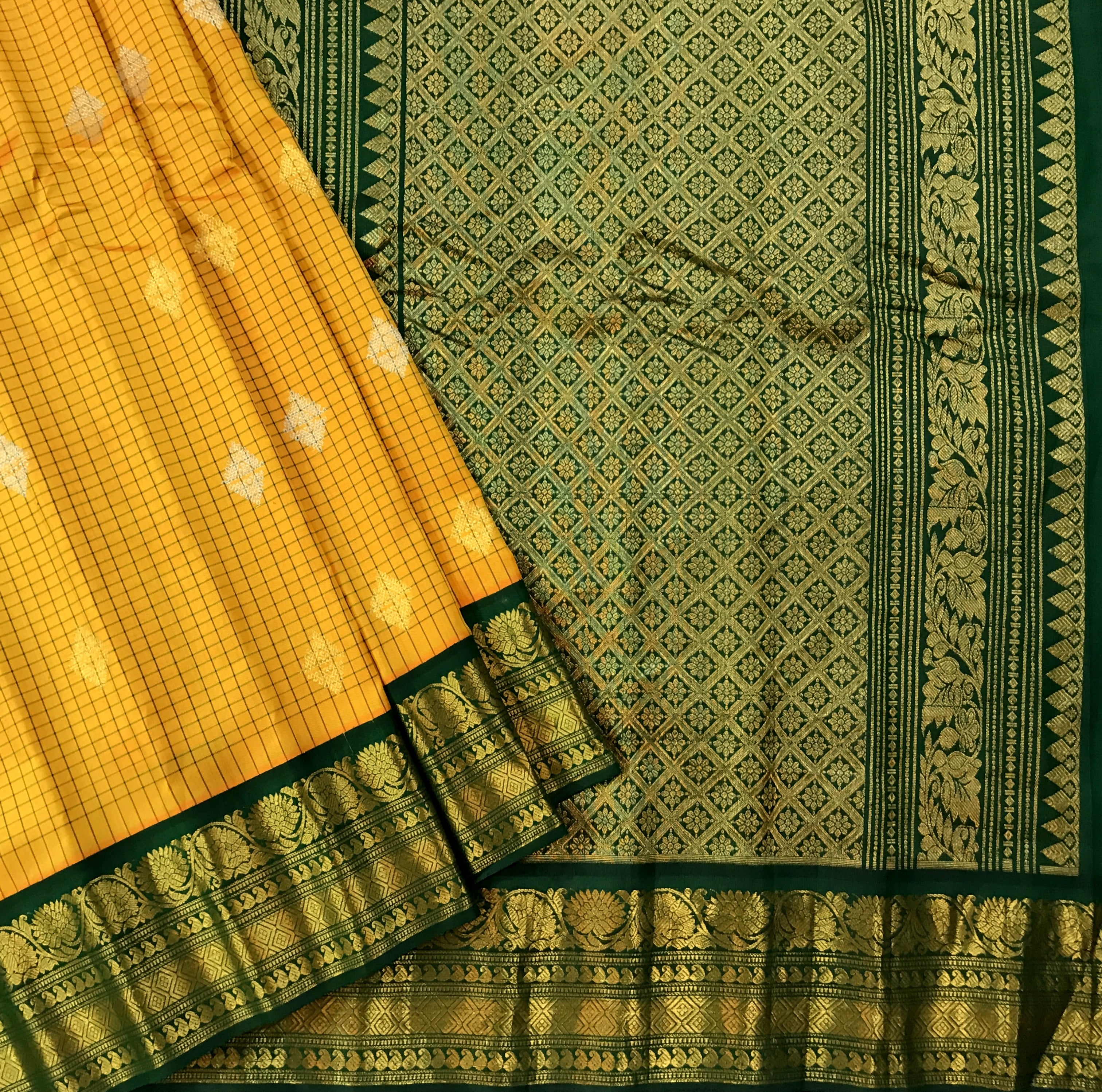 The classic combination of mango-orange and emerald green pure silk Gadhwal looks fabulous with its checks pattern woven in green silk thread as well as the big diamond shaped butti woven in golden-silver zari. This pattern of checks is particularly special for its 'small checks' design. This checks design with the golden zari pallu complement beautifully with this saree.