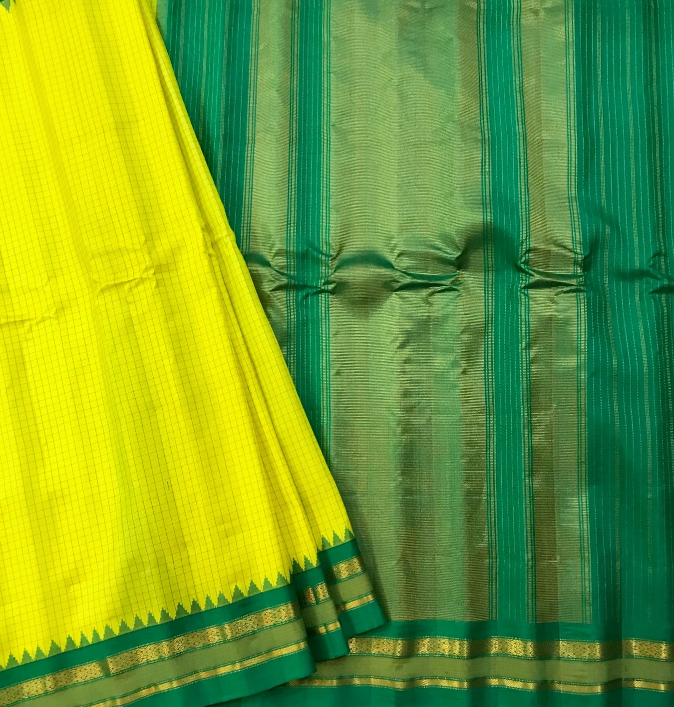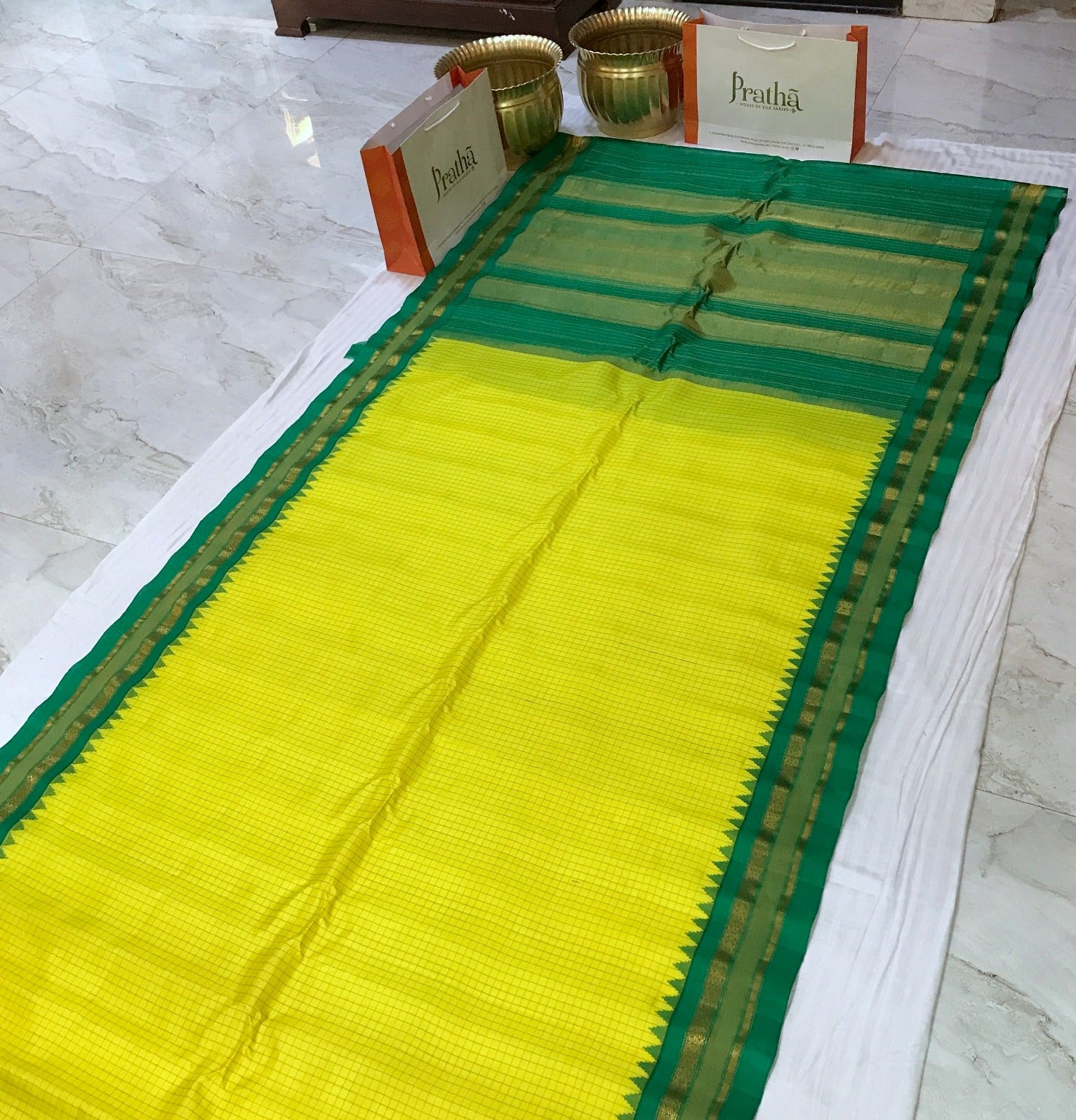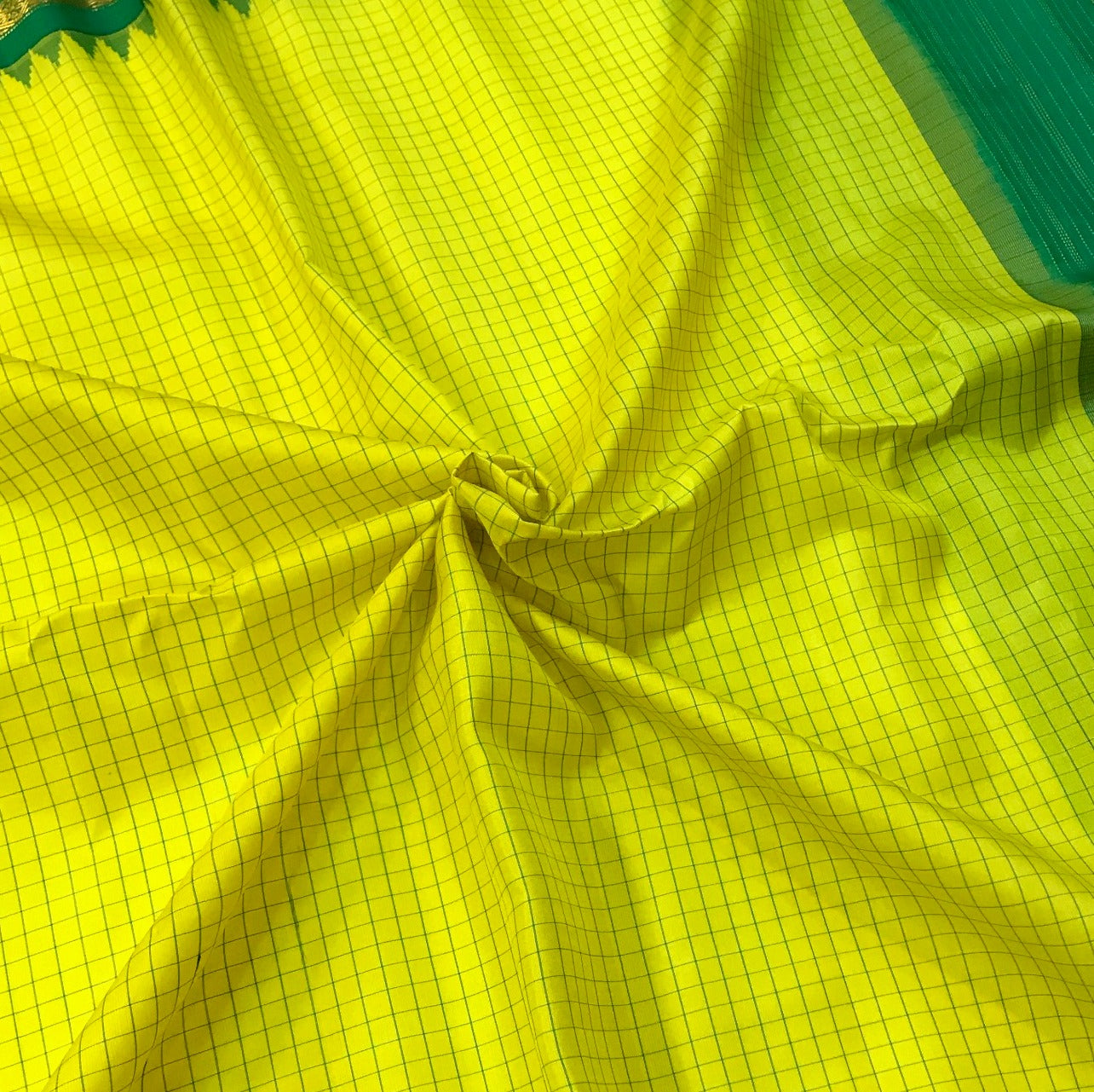 This Yellow Gadwal saree with checks showcases traditional charm with its crisp checked design on a soft silk blend. Enhanced by shimmering zari borders and paired with a bold contrast blouse and border, it’s ideal for adding a touch of refined beauty to any occasion. . For those who are on the lookout for something different, this one is just for you!