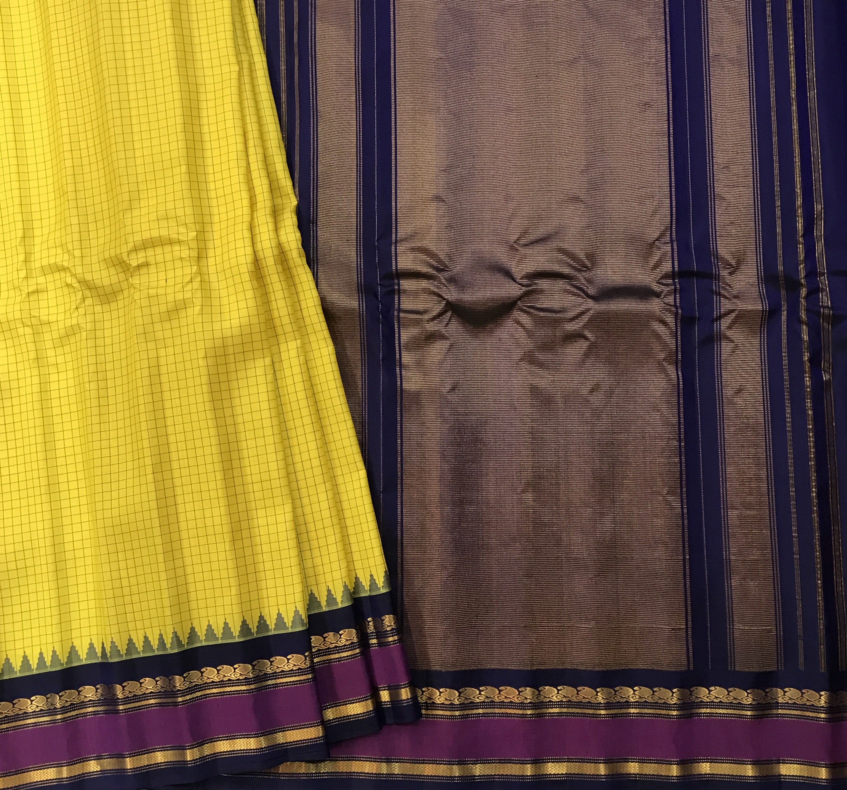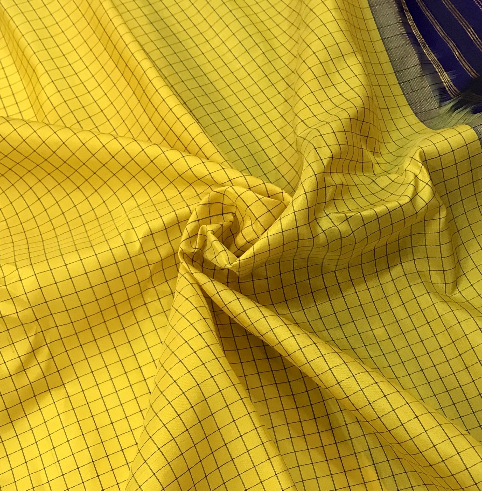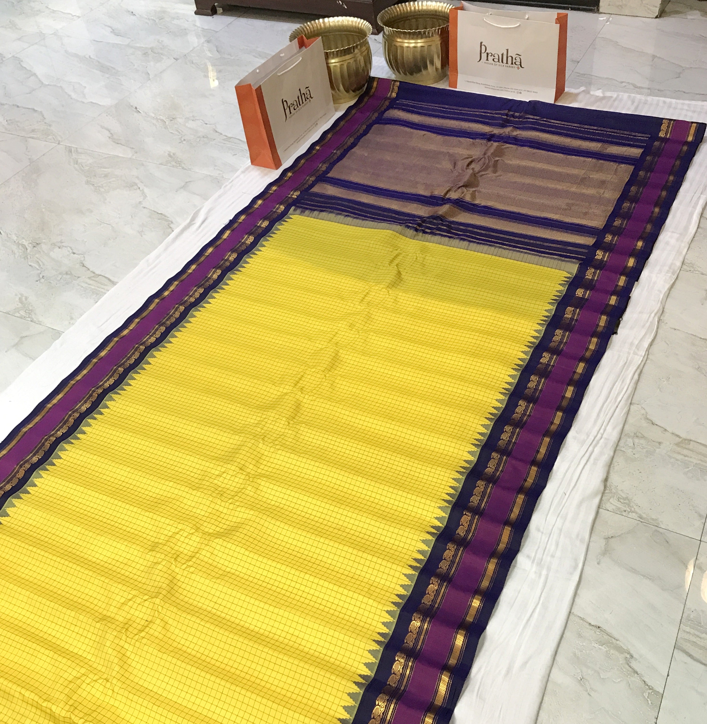 This Yellow Gadwal saree with checks showcases traditional charm with its crisp checked design on a soft silk blend. Enhanced by shimmering temple design zari borders and paired with a bold contrast blouse and border, it’s ideal for adding a touch of refined beauty to any occasion. . For those who are on the lookout for something different, this one is just for you!