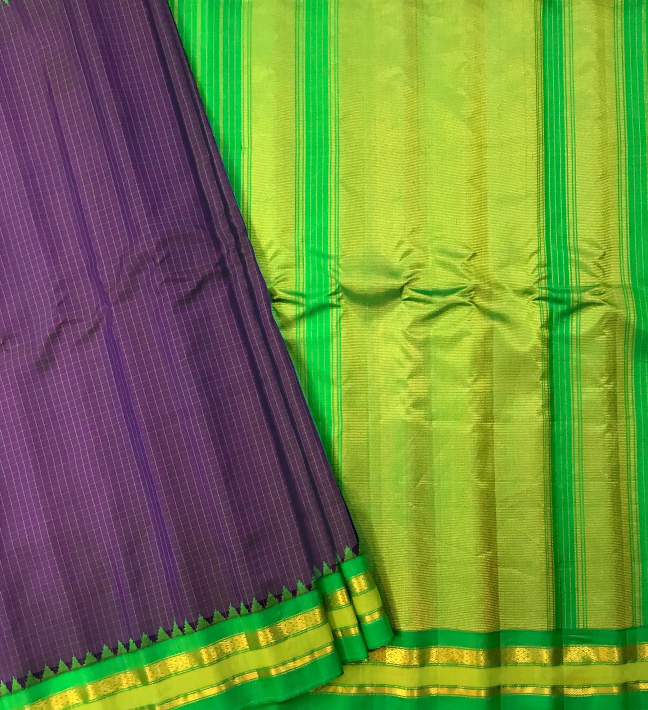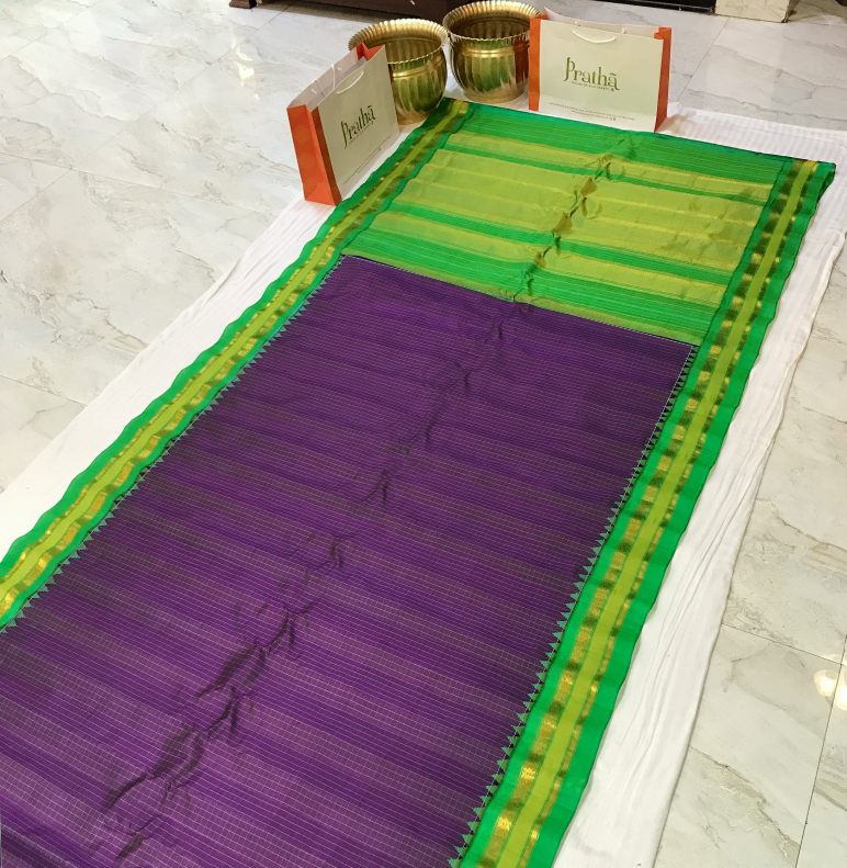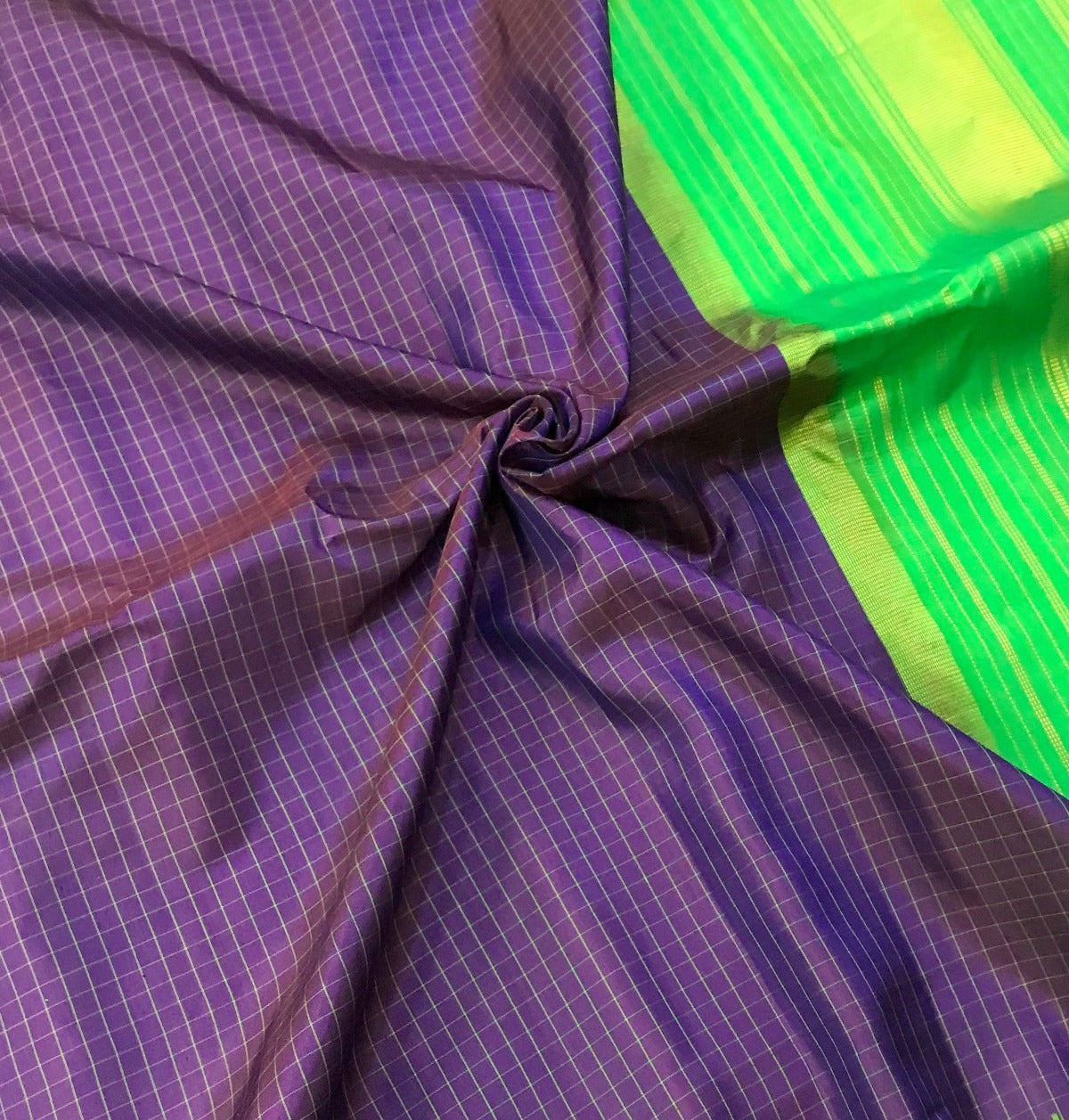 The Purple Gadwal saree with checks showcases traditional charm with its crisp checked design on a soft silk blend. Enhanced by shimmering zari borders and paired with a bold contrast blouse and contrast border, it’s ideal for adding a touch of refined beauty to any occasion. For those who are on the lookout for something different, this one is just for you!