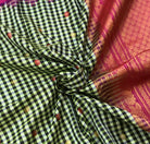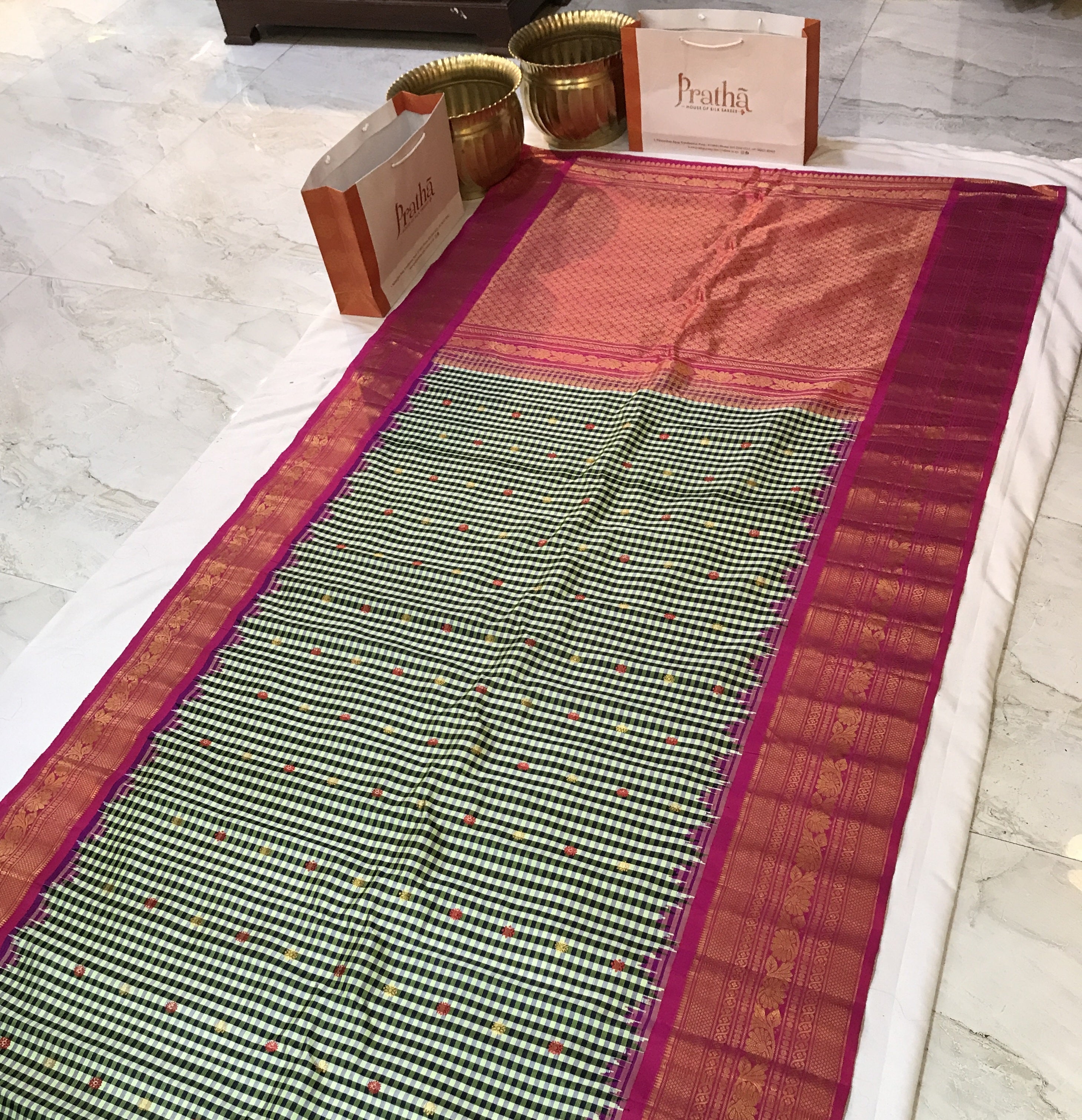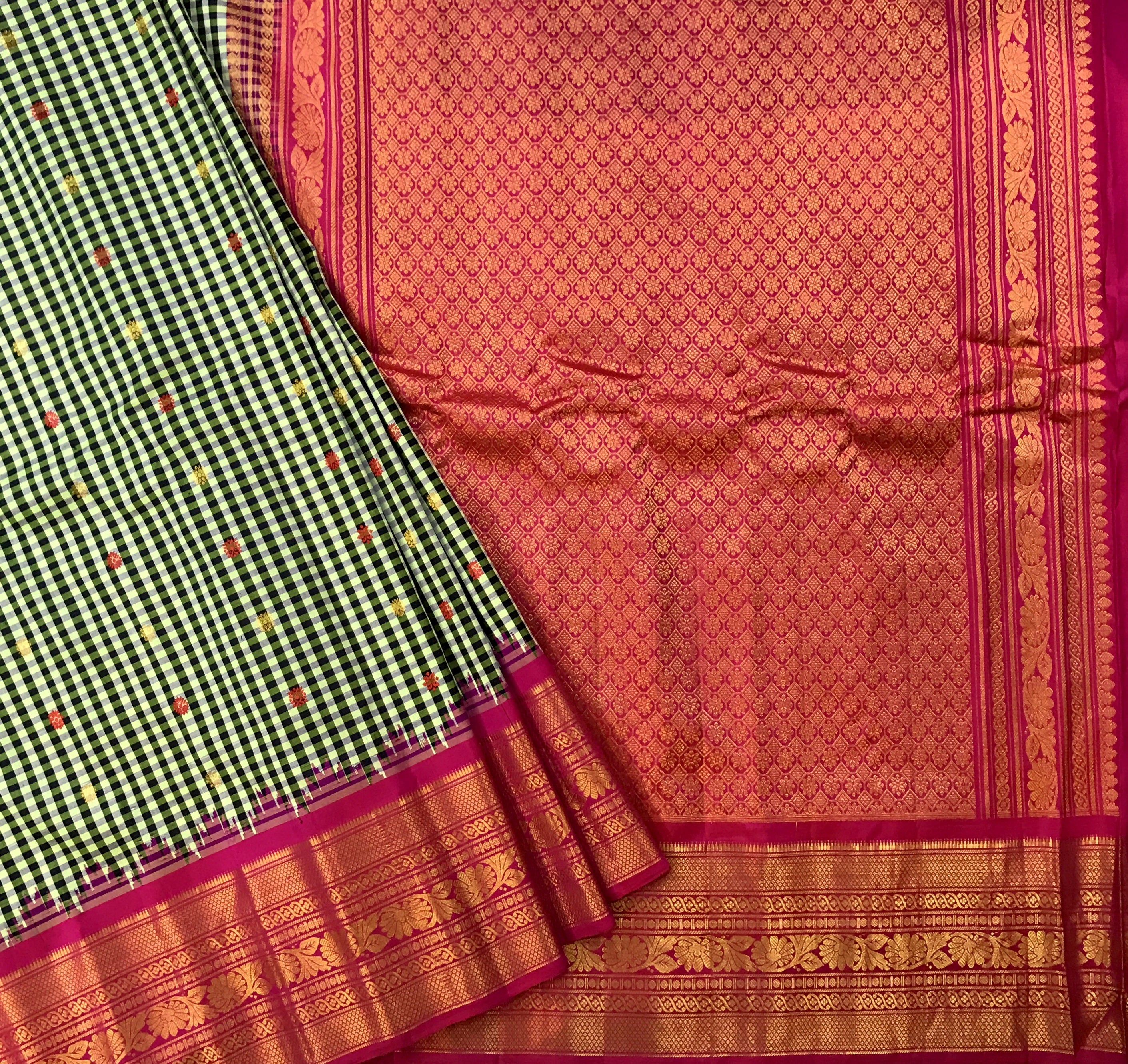 The classic combination of green and pink pure silk Gadhwal looks fabulous with its checks pattern woven in green silk thread as well as the floral shaped butti woven in reshim thread.  This pattern of checks is particularly special for its 'small checks' design.