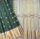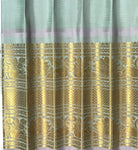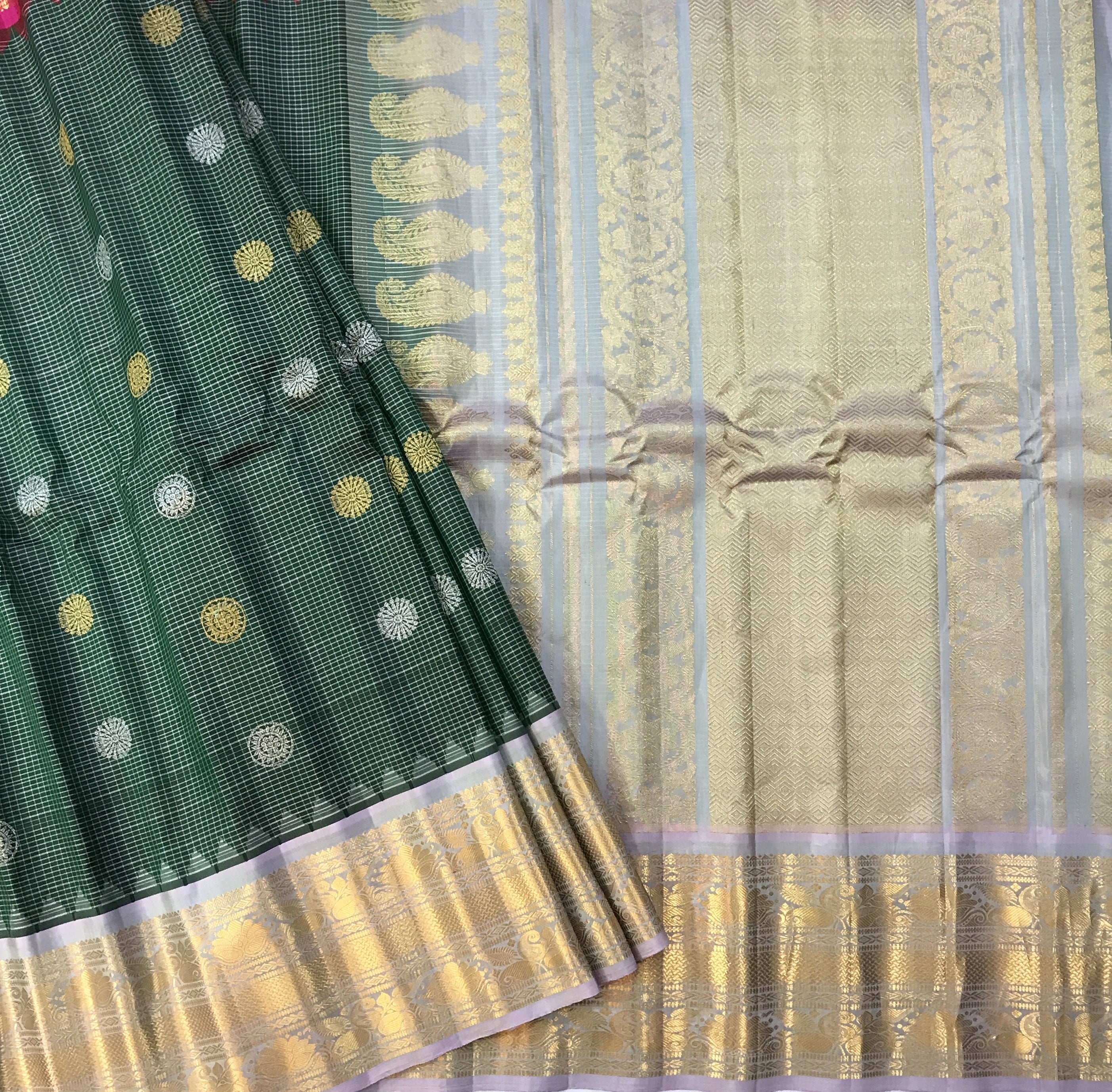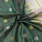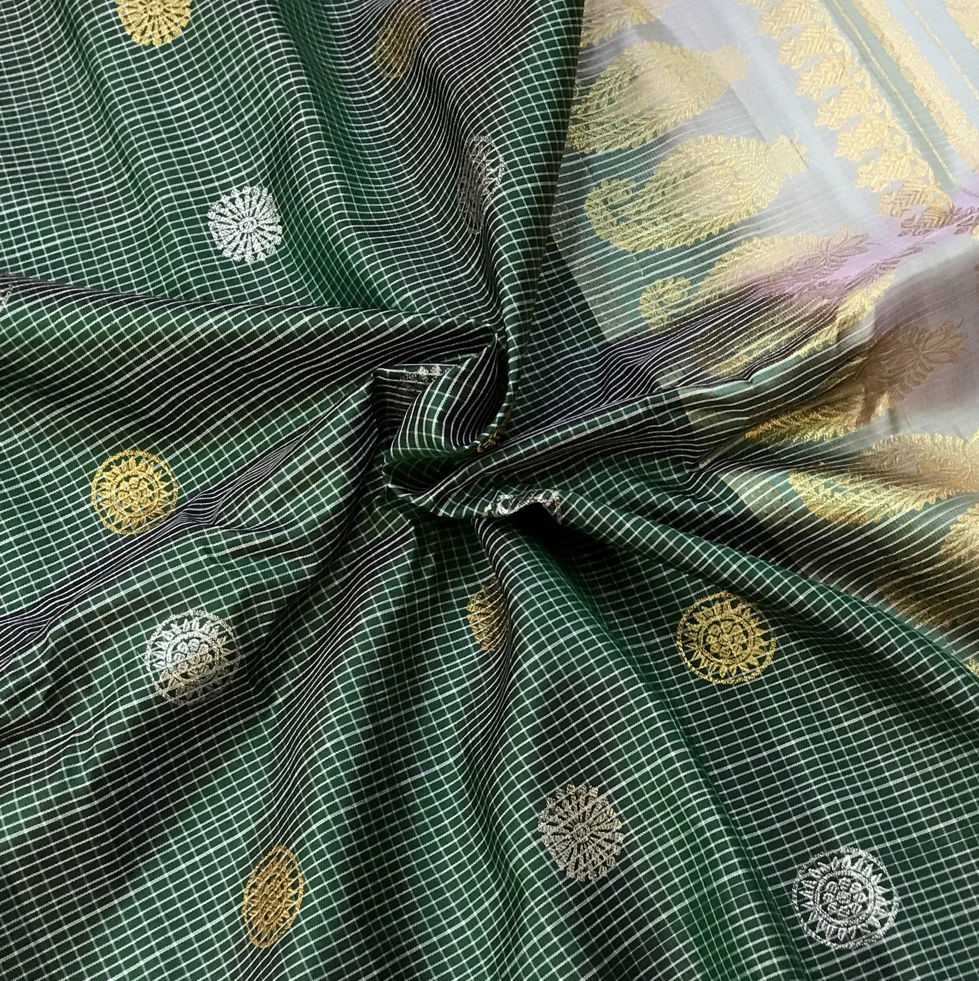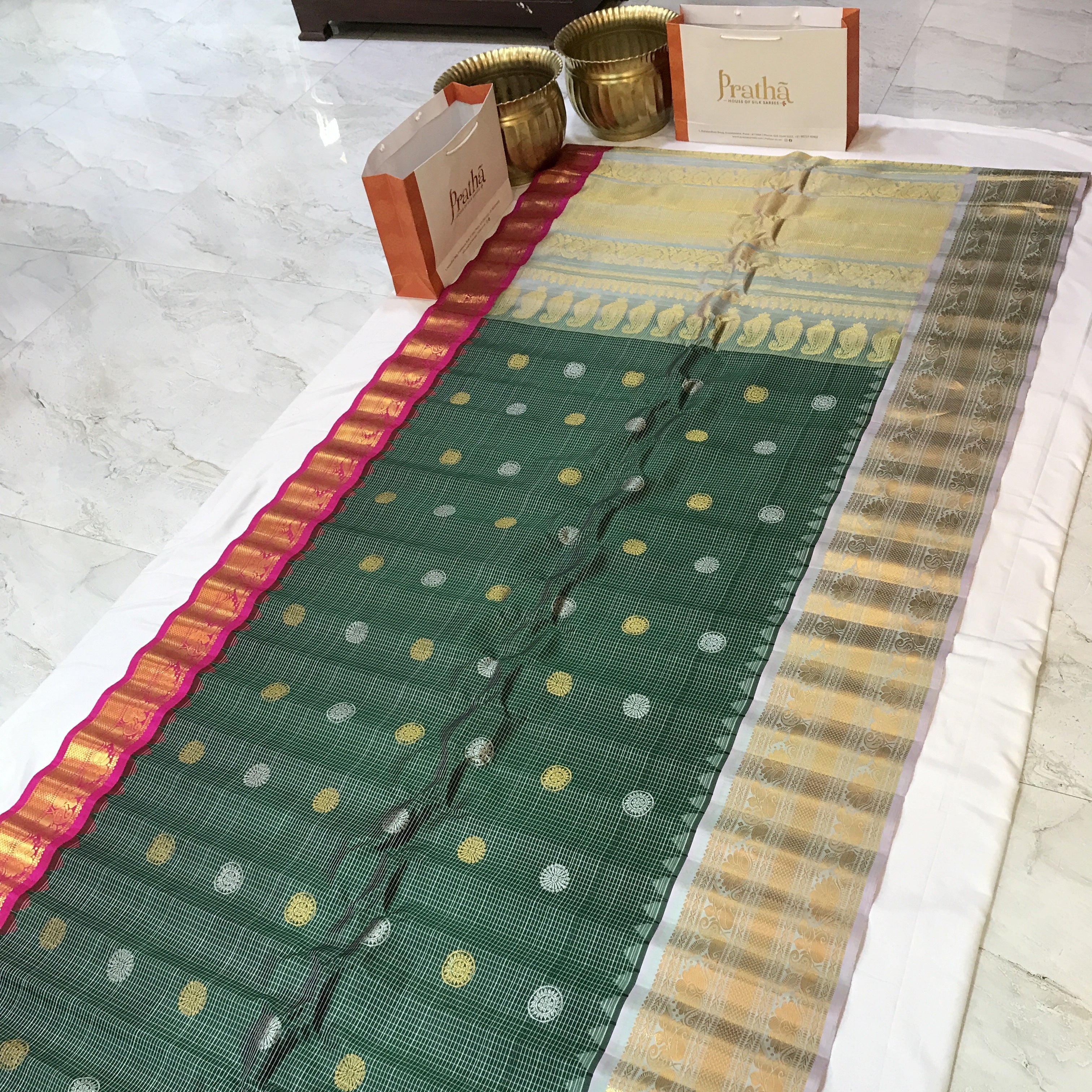 The classic combination of green and pink pure silk Gadhwal looks fabulous with its checks pattern woven in green silk thread as well as the big circle shaped butti woven in golden-silver zari. This pattern of checks is particularly special for its 'small checks' design. Do not miss that, this saree has 'Ganga-Jamuna ' border ( on top pink coloured and on bottom blue coloured), add beauty to this soothing weave!