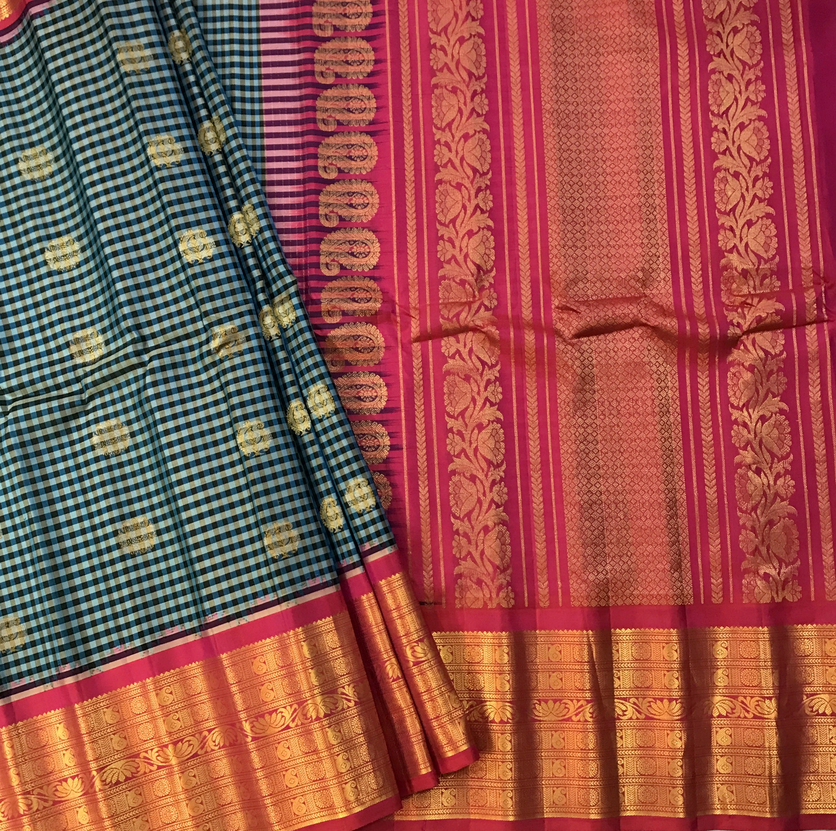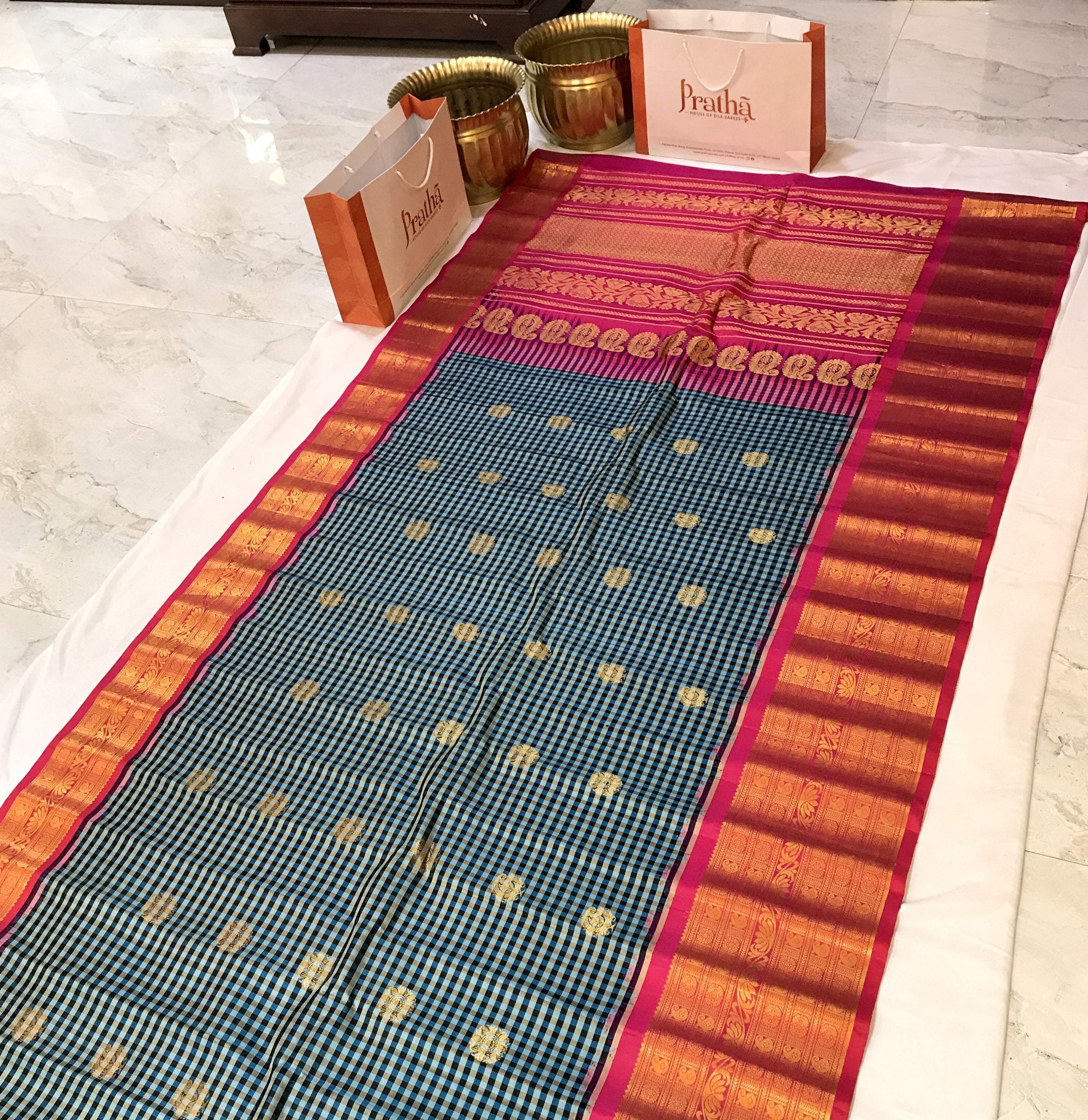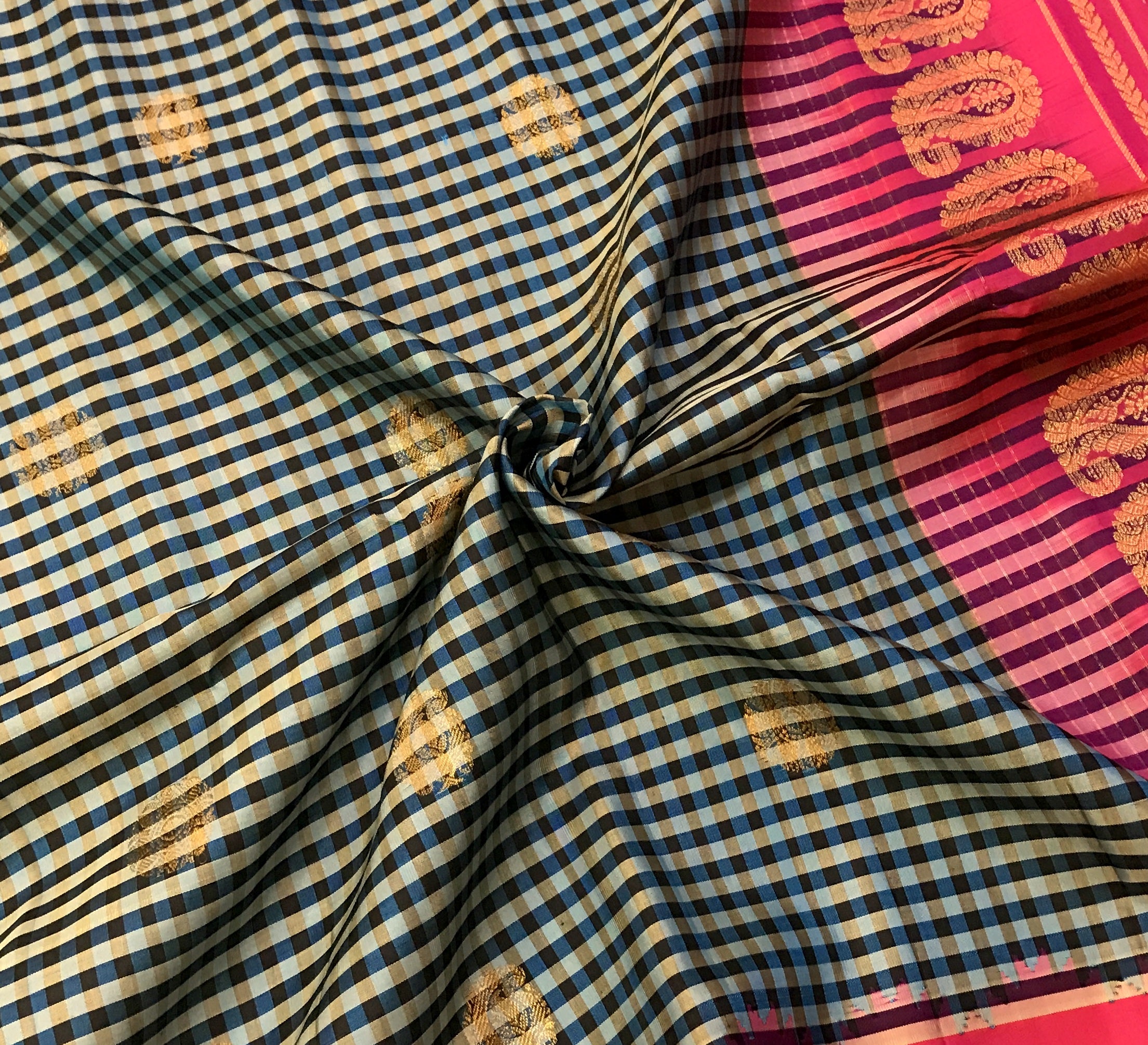 This is a beautiful combination and a unique one too! Blue Checks Gadhwal with a pink border and pallu. The traditional style woven border stand beautifully against the blue saree! The delicate checks design with butti design of this saree is equally outstanding in forms of alternet floral and koyari in golden zari look fantastic . For those who are on the lookout for something different, this one is just for you!