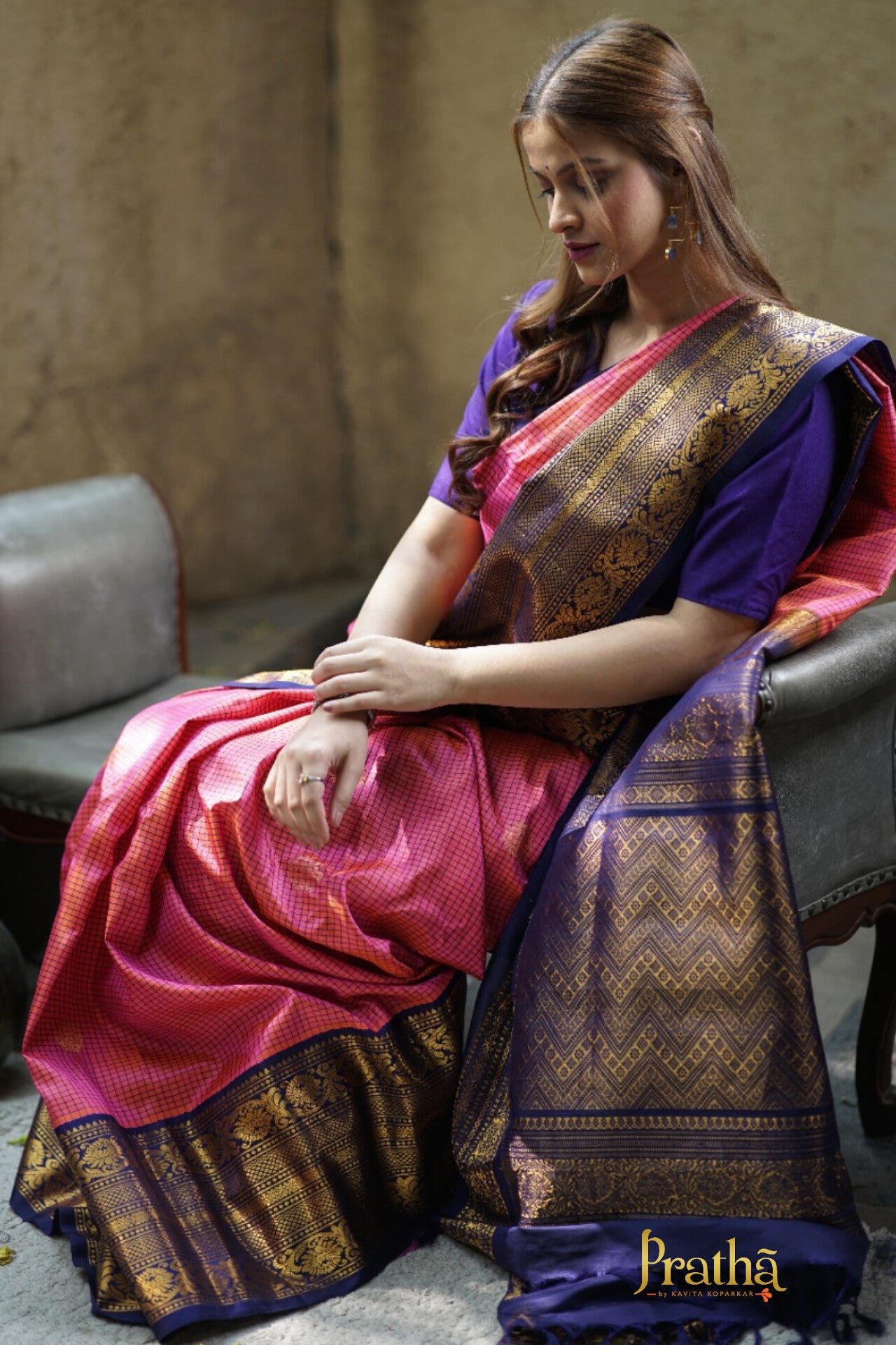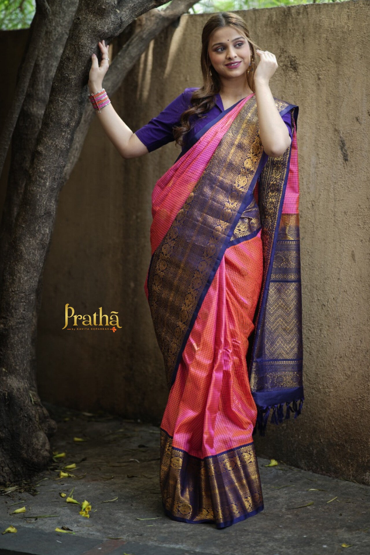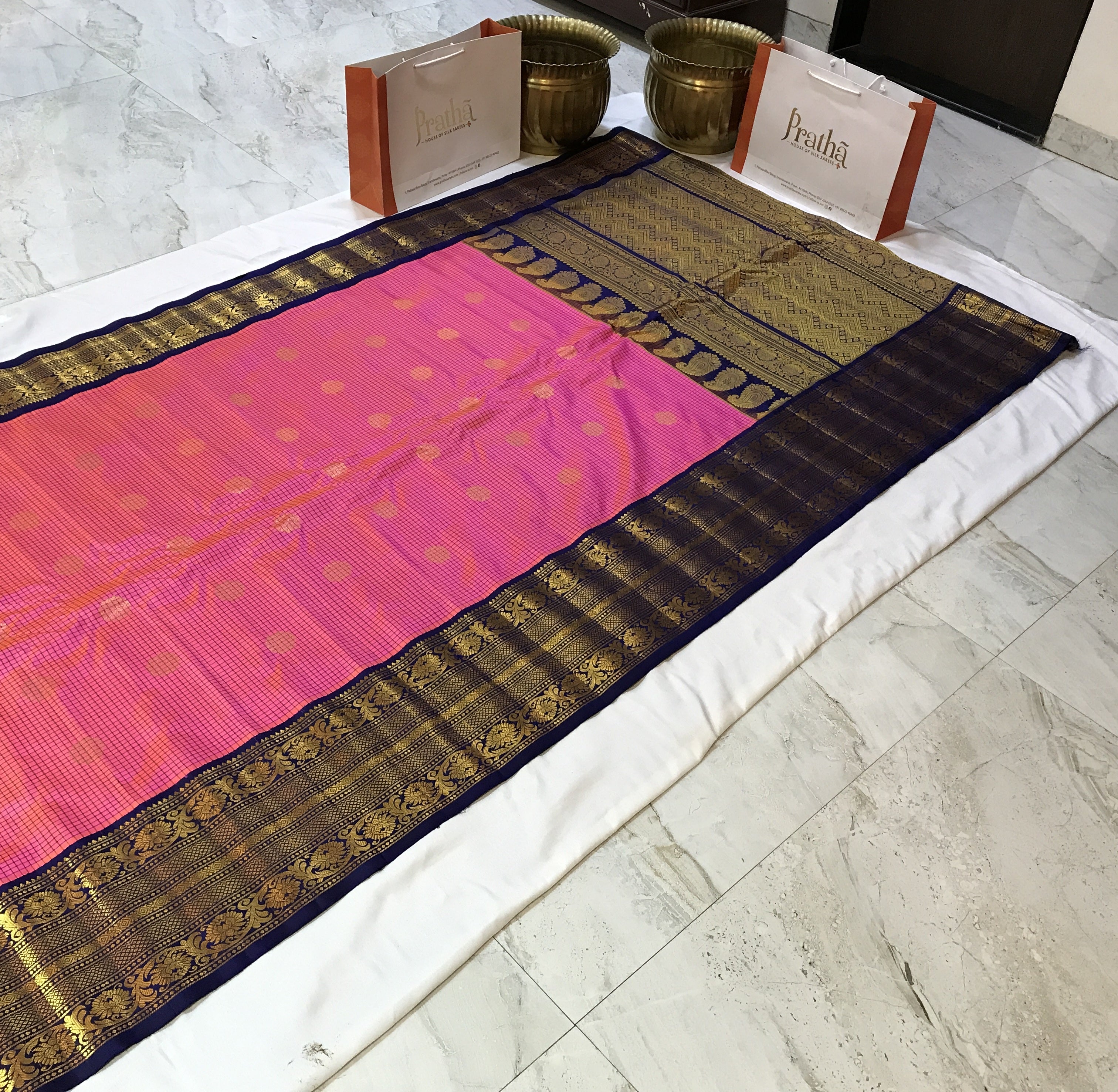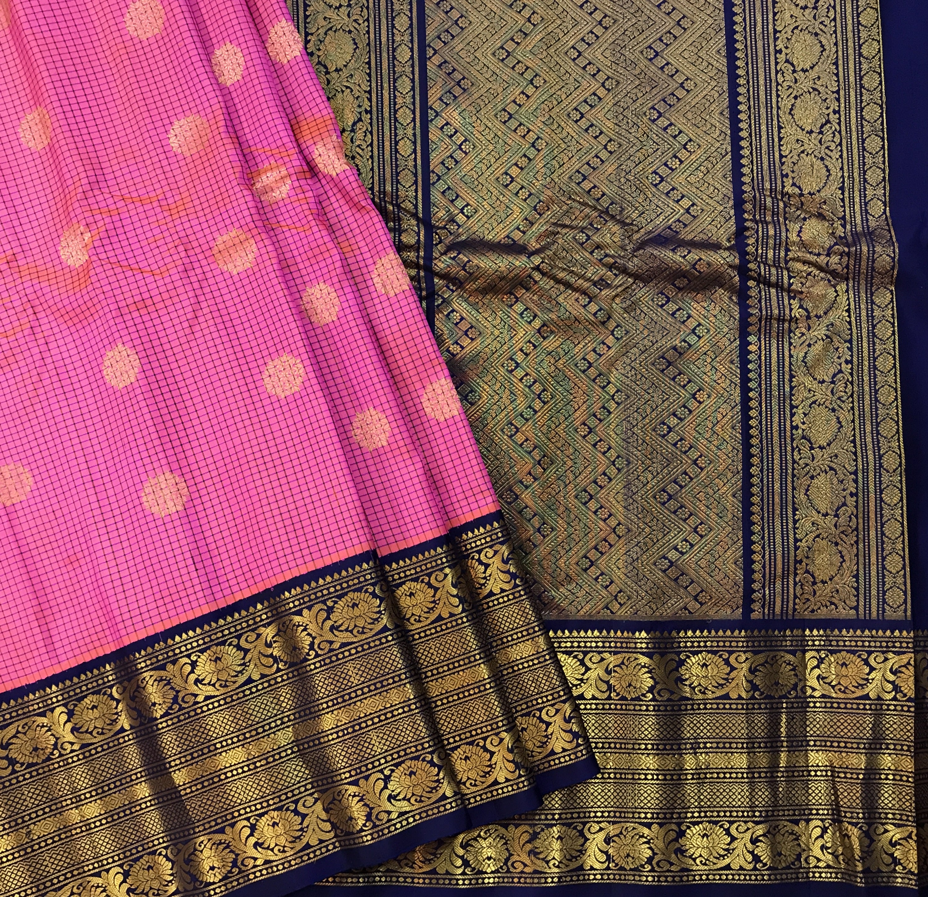 The classic combination of pink with peach golden ting and blue border Gadhwal looks fabulous with its checks pattern woven in silk thread as well as the big round shaped butti woven in golden and silver zari. This pattern of checks is particularly special for its 'small checks' design. This checks design with the golden zari pallu complement beautifully with this saree.