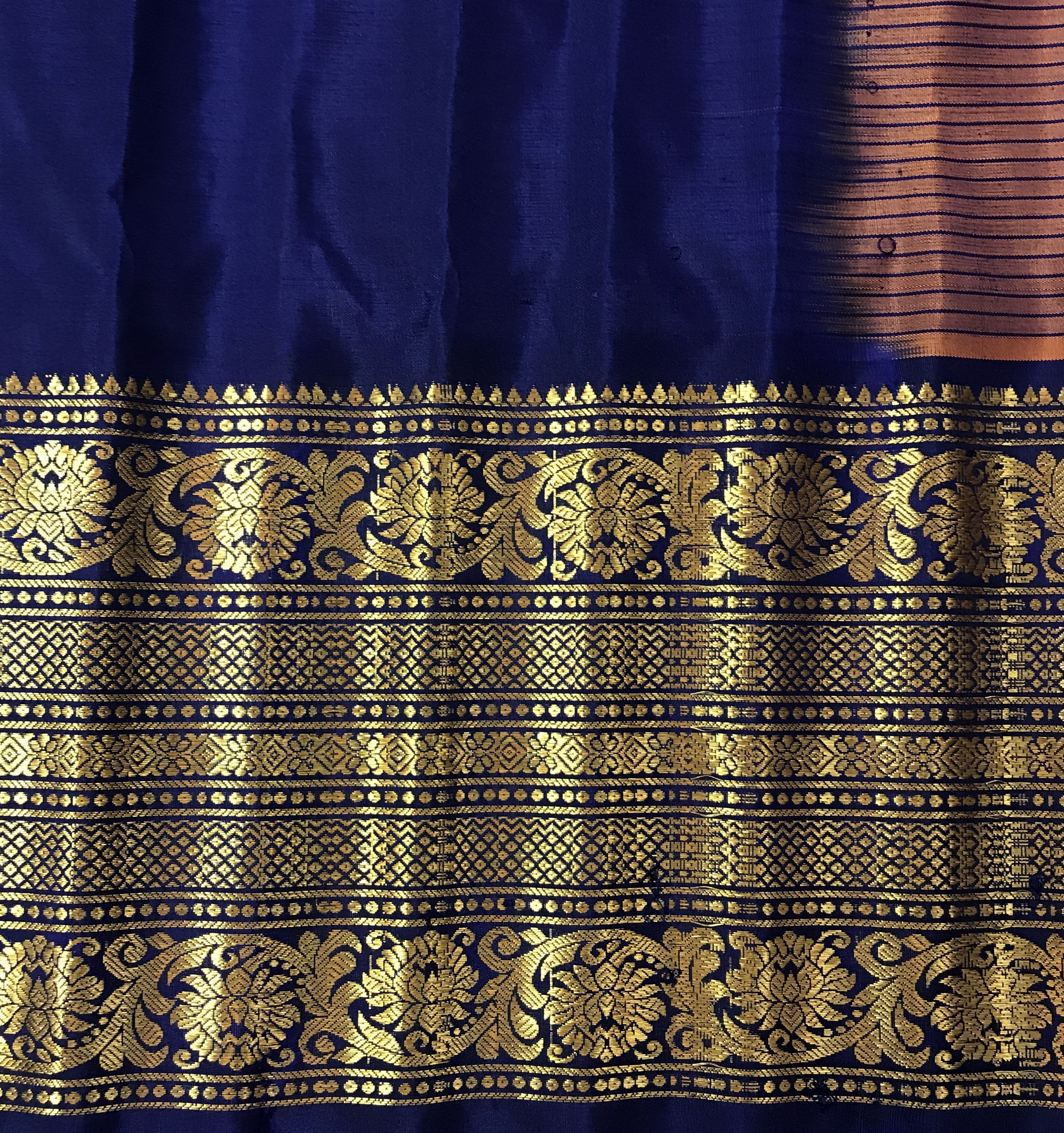 Blouse Colour: Contrast ( Blue with golden zari border )