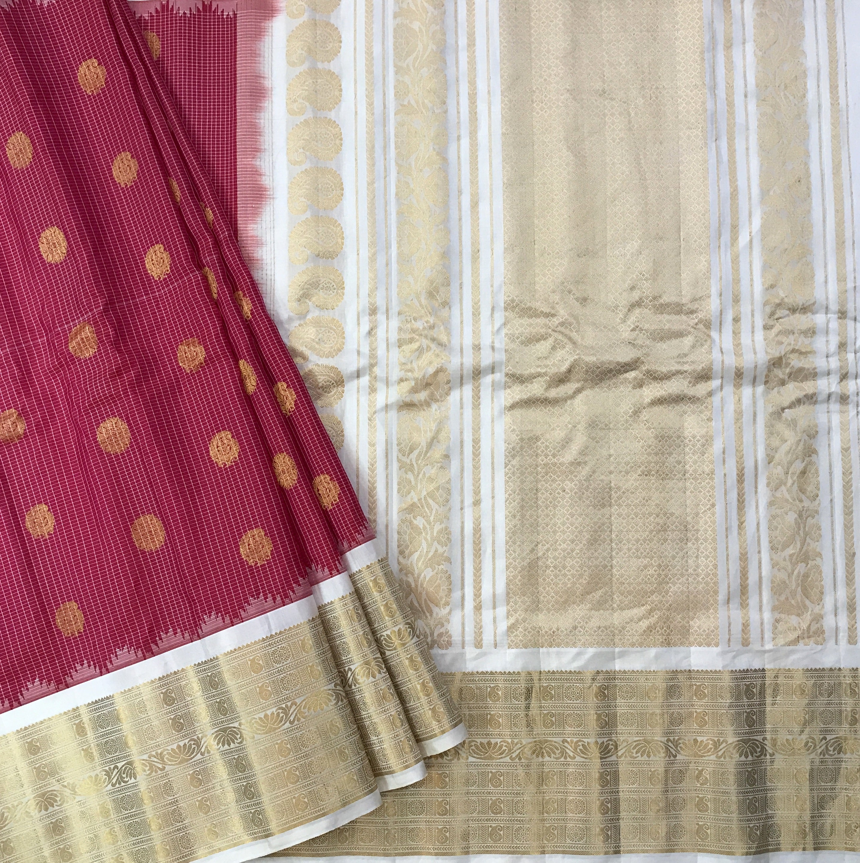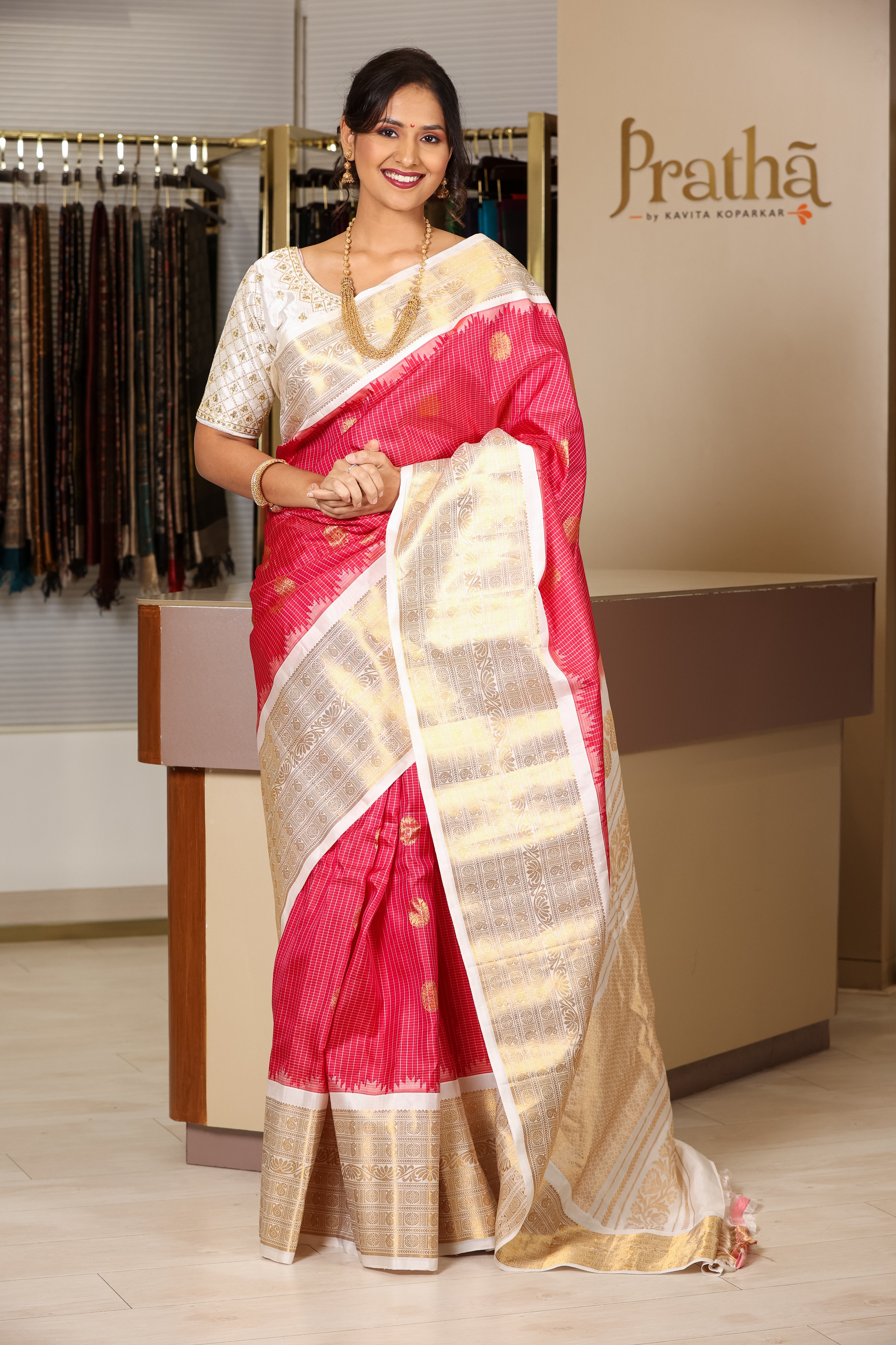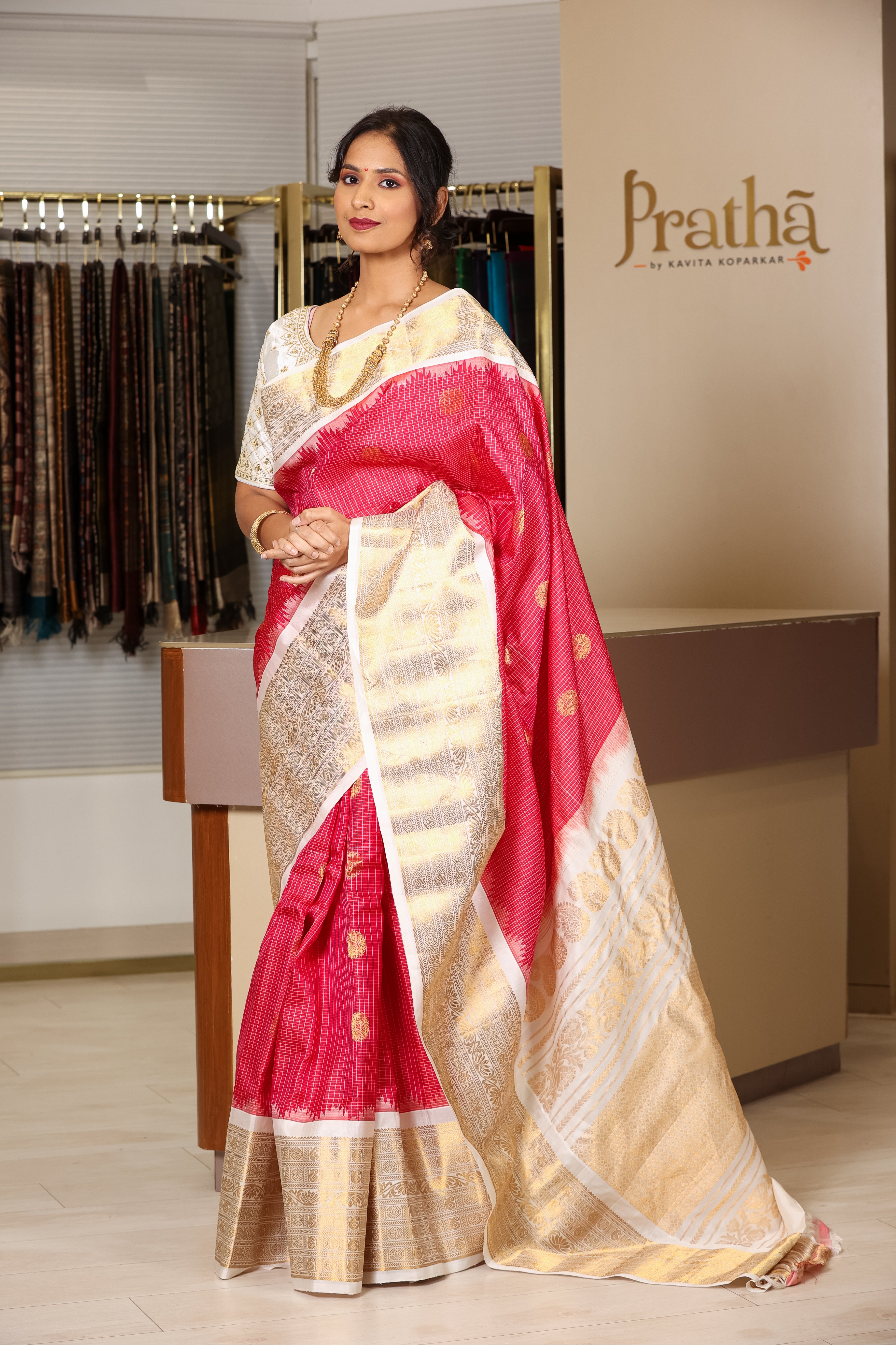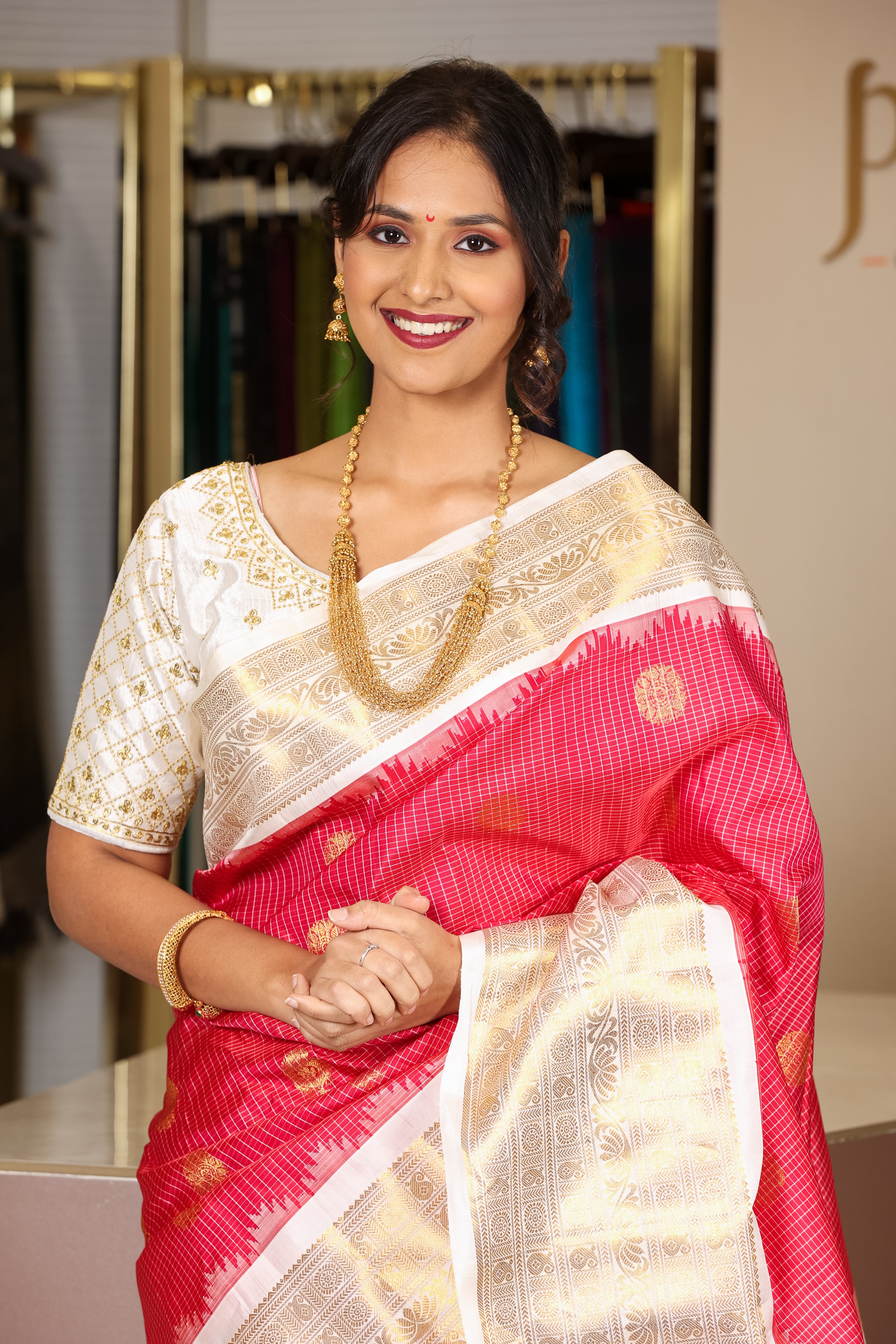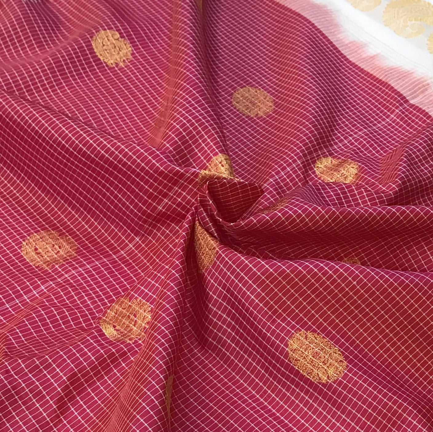 The classic combination of ruby red and off white pure silk Gadhwal looks fabulous with its checks pattern woven in off white silk thread as well as the big round shaped butti woven in golden zari. This pattern of checks is particularly special for its 'small checks' design. This checks design with the golden zari pallu complement beautifully with this saree.