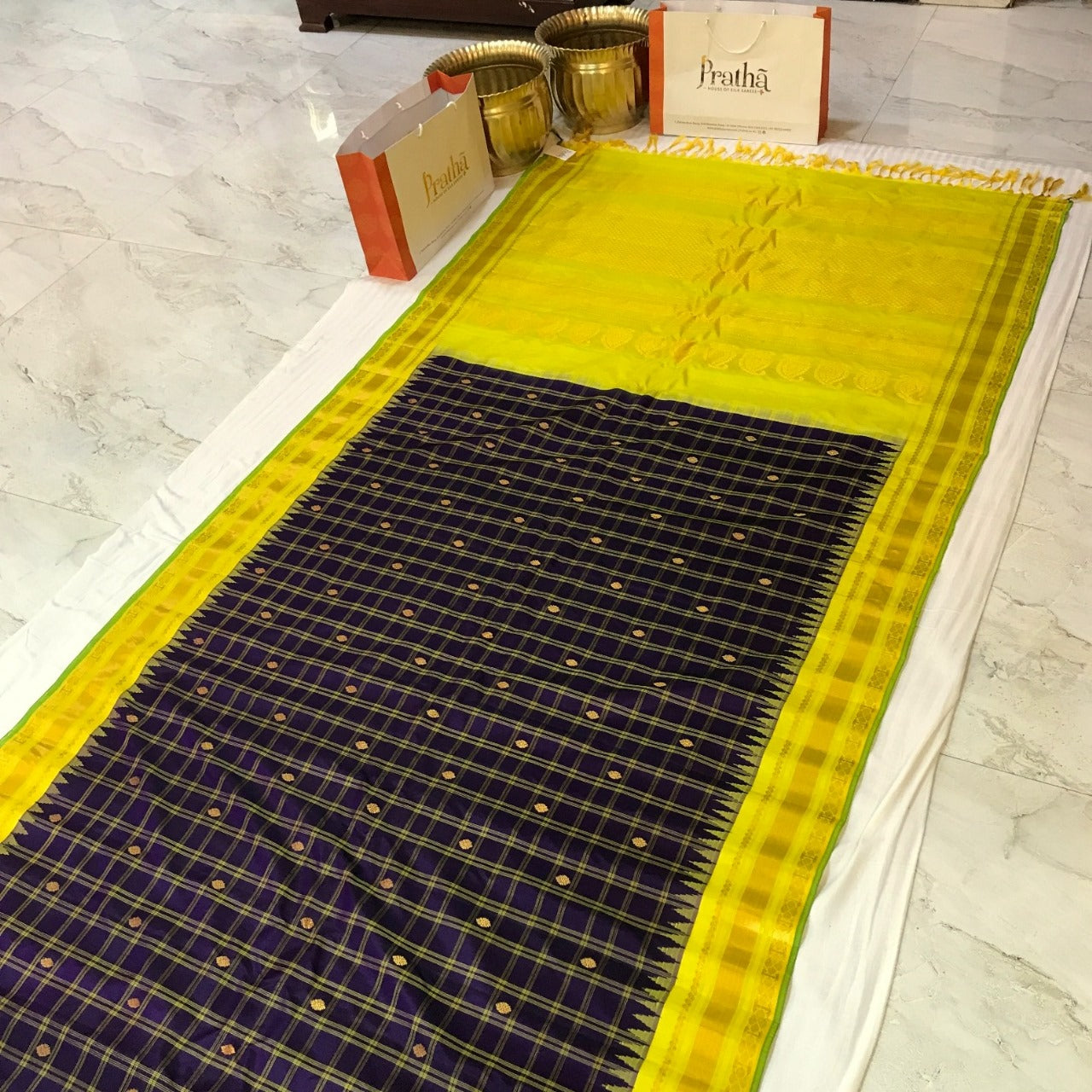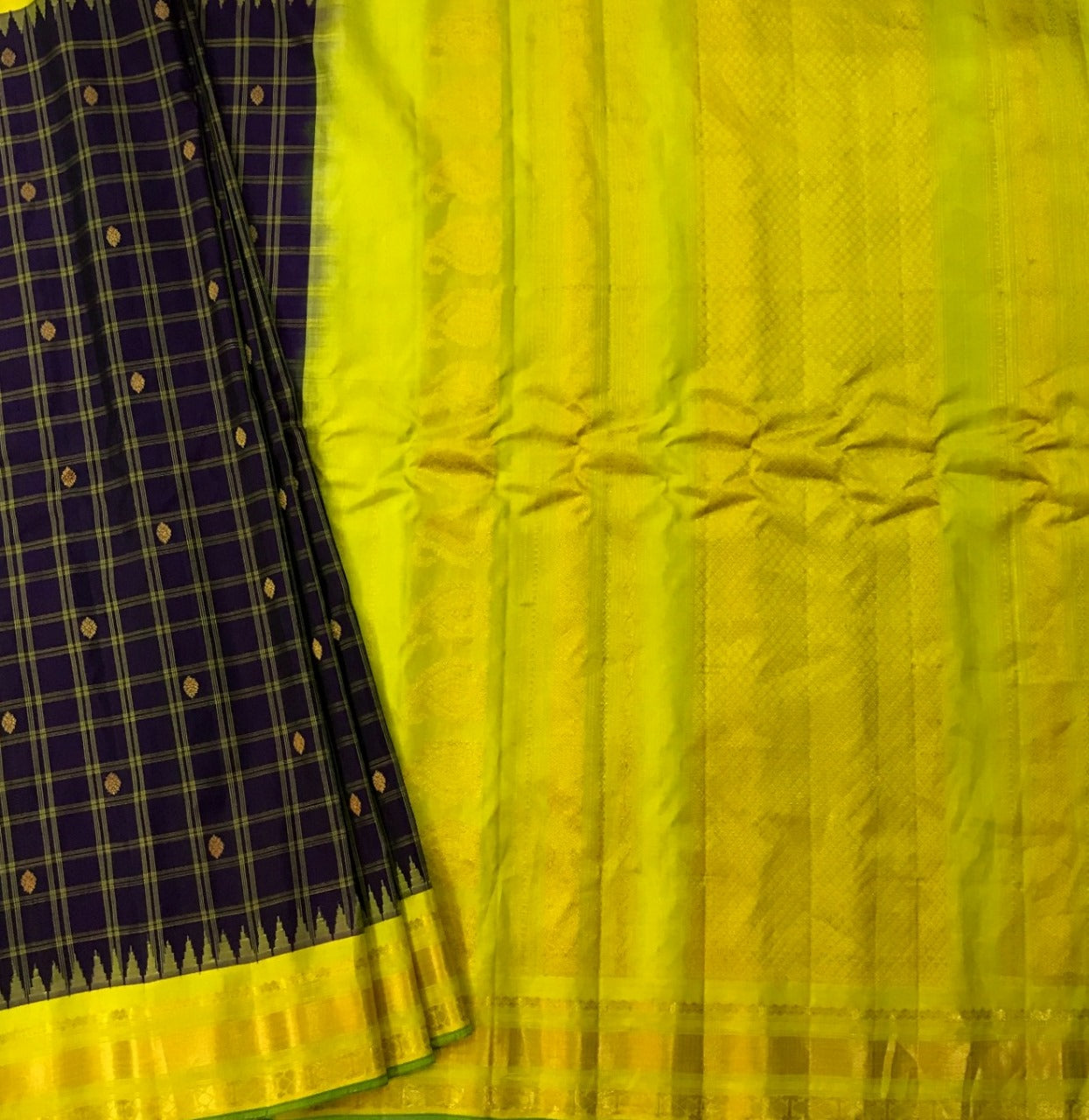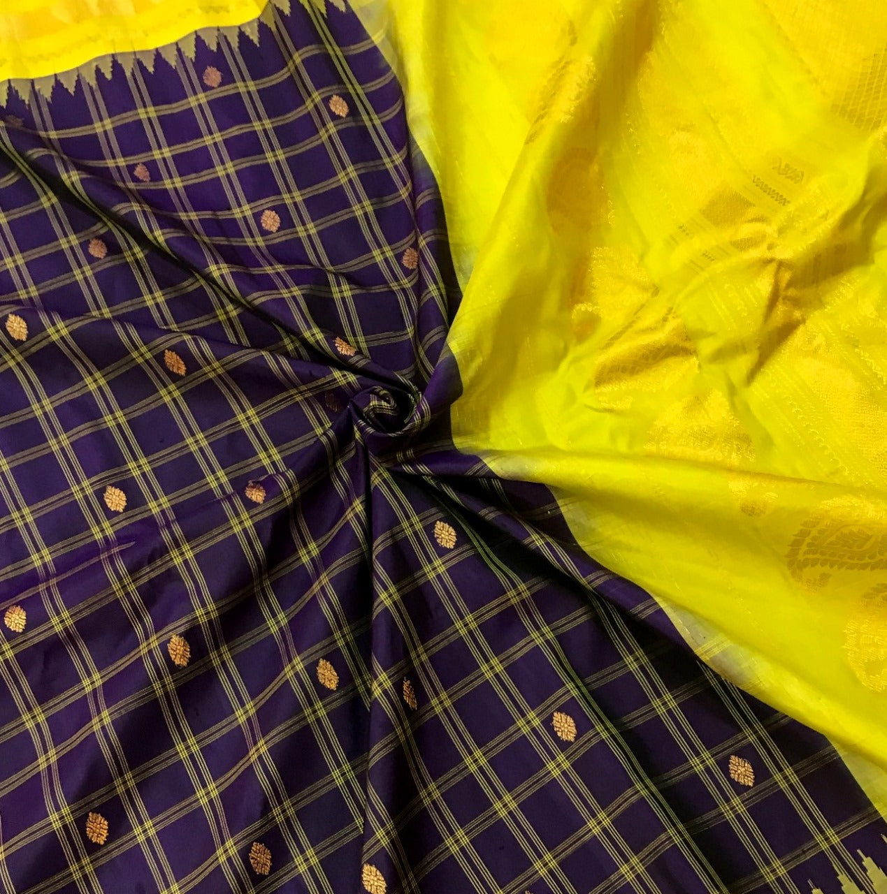 The classic combination of purple and yellow pure silk Gadhwal looks fabulous with its checks pattern woven in silk thread as well as the oval shaped butti woven in golden zari. This pattern of checks is particularly special for its 'big checks' design. This checks design with the golden zari pallu complement beautifully with this saree.