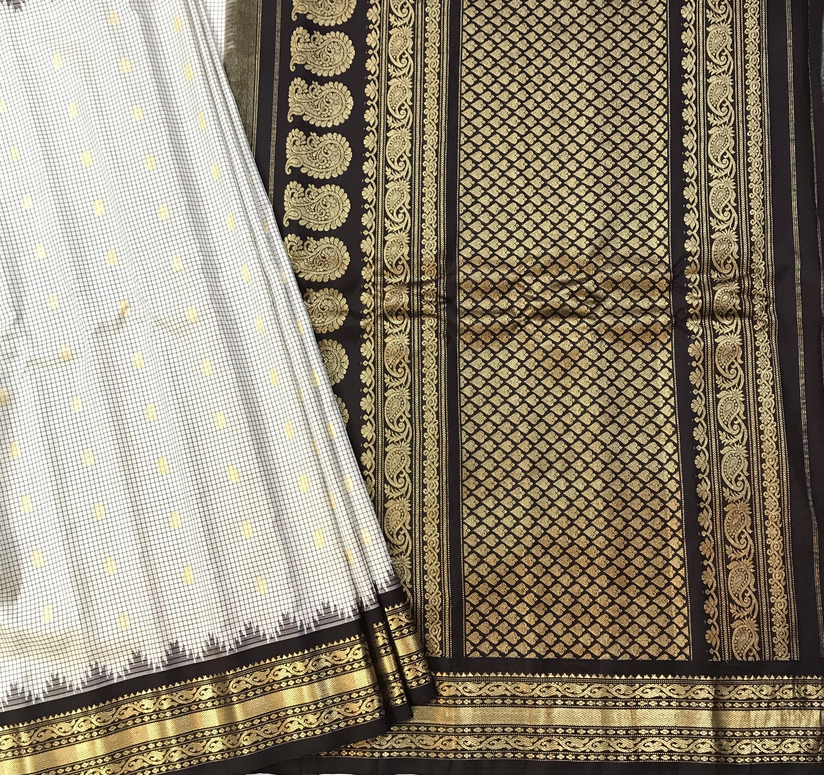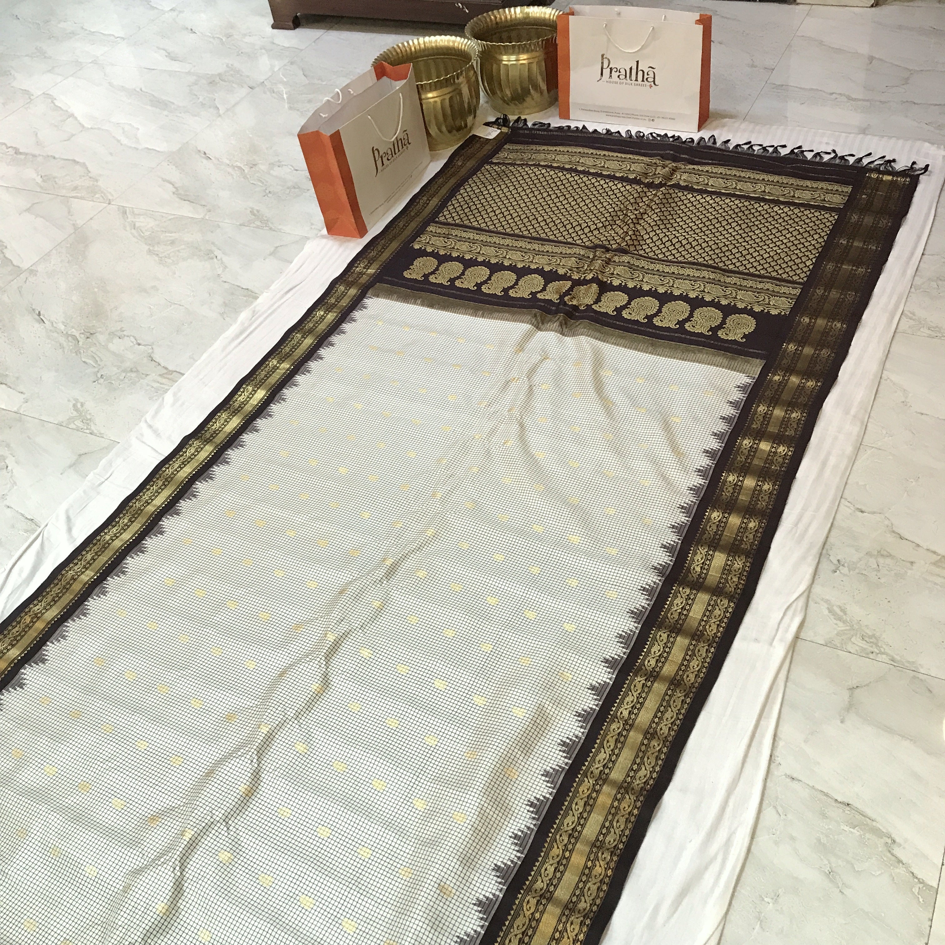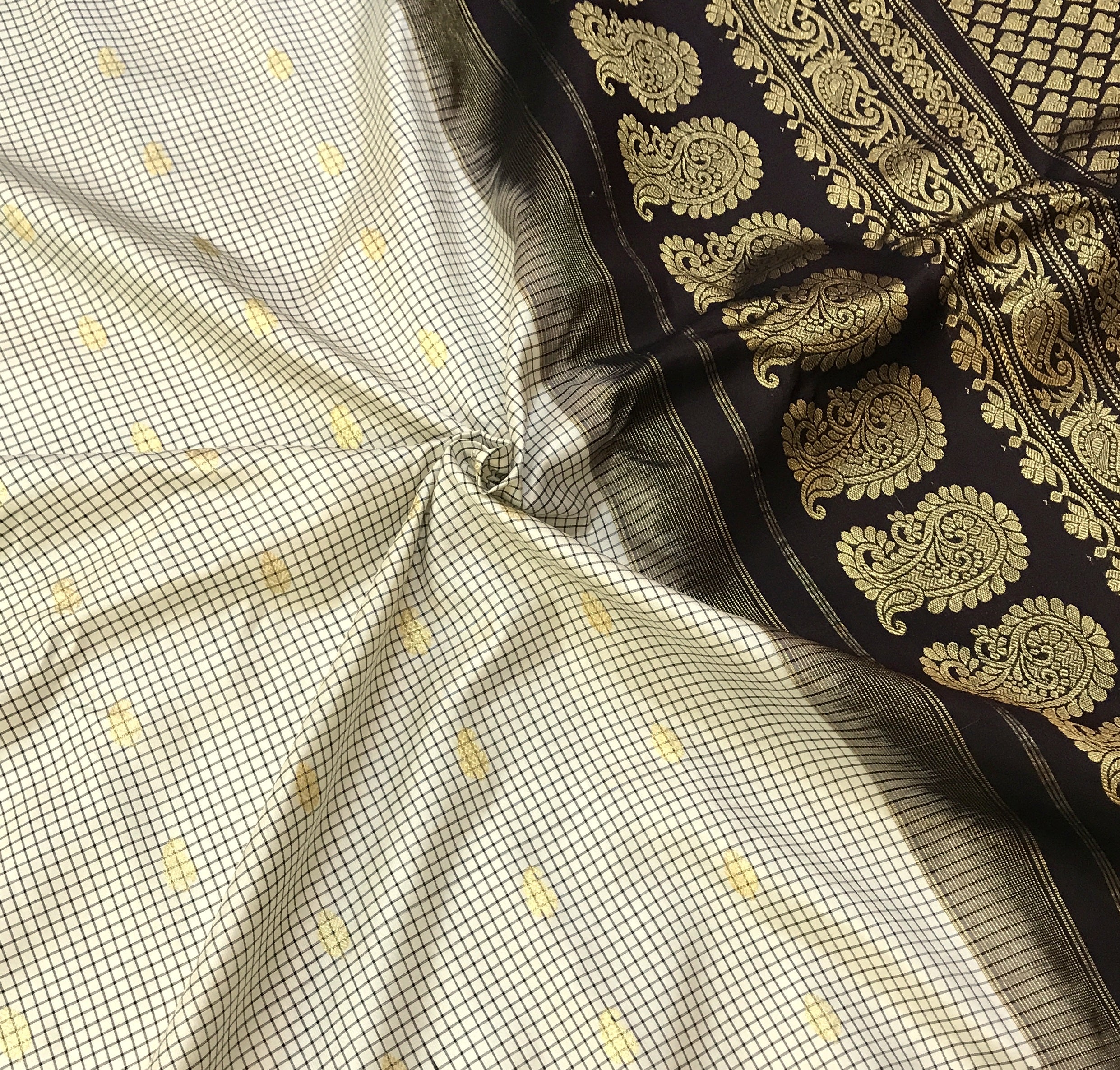 This is a beautiful combination and a unique one too! Fresh off-white Checks Gadhwal with a coffee brown border and pallu. The traditional style woven border stand beautifully against the off-white saree! The delicate checks design with butti design of this saree is equally outstanding in forms of floral in silk and zari thread look fantastic . For those who are on the lookout for something different, this one is just for you!