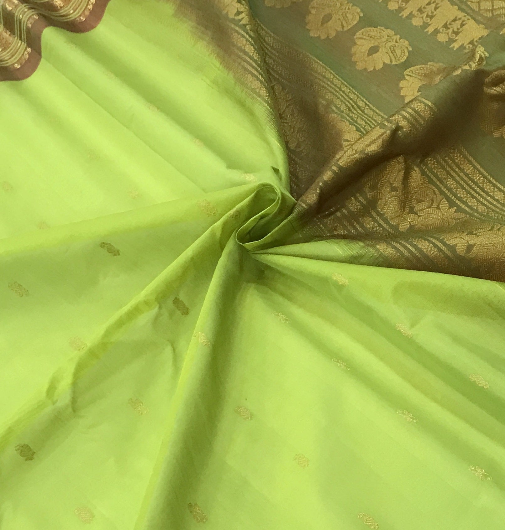 This elegant cotton Gadwal saree beautifully blends tradition and charm with its soothing light green body adorned with delicate golden buttas. The highlight lies in its stunning contrast royal blue border and pallu, richly woven with classic floral and paisley motifs in lustrous zari, showcasing the authentic craftsmanship Gadwal sarees are known for. The intricate geometric patterns and traditional paisley designs on the pallu add a regal touch, making this saree perfect for festive occasions and graceful everyday elegance. The vibrant contrast and lightweight drape make it a timeless, effortless statement piece.
