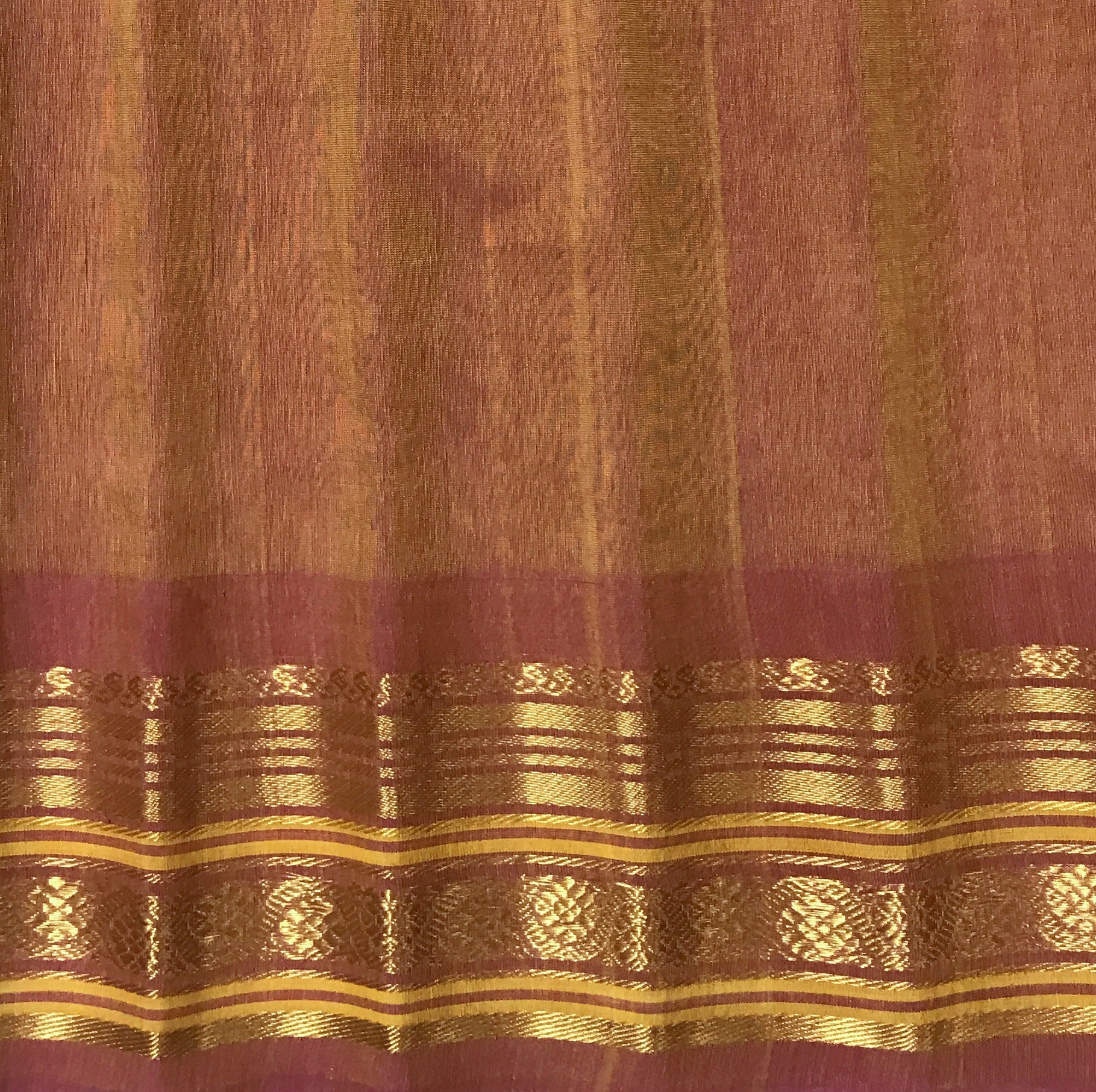 Blouse Colour: Contrast ( Peach with golden zari border )