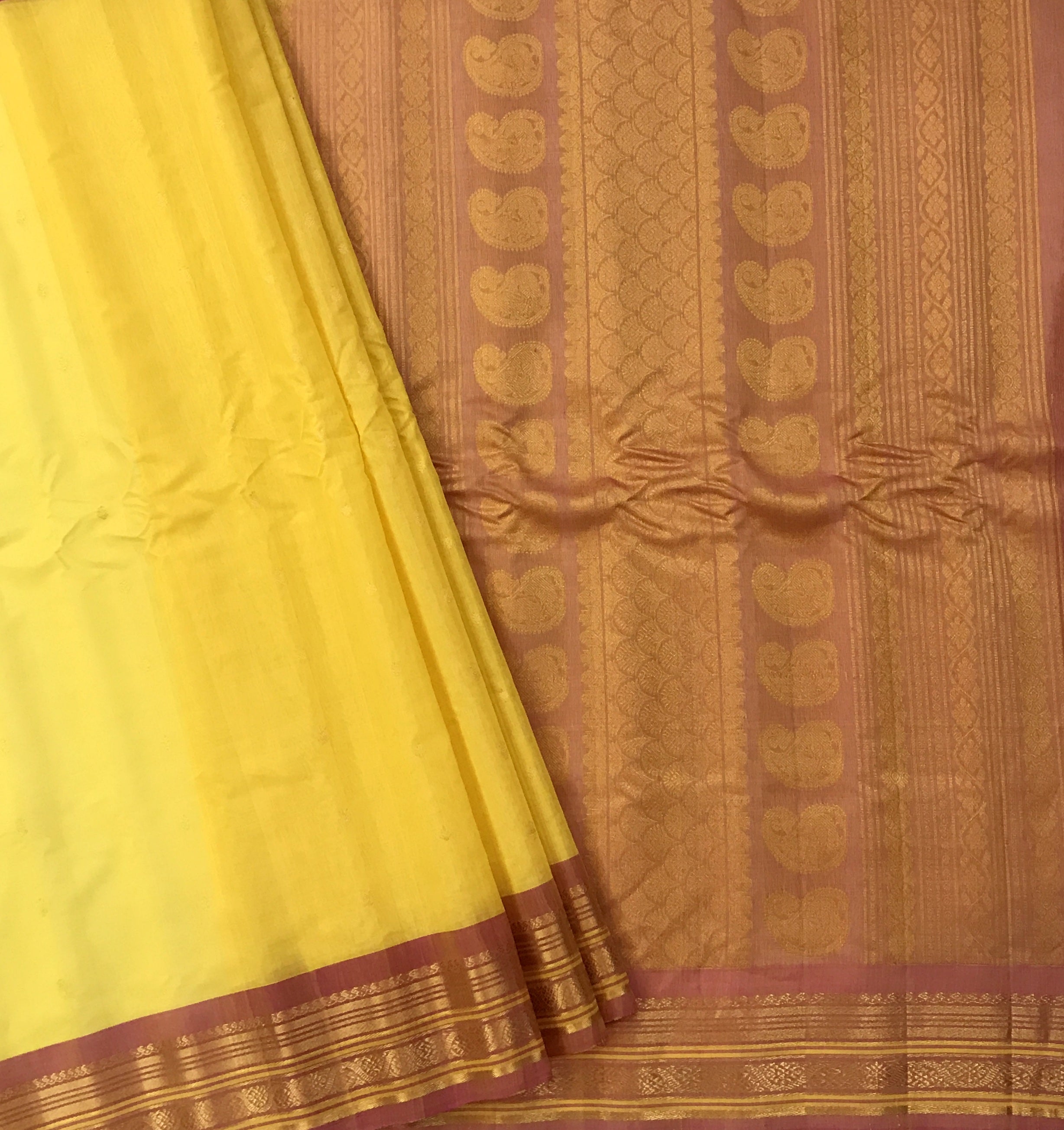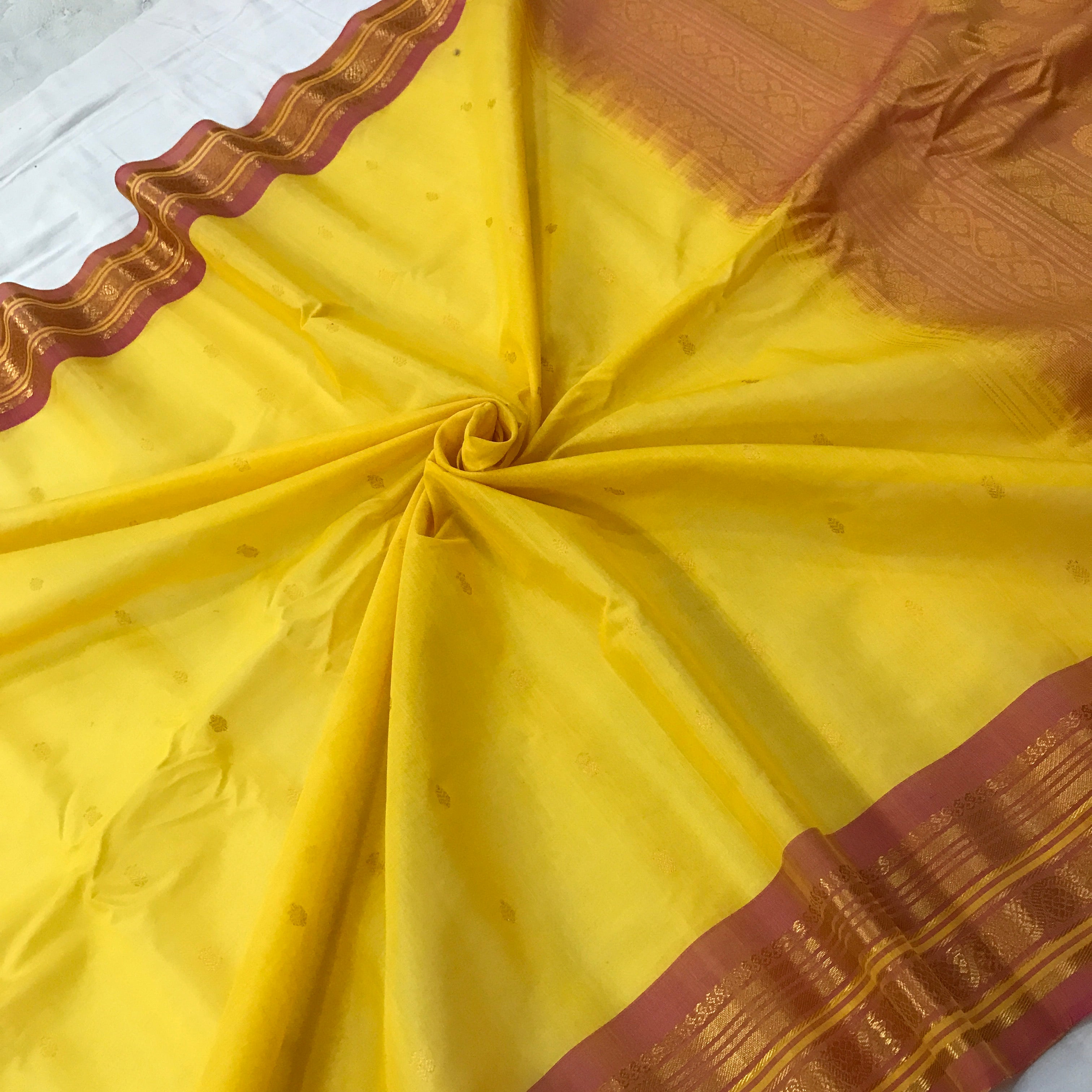 This elegant cotton Gadwal saree beautifully blends tradition and charm with its soothing yellow body adorned with delicate golden buttas. The highlight lies in its stunning contrast peach border and pallu, richly woven with classic floral and paisley motifs in lustrous zari, showcasing the authentic craftsmanship Gadwal sarees are known for. The intricate geometric patterns and traditional paisley designs on the pallu add a regal touch, making this saree perfect for festive occasions and graceful everyday elegance. The vibrant contrast and lightweight drape make it a timeless, effortless statement piece.