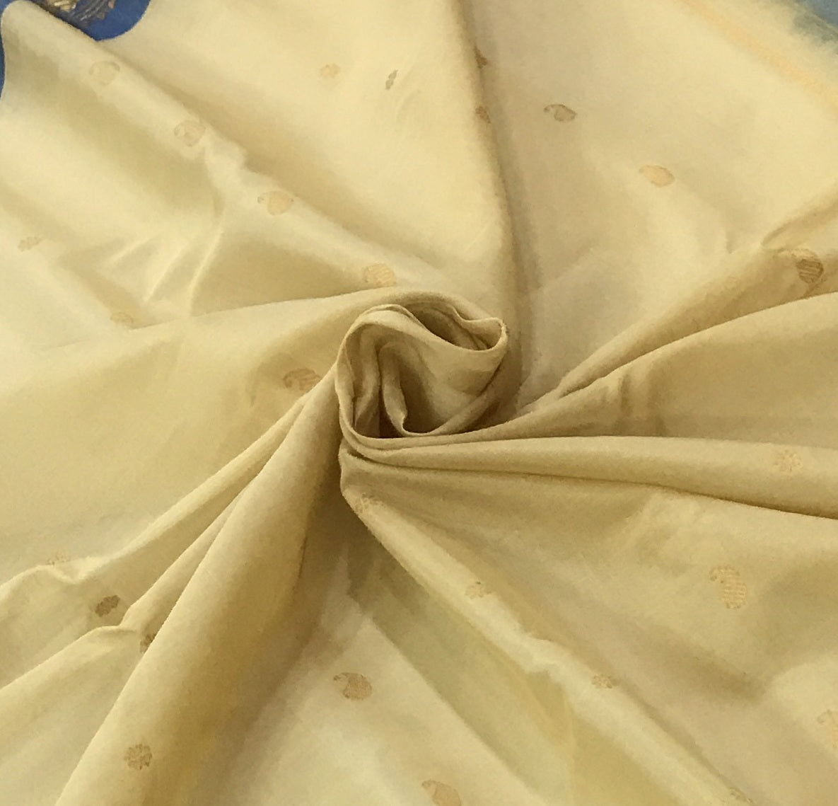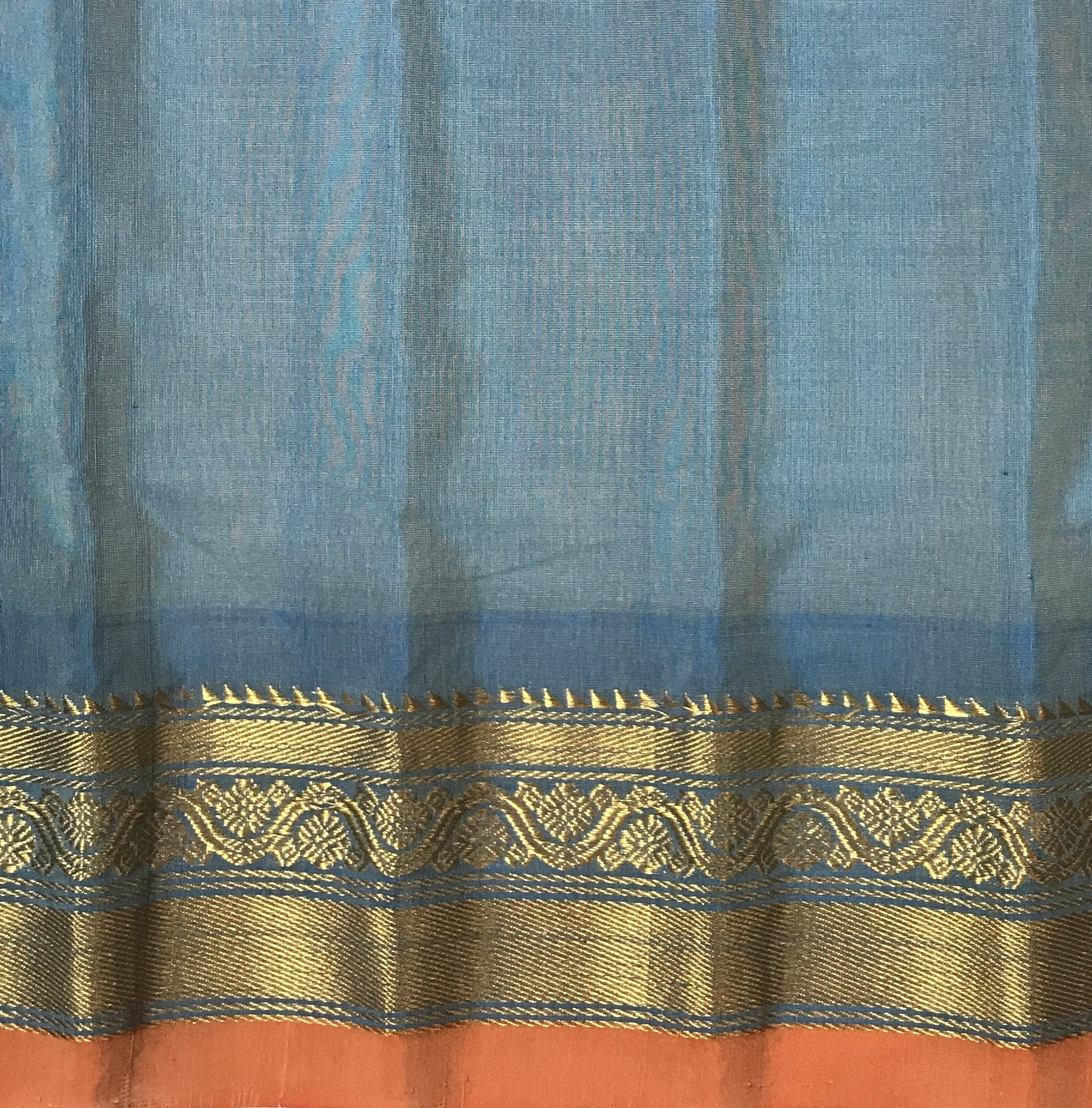 Blouse Colour: Contrast ( Blue with golden zari border )