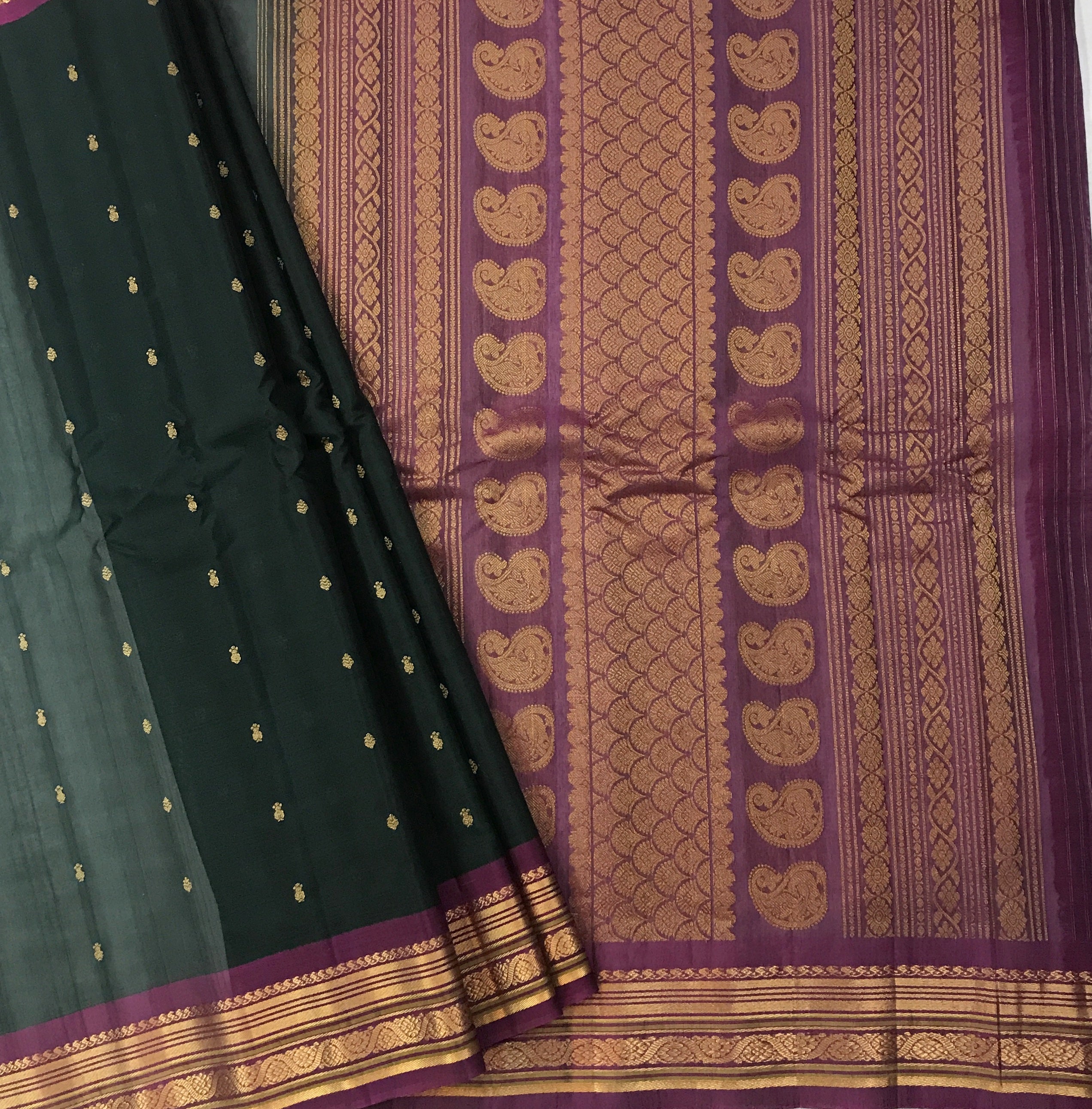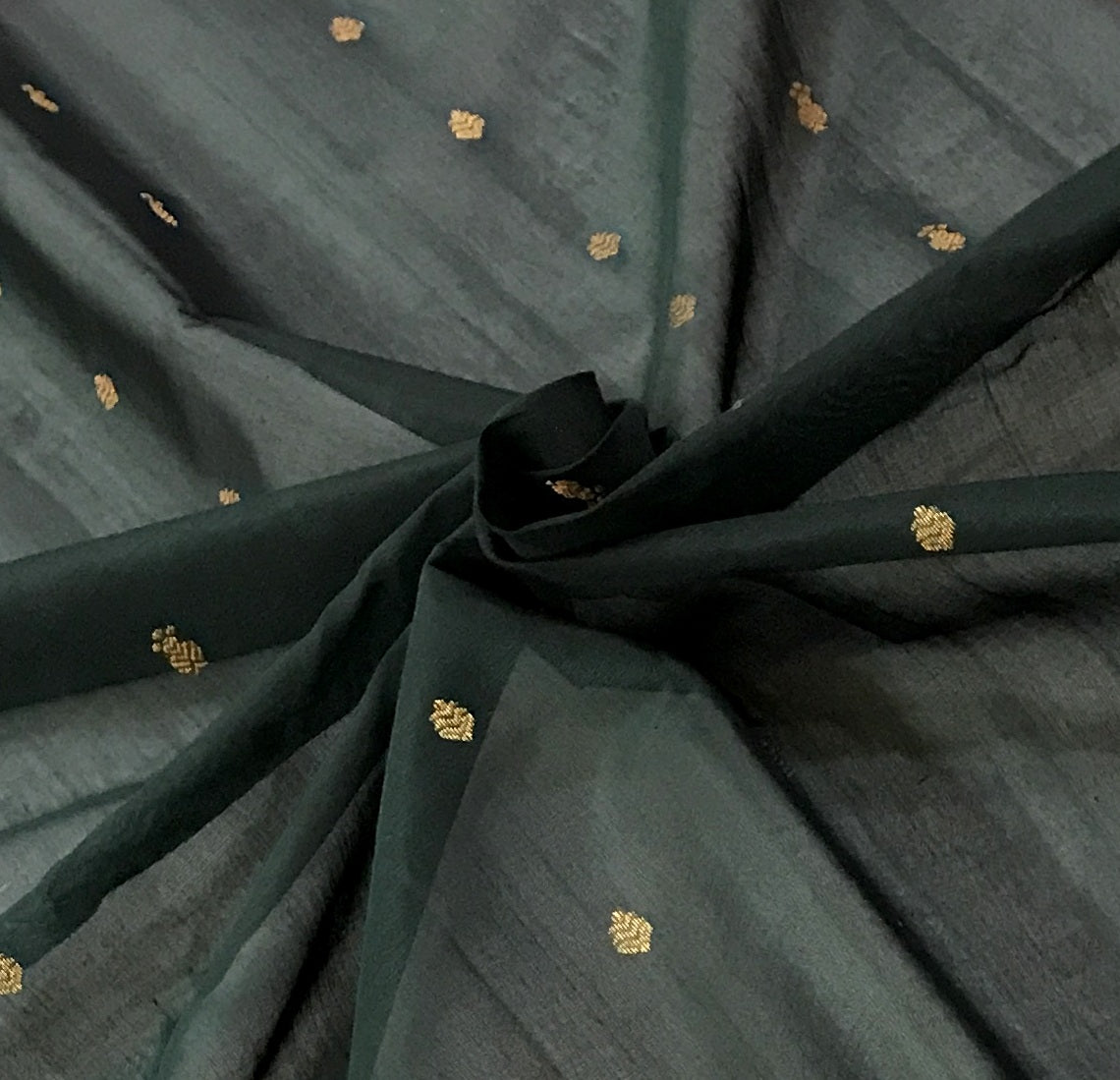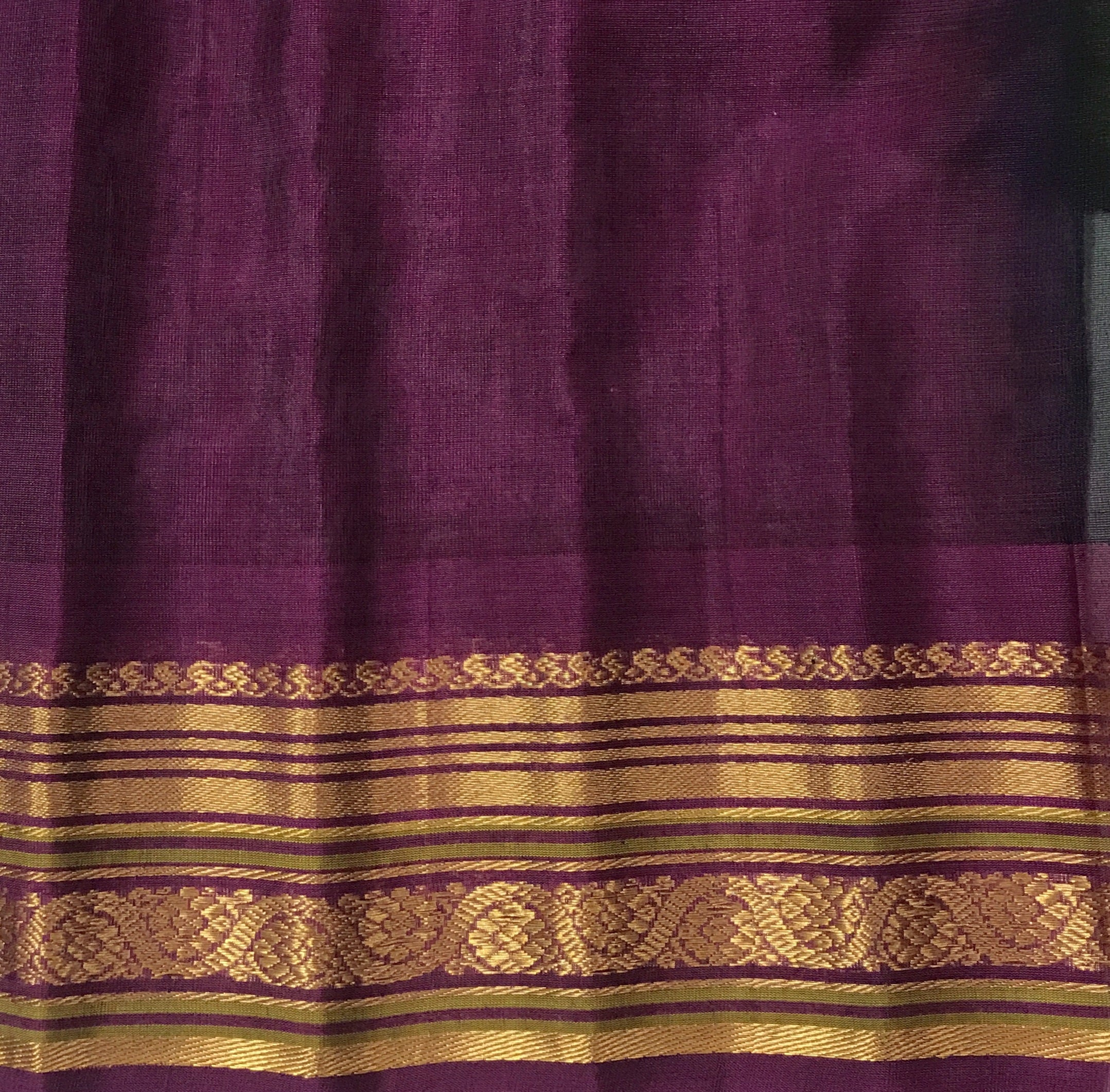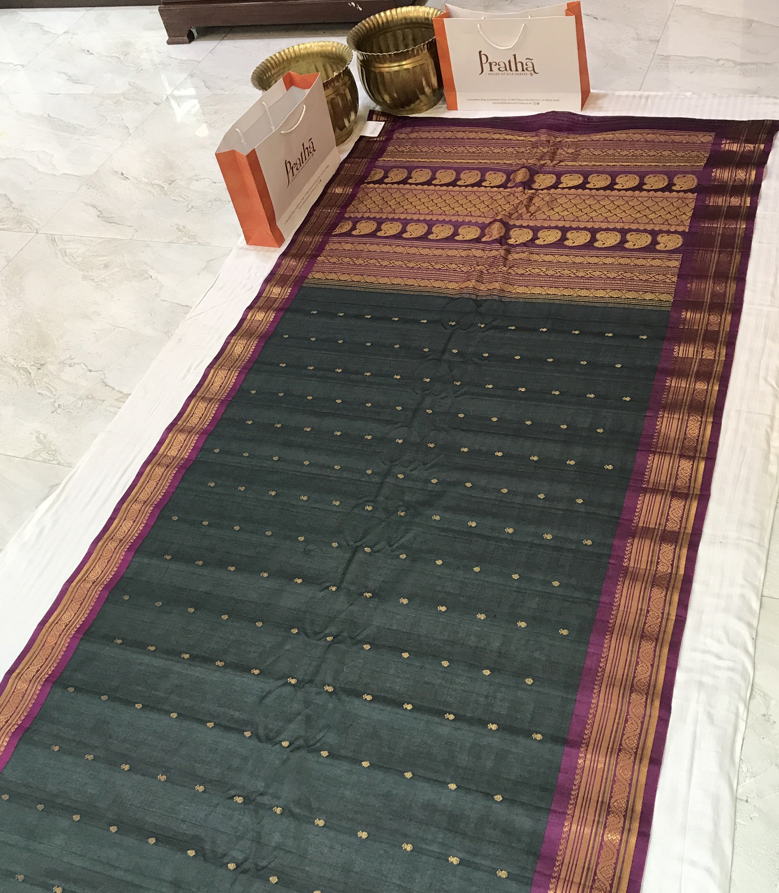This elegant cotton Gadwal saree beautifully blends tradition and charm with its soothing green body adorned with delicate golden buttas. The highlight lies in its stunning contrast magenta border and pallu, richly woven with classic floral and paisley motifs in lustrous zari, showcasing the authentic craftsmanship Gadwal sarees are known for. The intricate geometric patterns and traditional paisley designs on the pallu add a regal touch, making this saree perfect for festive occasions and graceful everyday elegance. The vibrant contrast and lightweight drape make it a timeless, effortless statement piece.