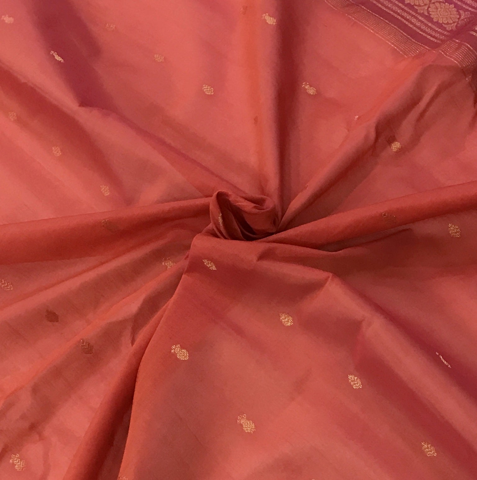 This elegant cotton Gadwal saree beautifully blends tradition and charm with its soothing orange-pink body adorned with delicate golden buttas. The highlight lies in its stunning contrast pink border and pallu, richly woven with classic floral and paisley motifs in lustrous zari, showcasing the authentic craftsmanship Gadwal sarees are known for. The intricate geometric patterns and traditional paisley designs on the pallu add a regal touch, making this saree perfect for festive occasions and graceful everyday elegance. The vibrant contrast and lightweight drape make it a timeless, effortless statement piece.
