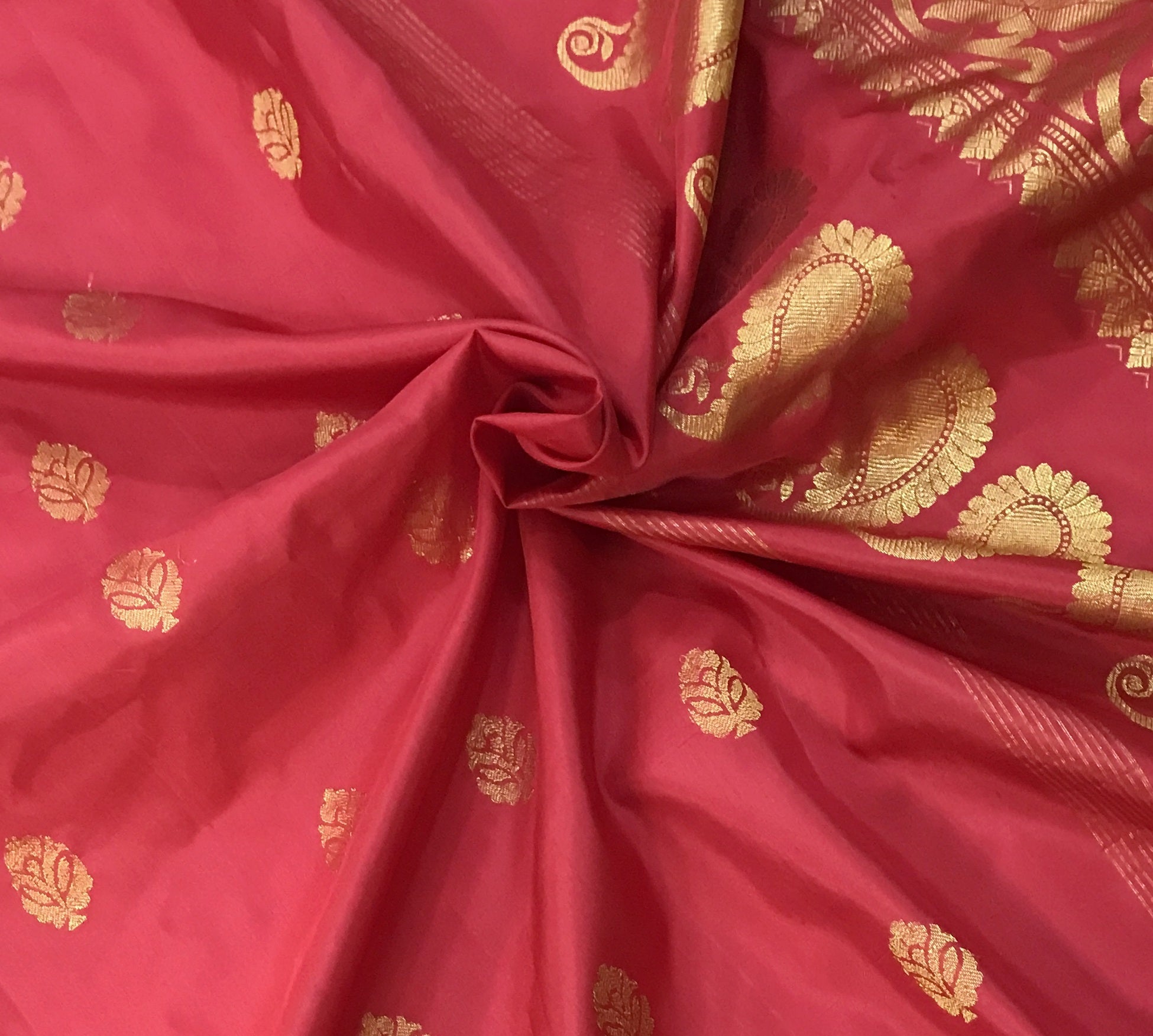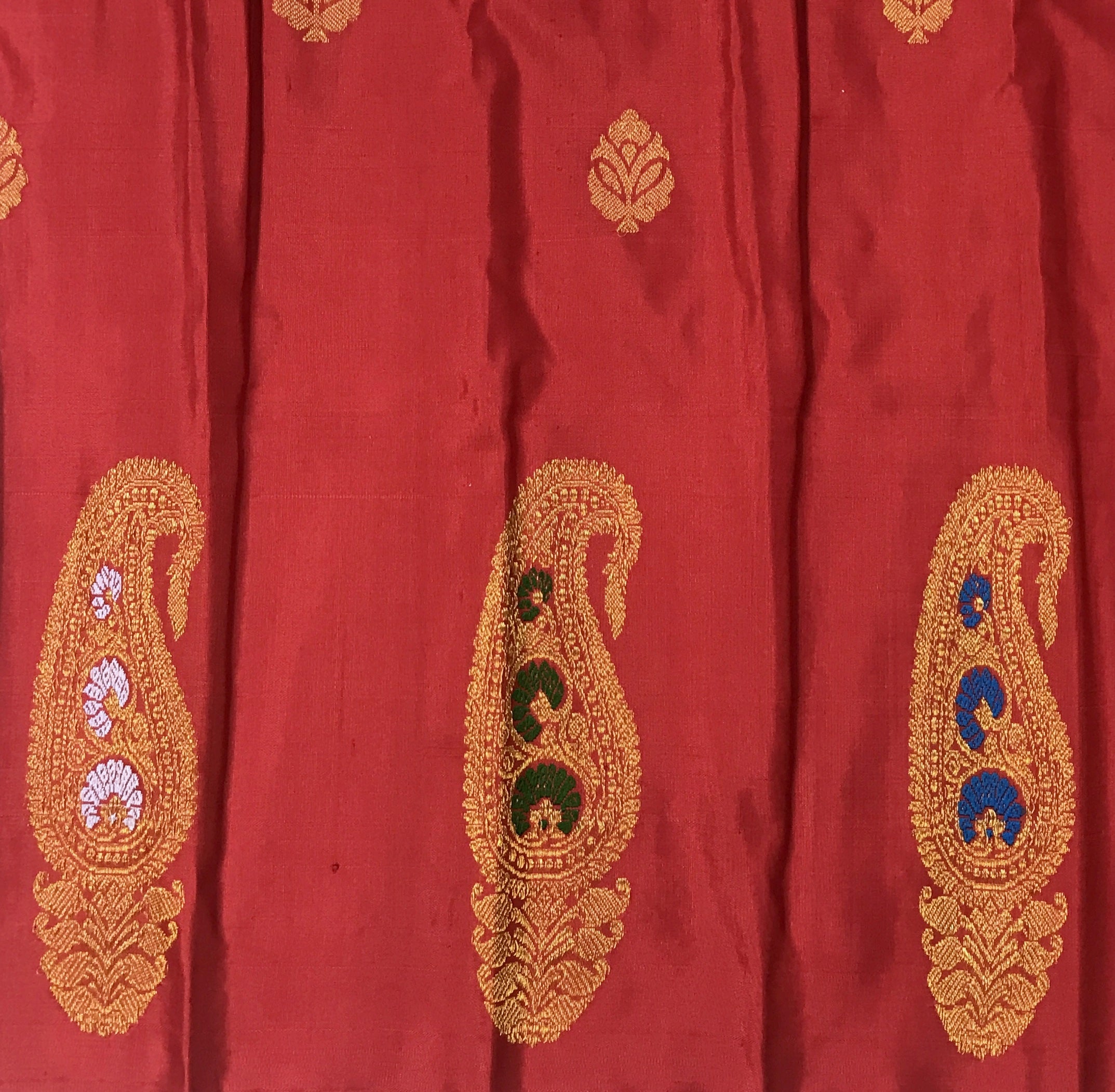 A very beautiful red coloured 'designer border Gadhwal' reflects the weaver's dedication and hard work. The intricate floral butti woven in golden zari thread looks stylish and gives this saree a vibrant and festive vibe The intricates borders, that is, a multicolor koyari designer border with beautiful meenakari, look distinctive and complementing each other.