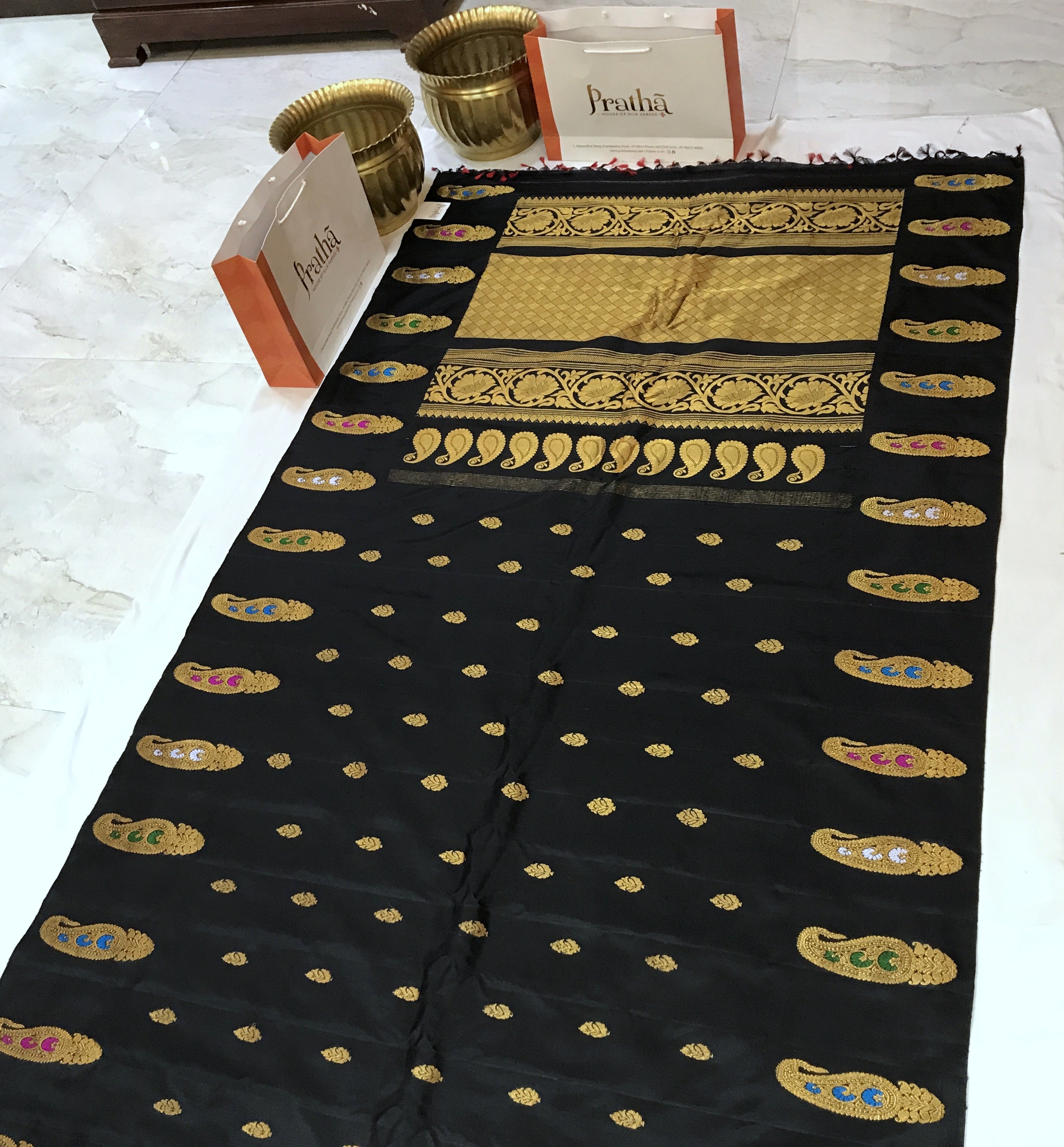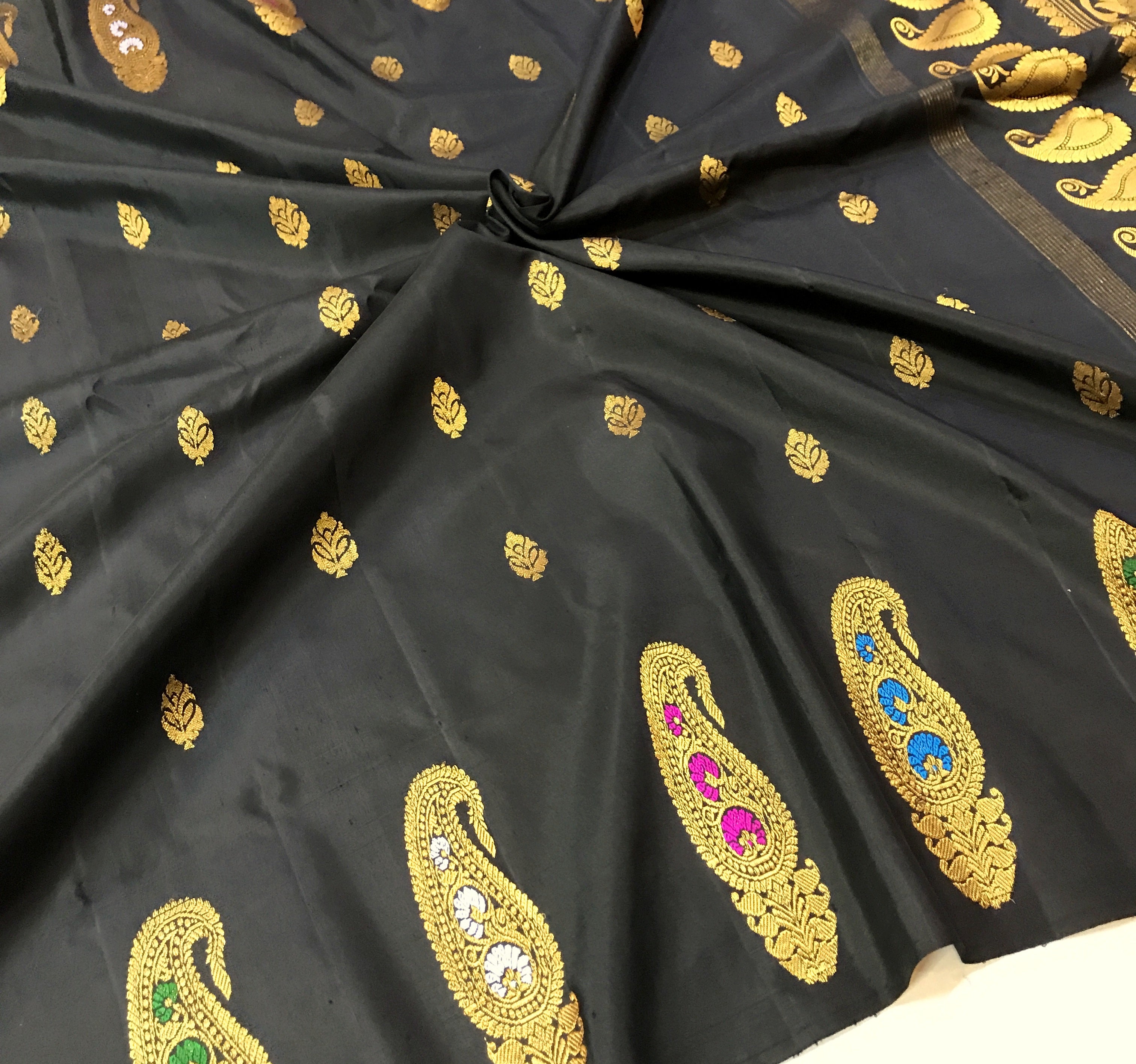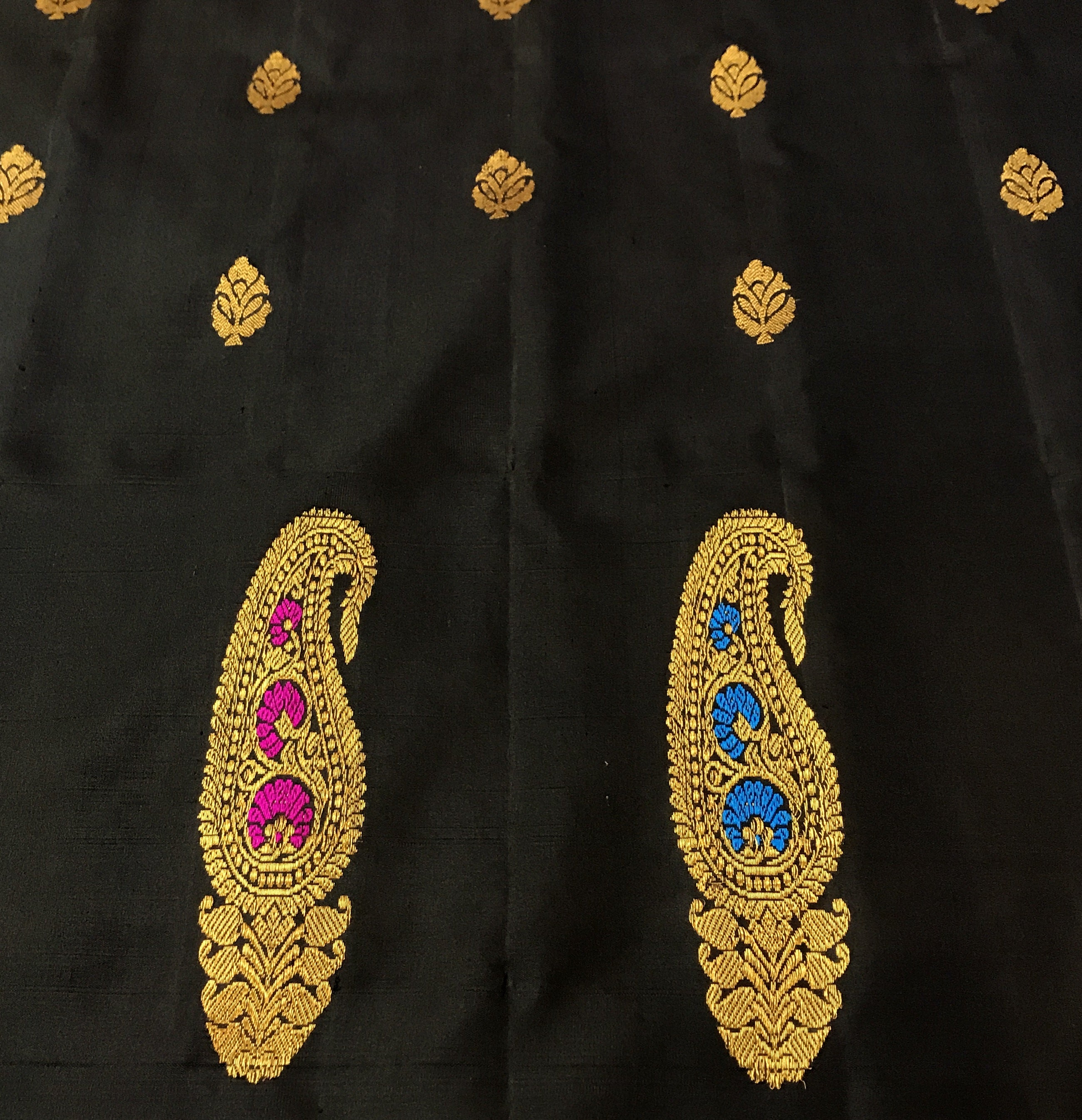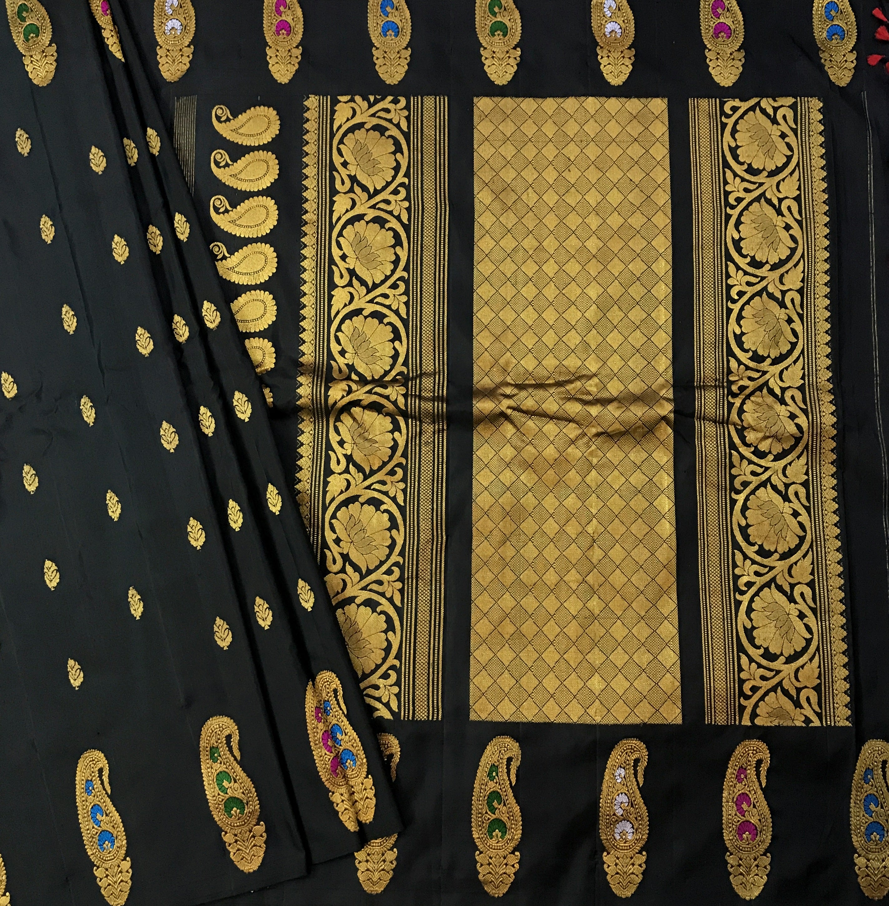 A very beautiful black coloured 'designer border Gadhwal' reflects the weaver's dedication and hard work. The intricate floral butti woven in golden zari thread looks stylish and gives this saree a vibrant and festive vibe The intricates borders, that is, a multicolor koyari designer border with beautiful meenakari, look distinctive and complementing each other.