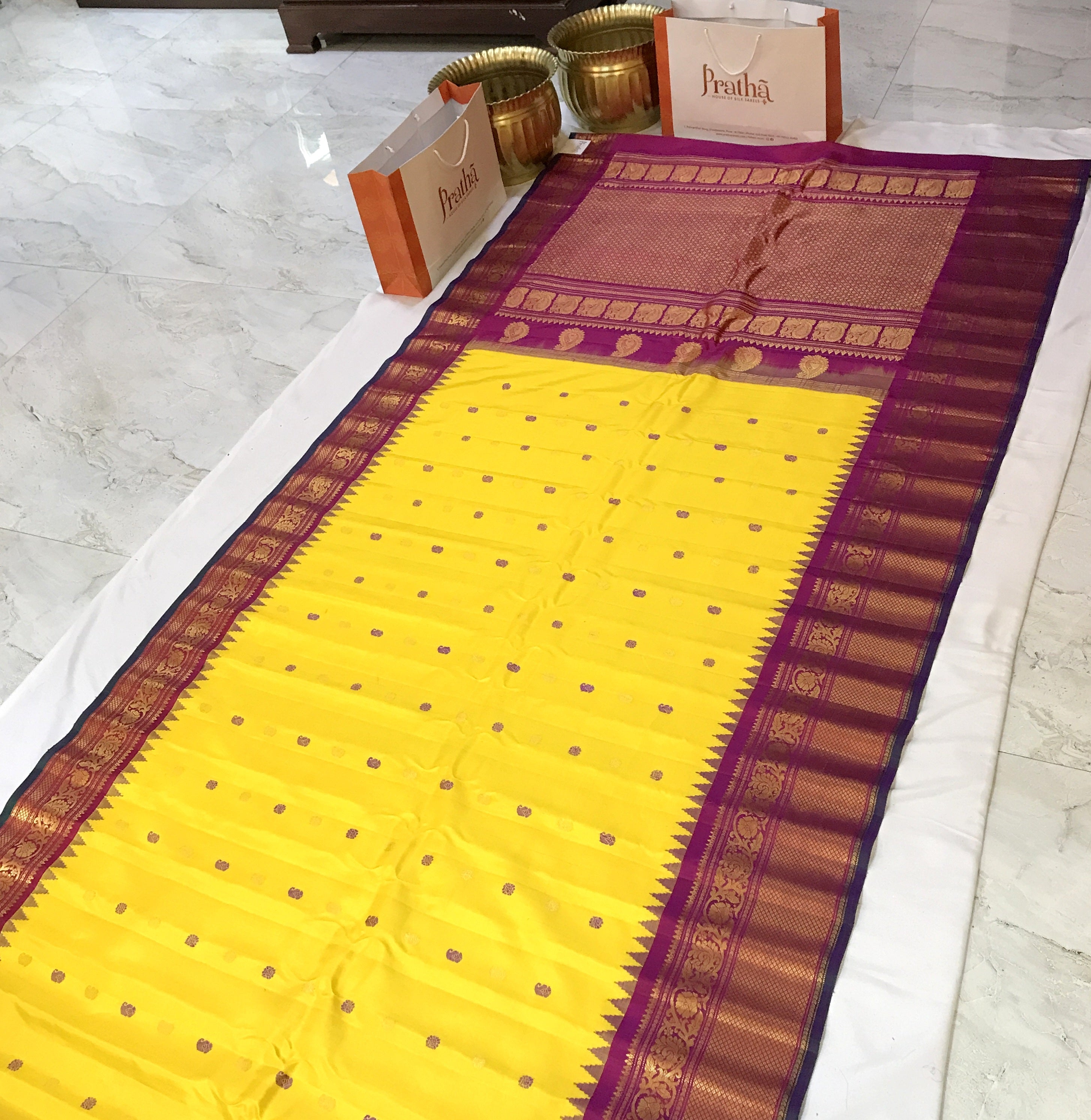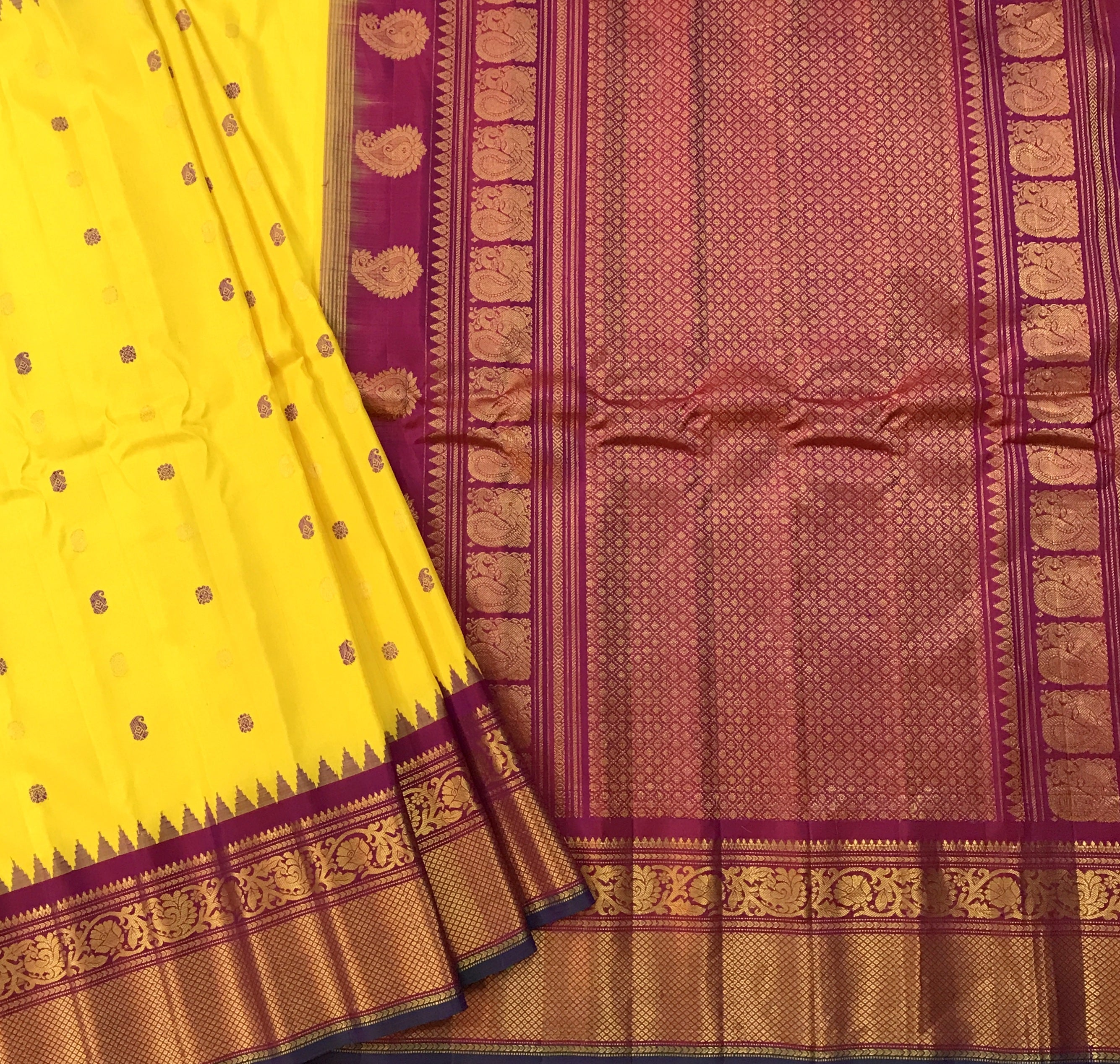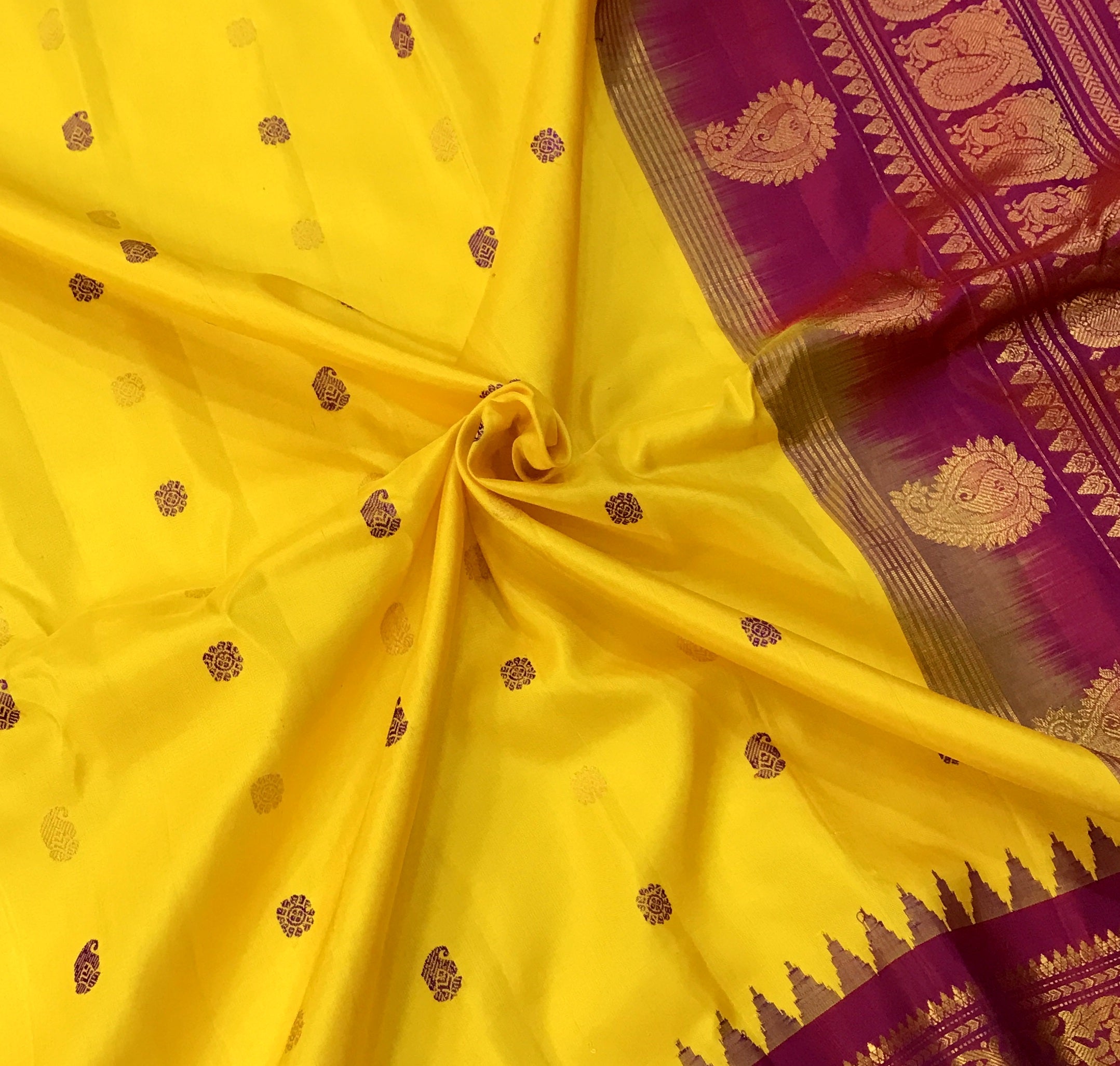 The soothing shade of yellow and pink combination wins hearts across traditions and cultures! This beautiful Gadhwal, the 'floral' design alternate intricate resim butti and butti woven in zari ,the pink golden zari border with an elaborate temple design make this weave a charmer! The intricately woven pallu adds to the beauty of this saree!