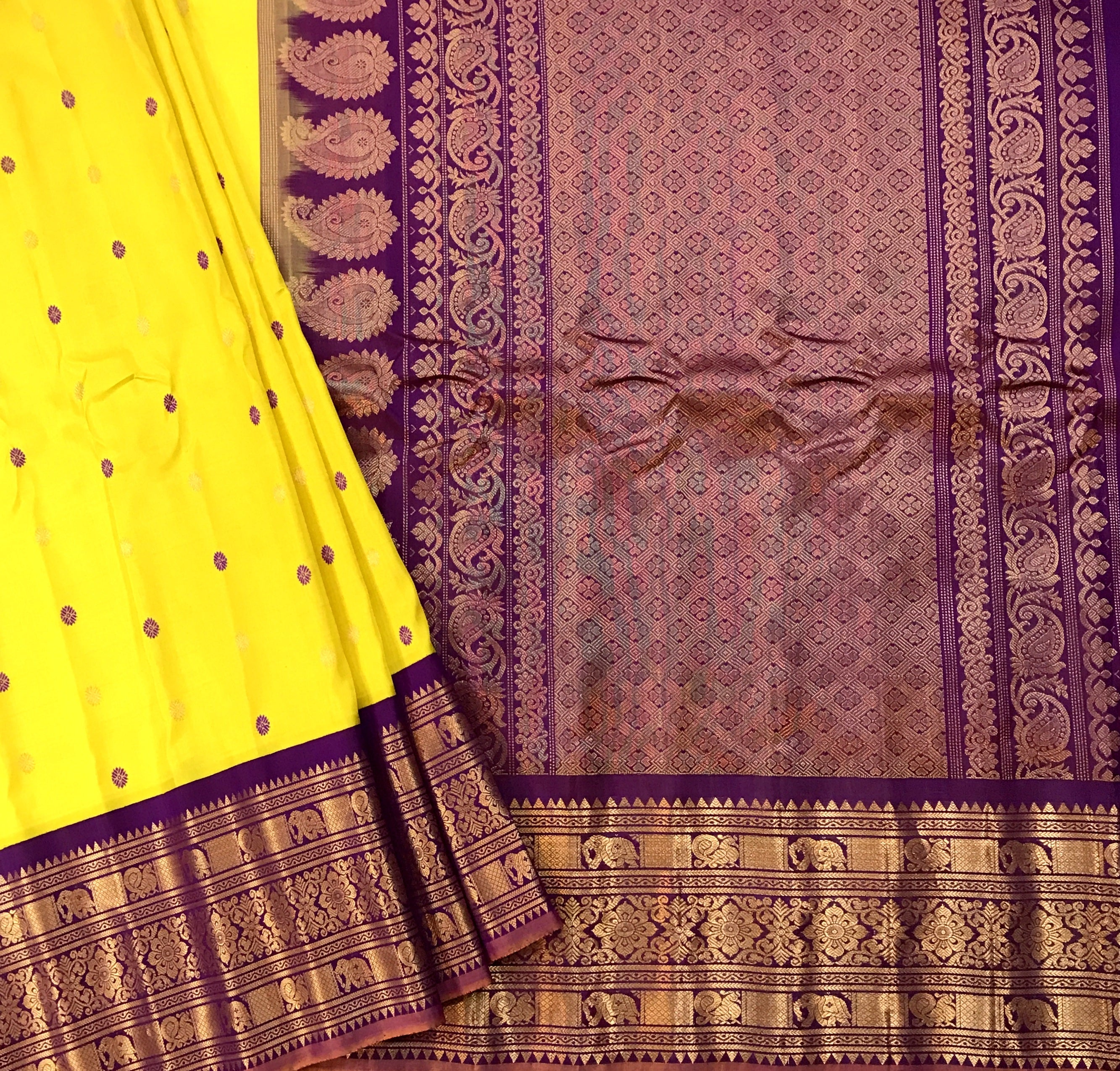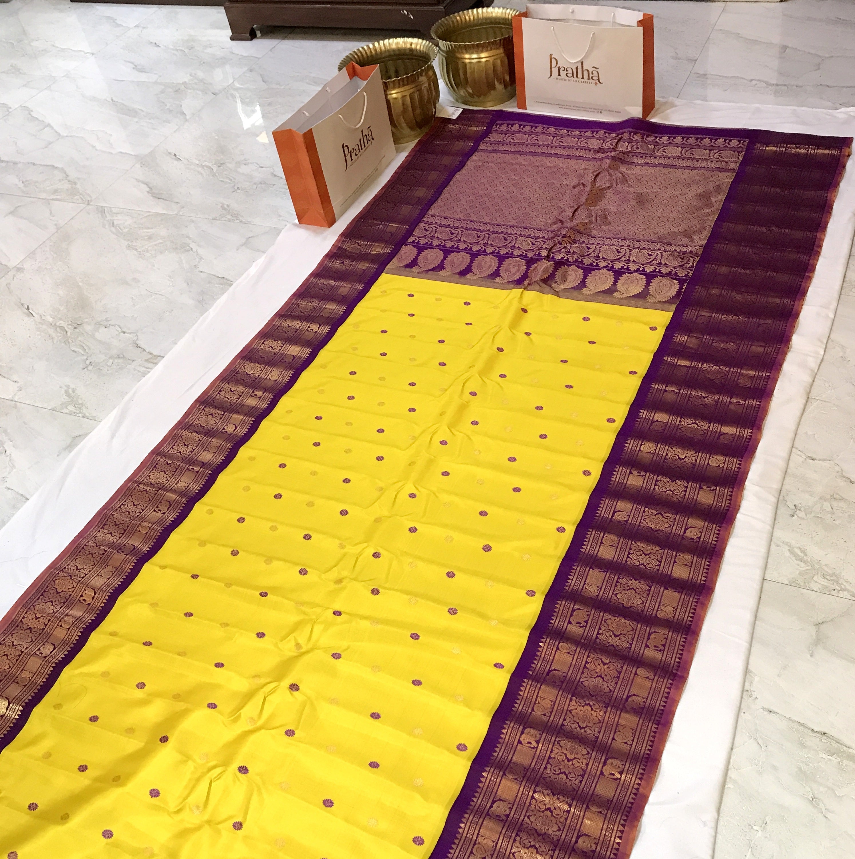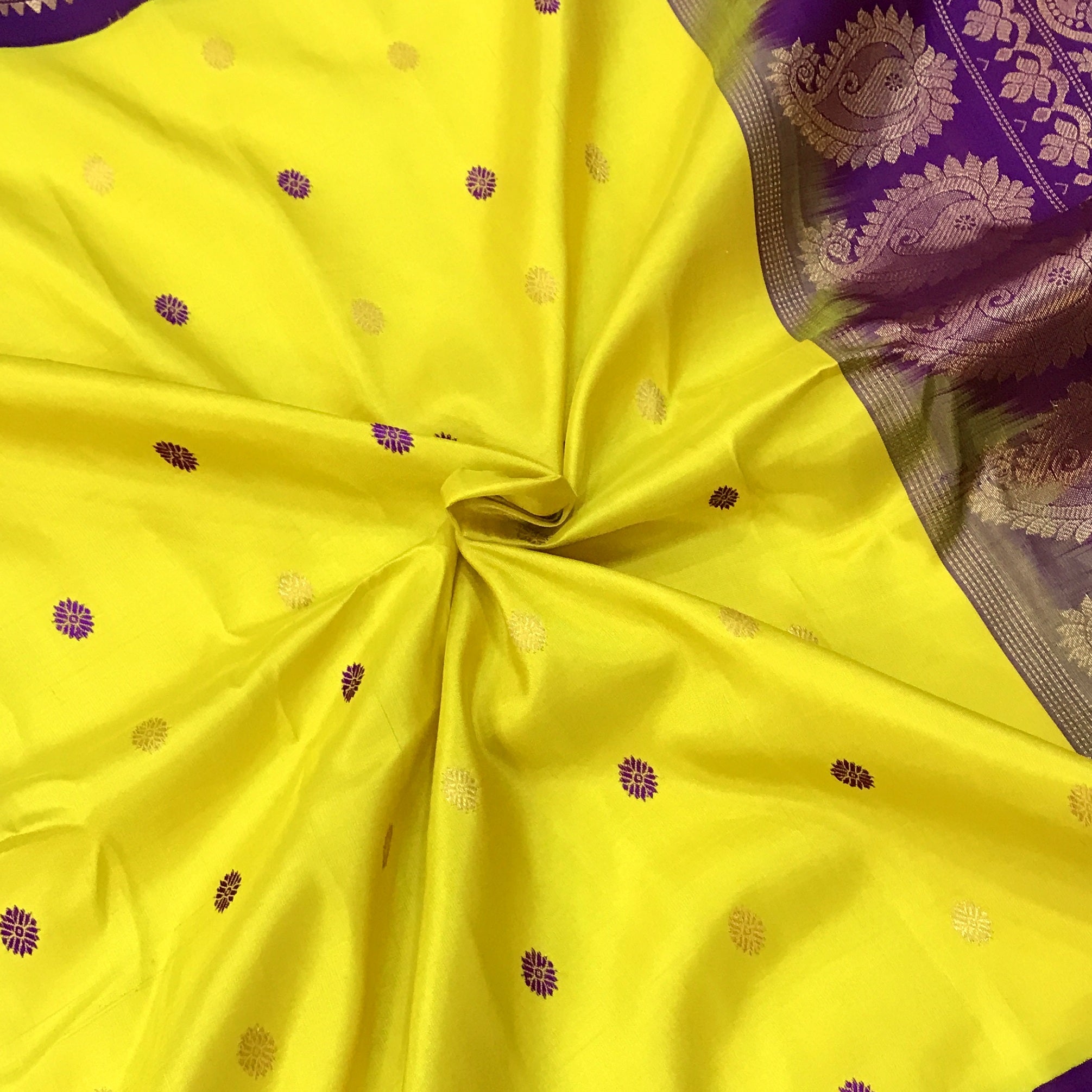 This is an outstanding and unique combination in Gadhwal looks great on bride girl. The fresh shade of yellow with purple coloured contrast broad border and zari pallu which makes this Gadhwal look very classy. The intricacy woven 'floral' butti is extremely uncommon and attractive woven in golden zari thread and purple thread .This stunning combination makes this weave a perfect wedding wear.