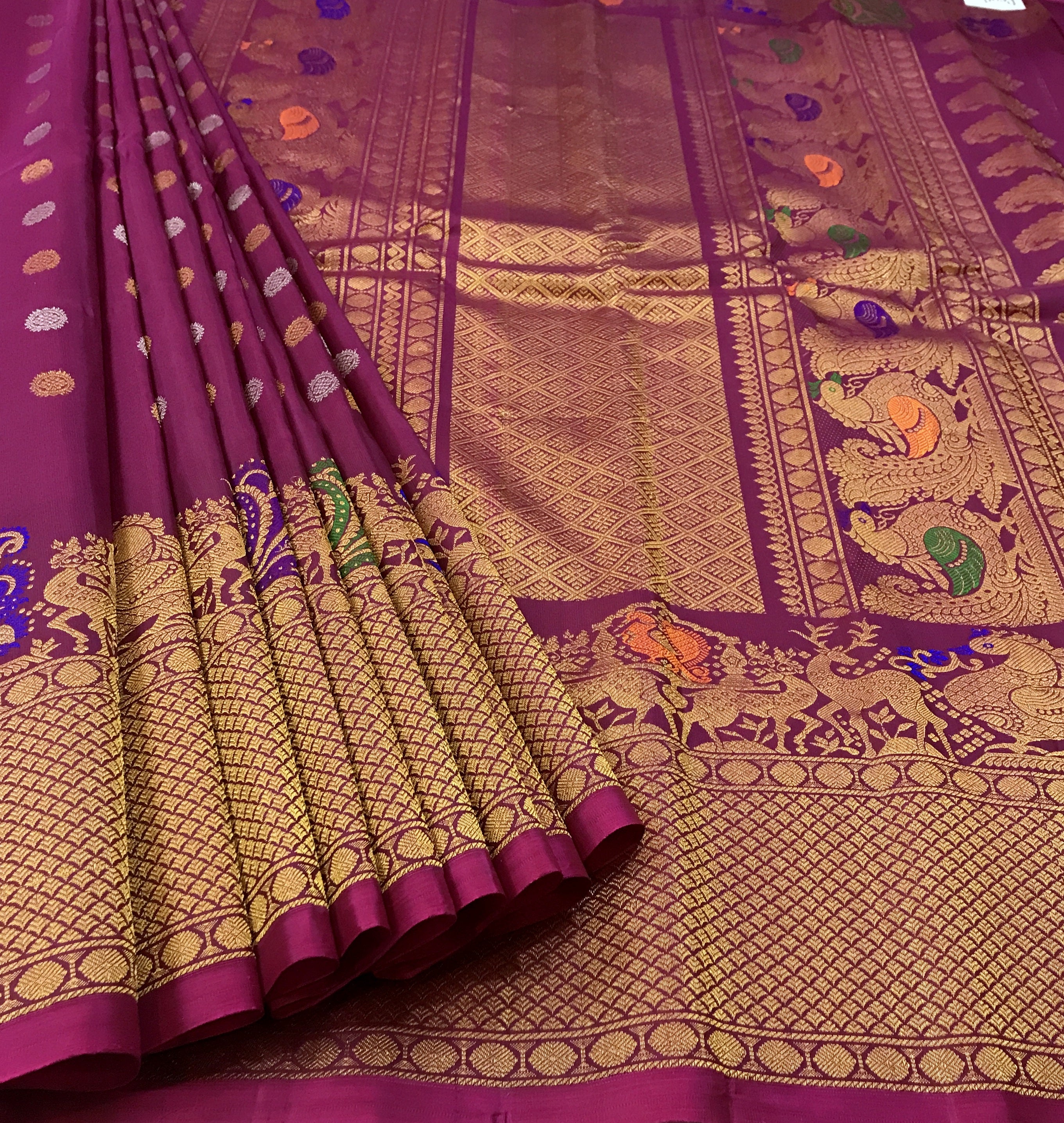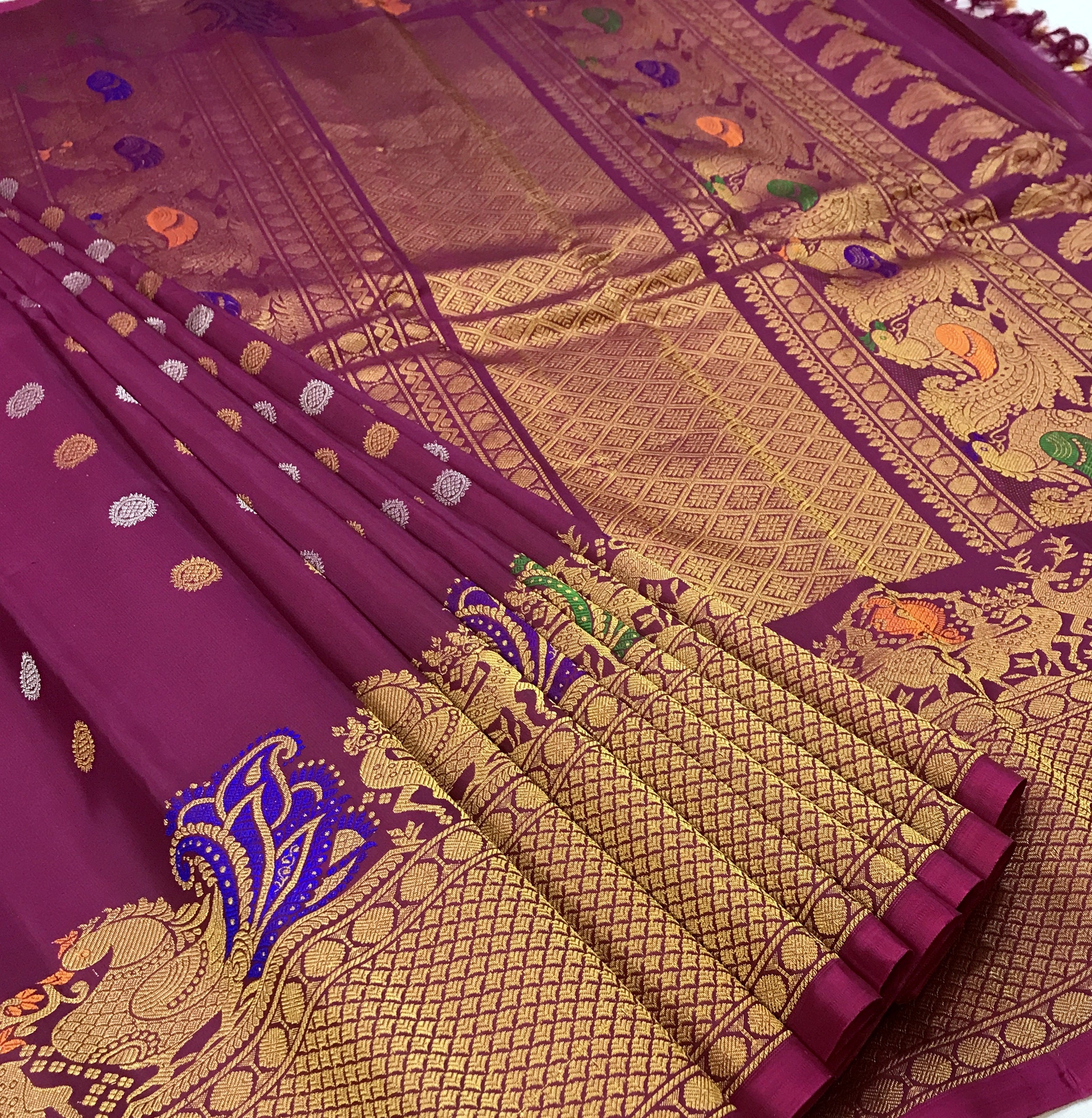 This phenomenal colour combination of magenta with a broad designer border and pallu makes this Gadhwal super special! The unique and intricate small butti (motifs) running evenly woven in golden-silver zari designs above the designer Gadhwal border looks classy. The stunning border of this Gadhwal with meenakari ( weaving in different coloured silk threads) steals one's heart!