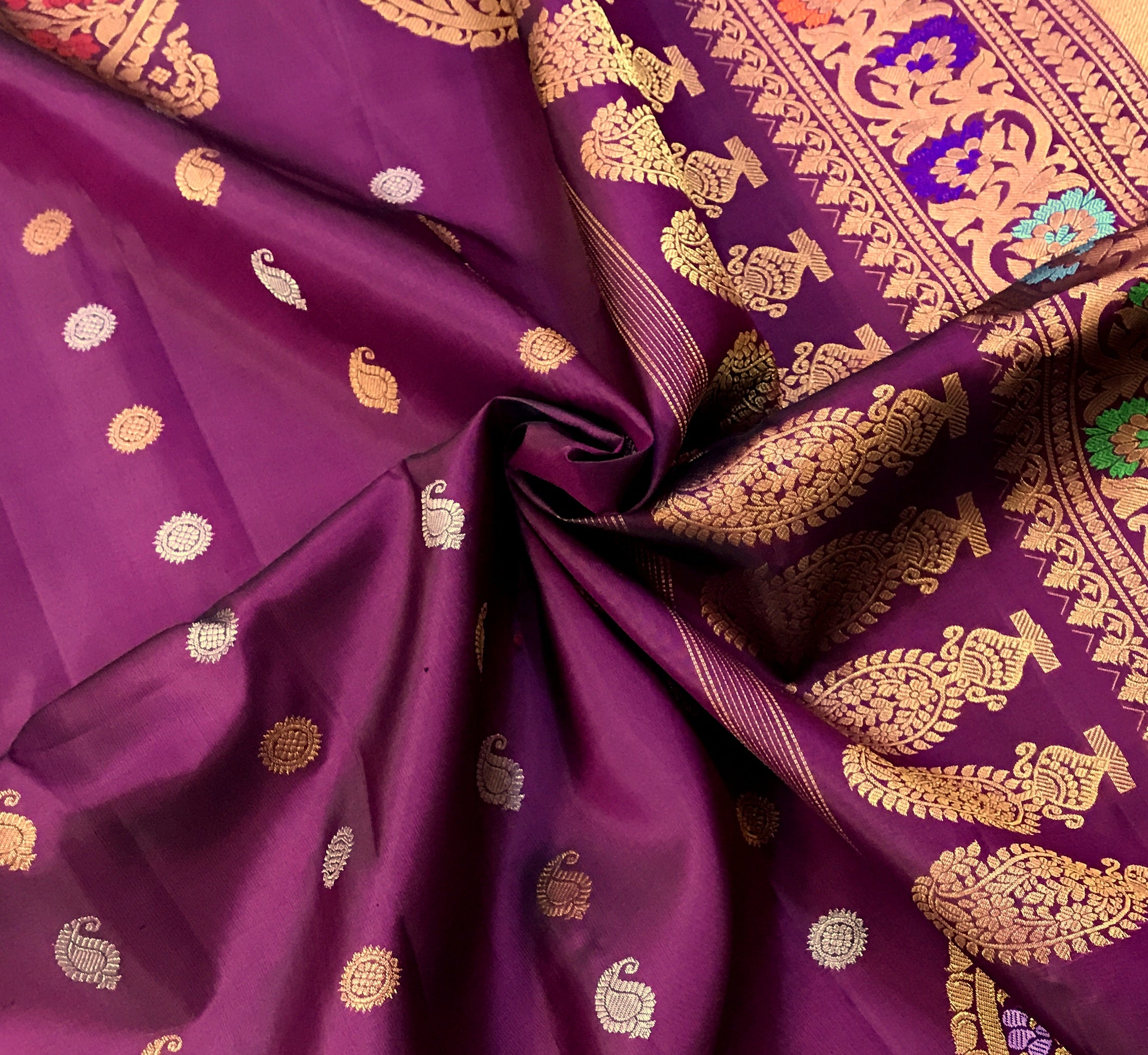 A very fabulous and attractive colour combination of Gadhwal! Fresh shade of magenta saree with a self coloured designer border is a unique saree. This stunning border in koyari( motifs ) design with beautiful meenakari woven in golden zari blue-orange silk thread with charming golden zari pallu makes this saree class apart! The butti design of this saree is equally beautiful in form of floral-koyari design look festive and grand.