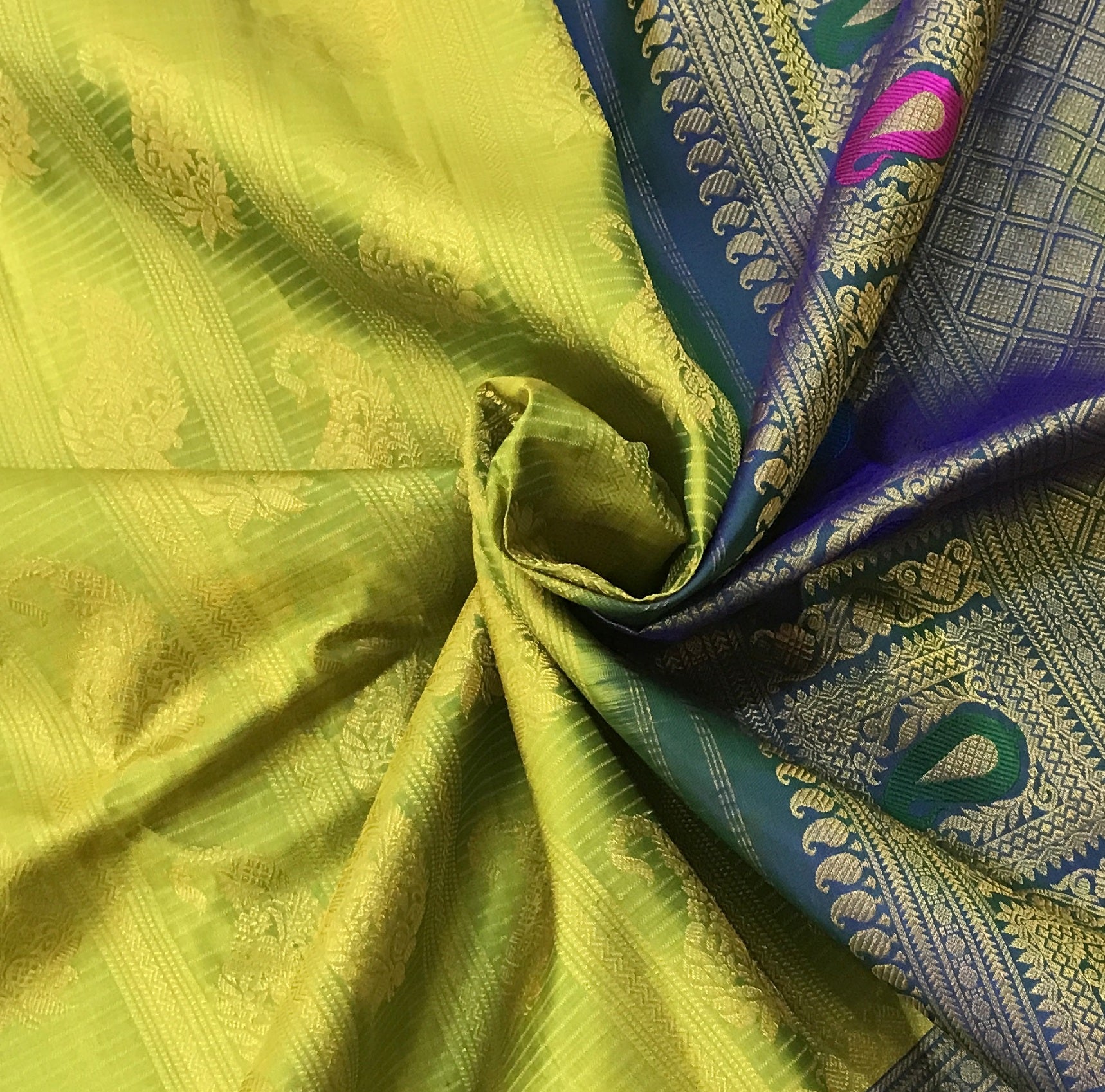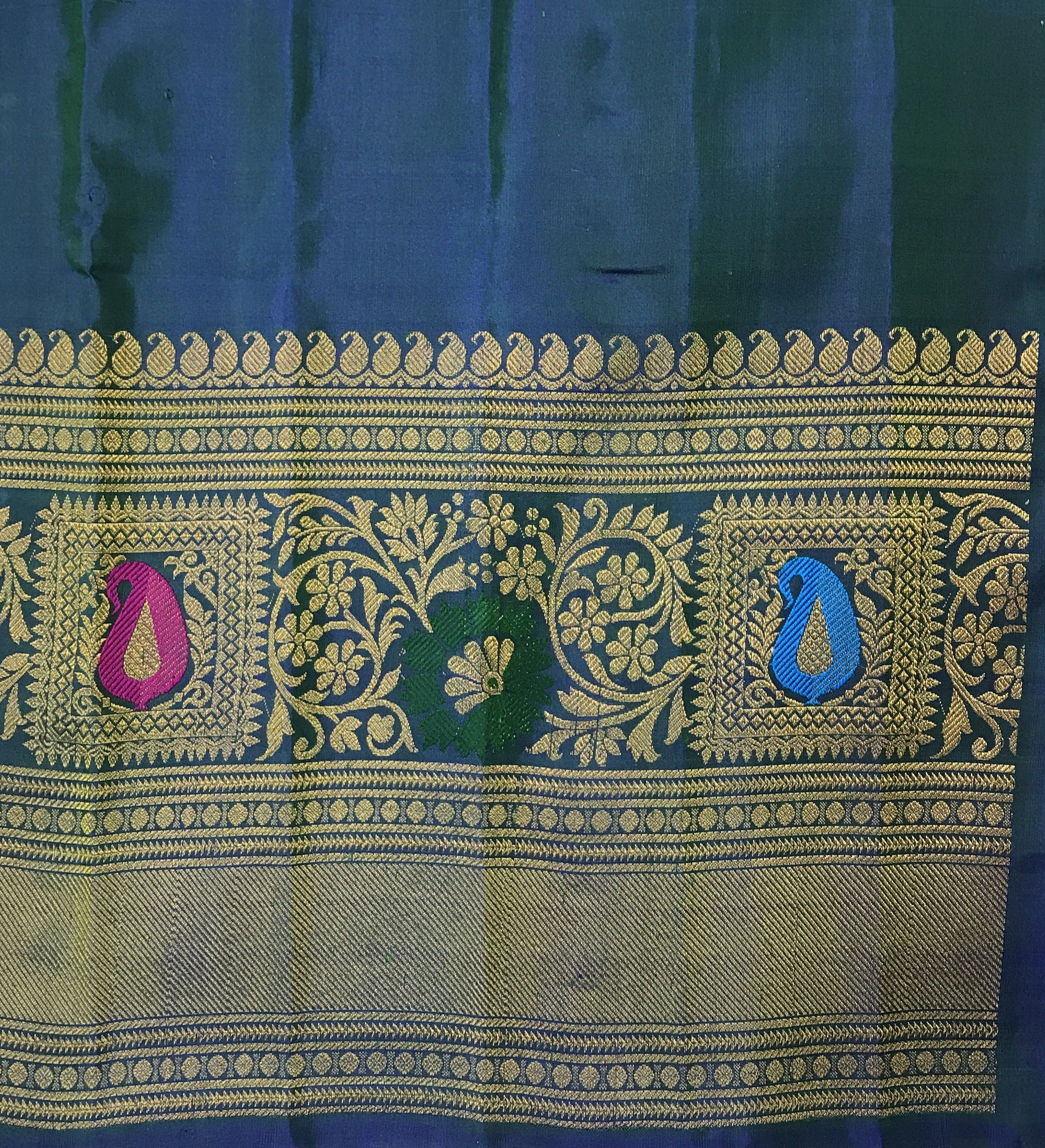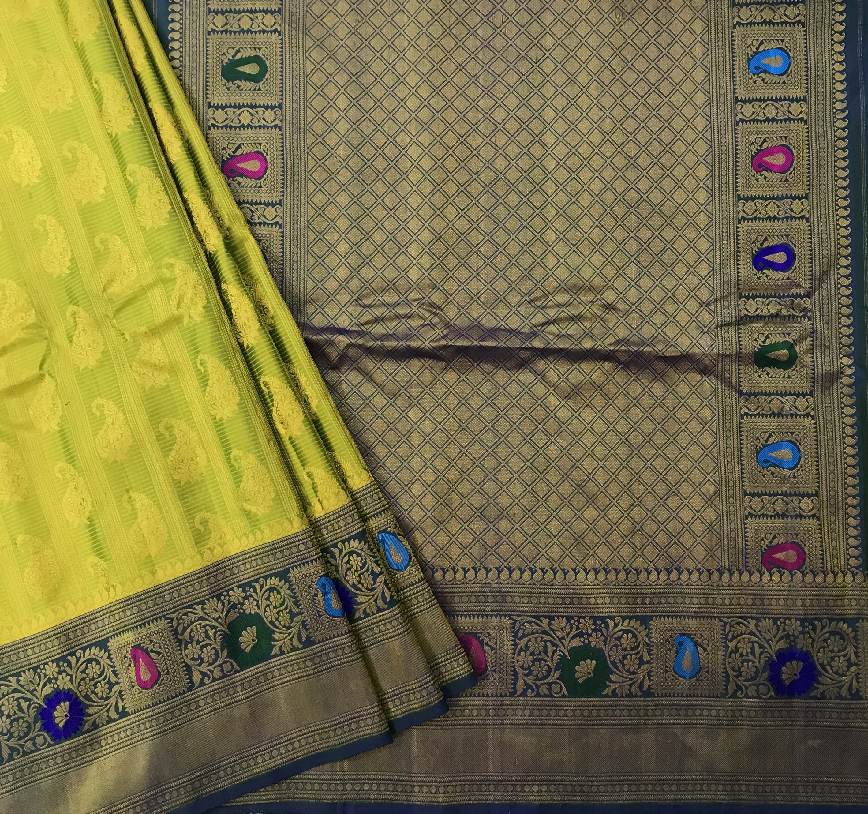 This exquisite oparrot green 'designer border Gadhwal' saree is a testament to the weaver's skill and dedication. The saree features intricate all over koyari work that adds a touch of elegance and a festive aura. The intricate borders, showcasing a vibrant multicolor designer floral motif with stunning meenakari detailing, stand out and harmonize beautifully. The rich parrot green shade is perfectly paired with the contrasting blue, creating a striking visual appeal.