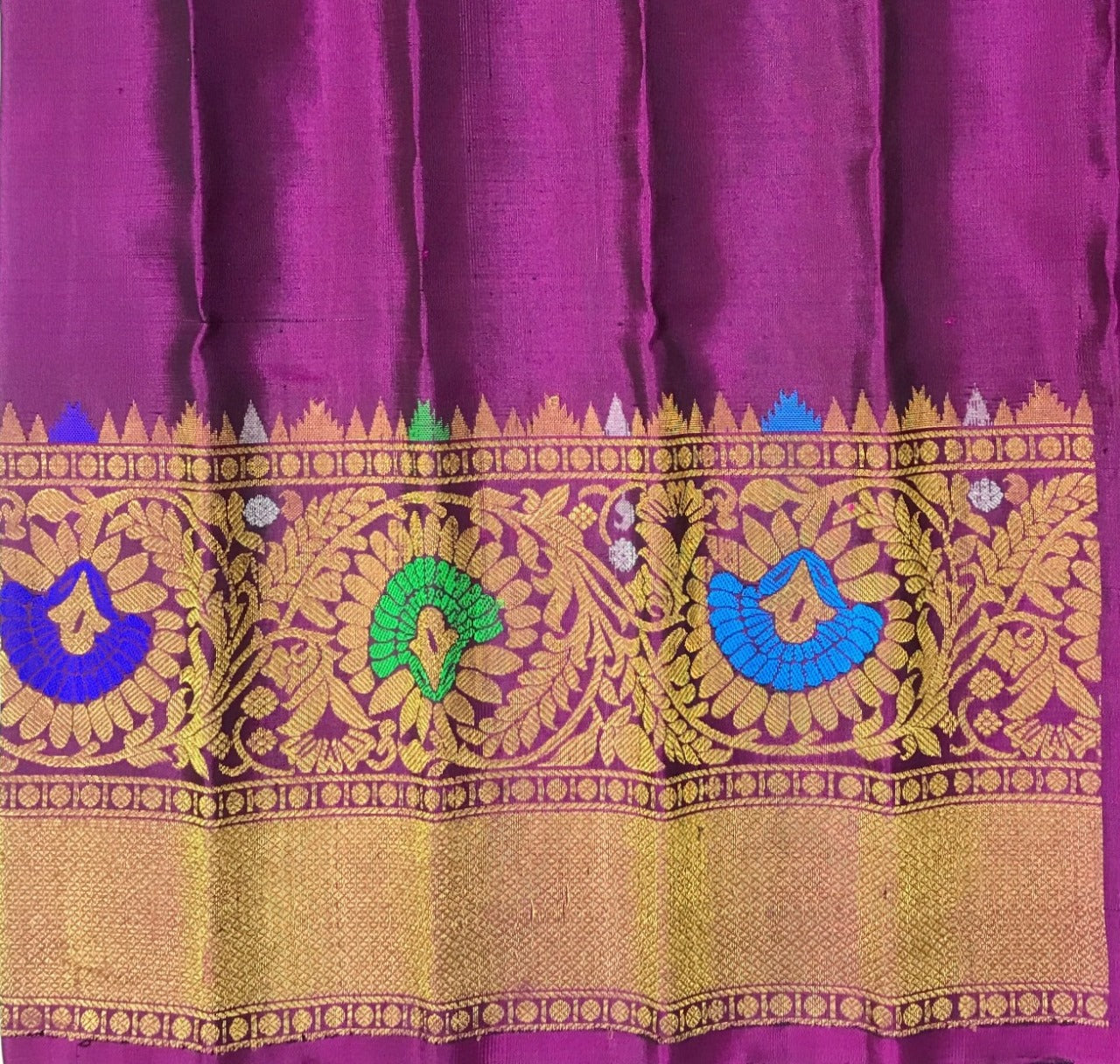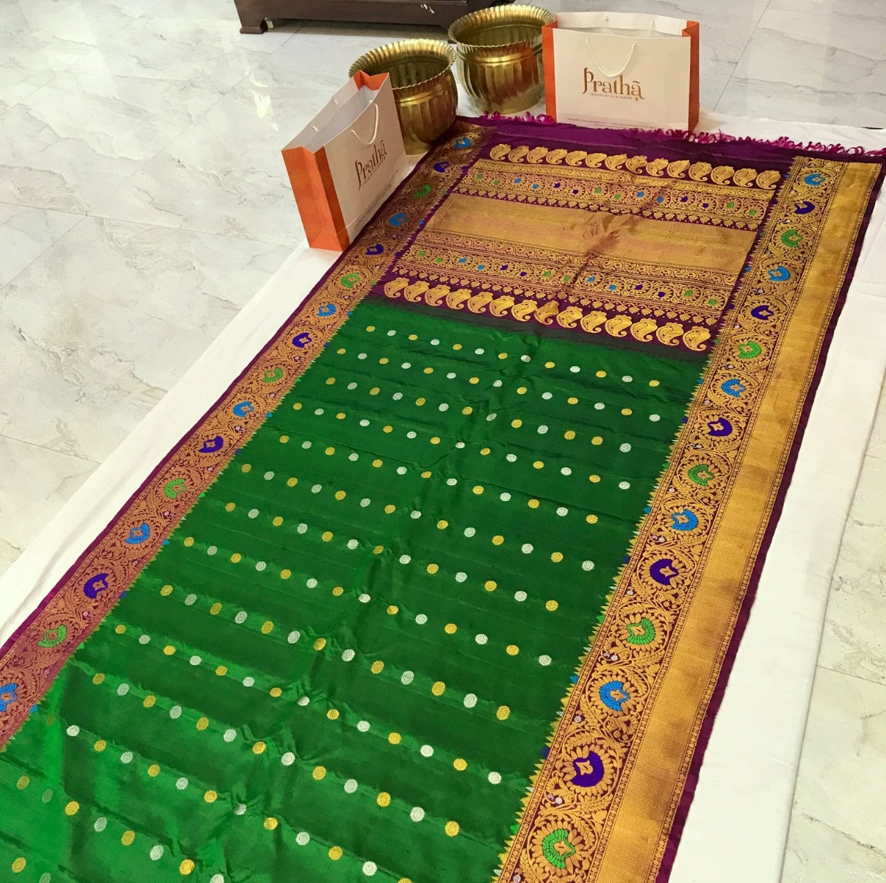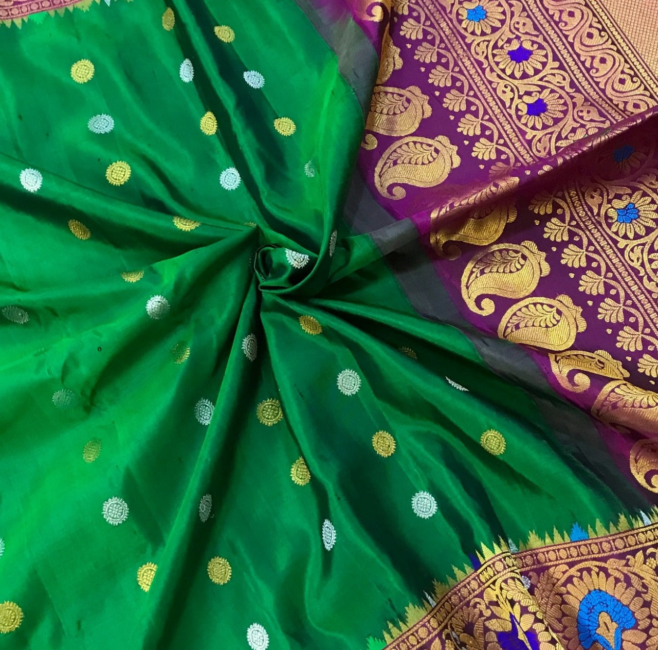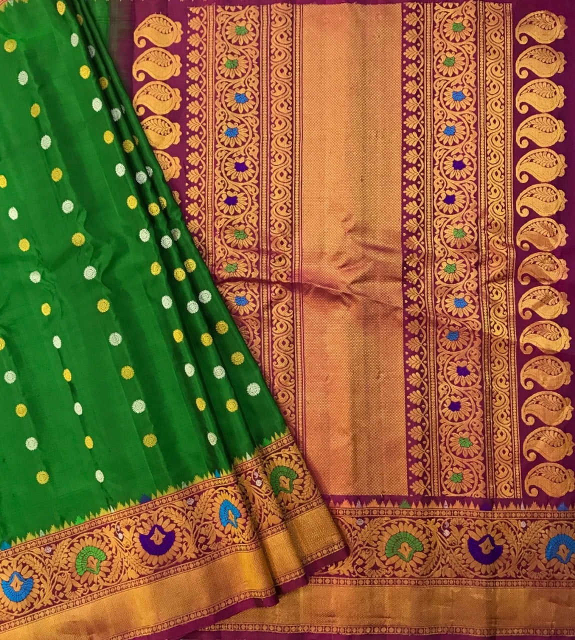 A fresh shade of green and fantastic bright magenta border in pure silk Gadhwal looks beautiful in day light as well as night time. This one is special weave, the floral butti evenly woven in silver as well as golden zari thread through the saree give it festive touch. The meenakari golden zari border and the traditional pallu complement beautifully with this saree. This is the perfect choice for someone who is looking for traditional saree.