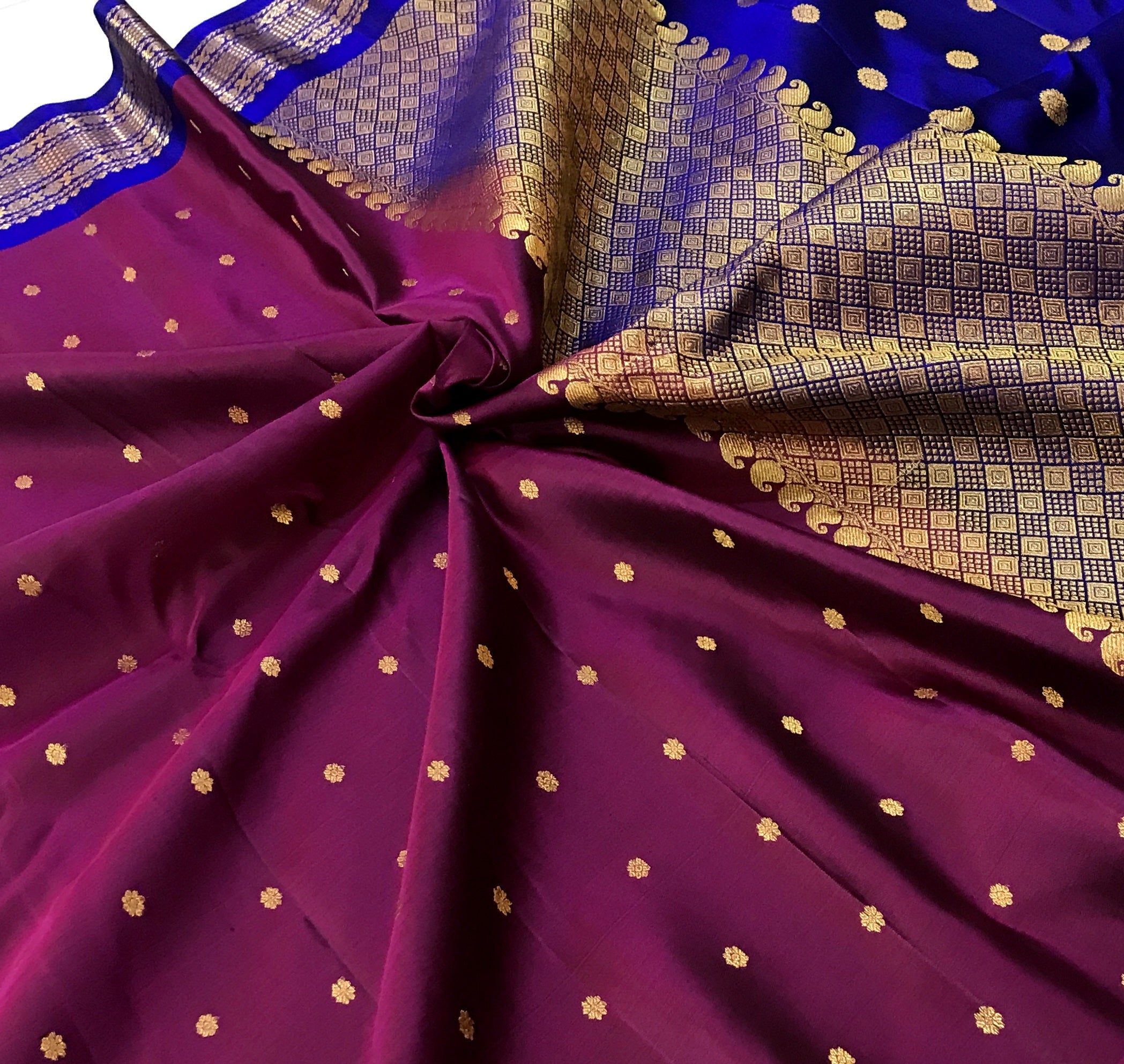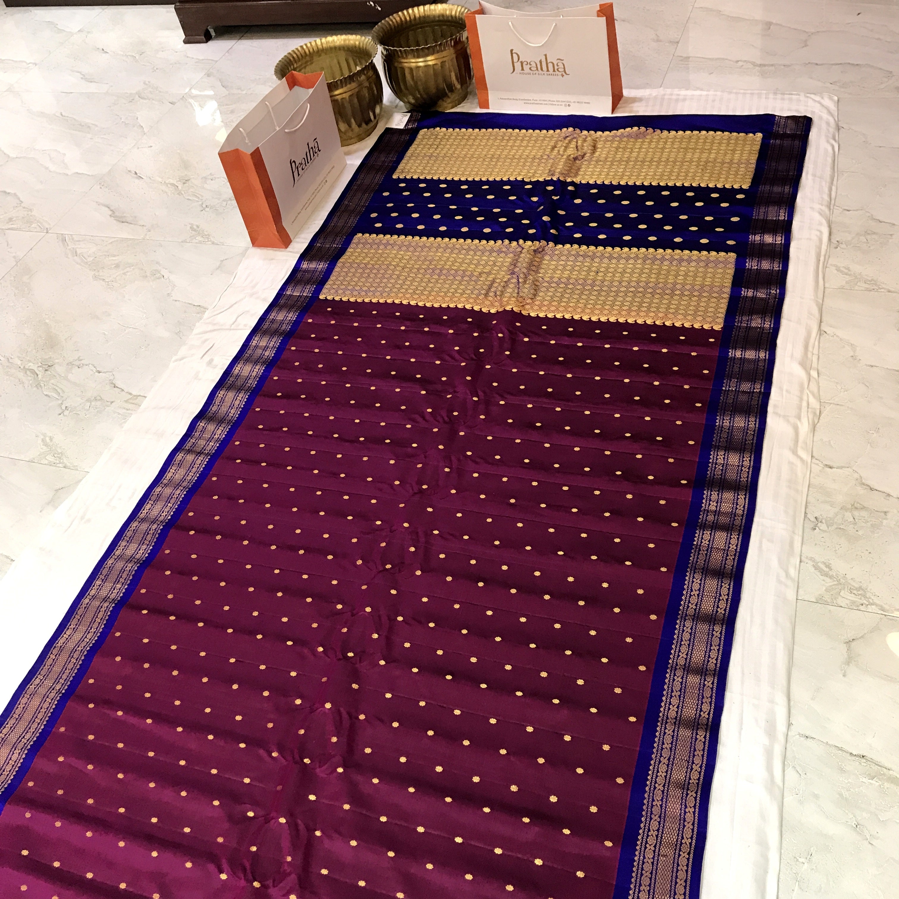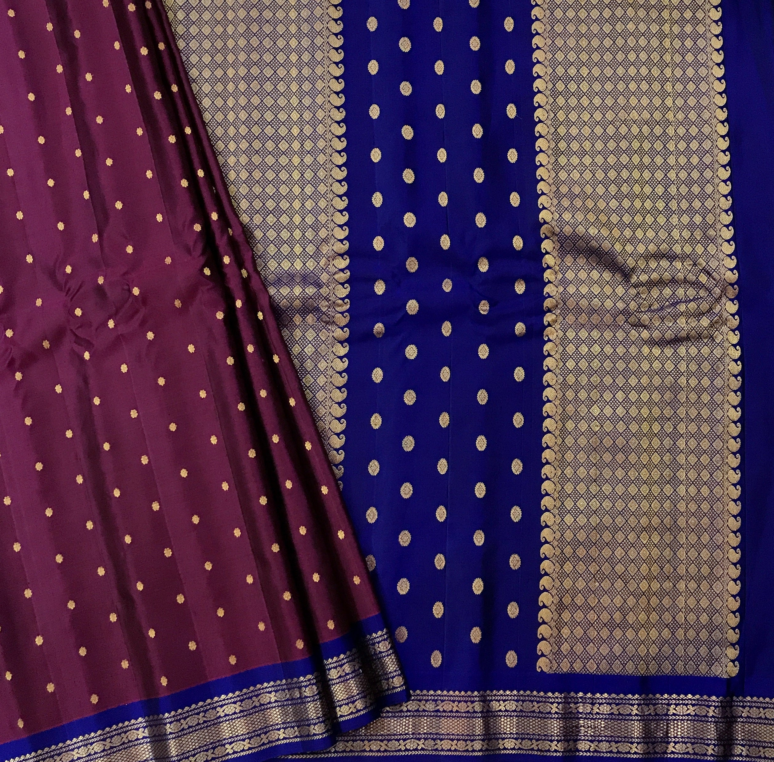This saree truly embodies elegance and festive charm! The stunning combination of deep wine and vibrant royal blue creates a rich visual appeal, beautifully elevated by the golden zari woven throughout the saree. The body features delicate golden butti motifs that add a touch of sophistication, while the contrasting blue panel enhances its uniqueness and classic beauty. The intricately woven zari border—adorned with traditional motifs—adds grandeur to the saree, making it perfect for special celebrations. The zari pallu, designed with fine geometric brocade patterns, reflects impeccable craftsmanship and gives this saree its regal finish. Every detail speaks of tradition blended with timeless artistry.