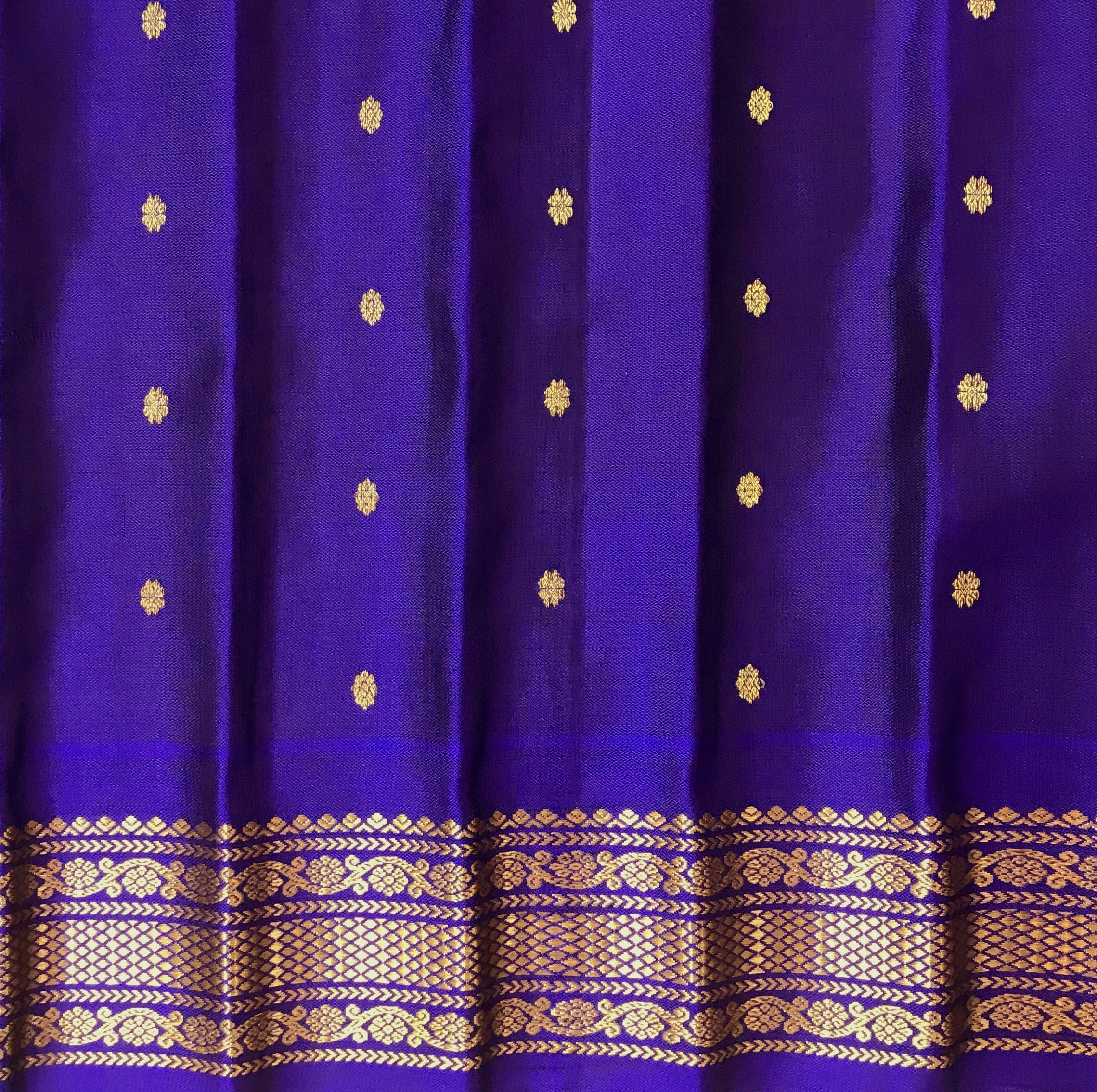 Blouse Colour: Contrast (Royal blue with golden zari border)