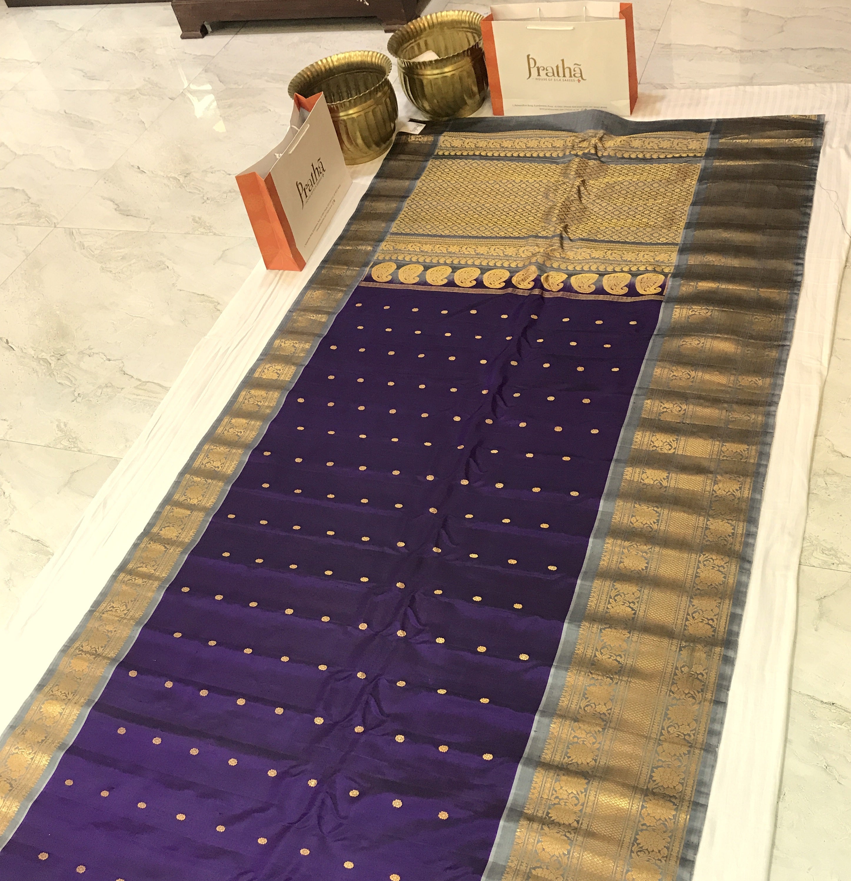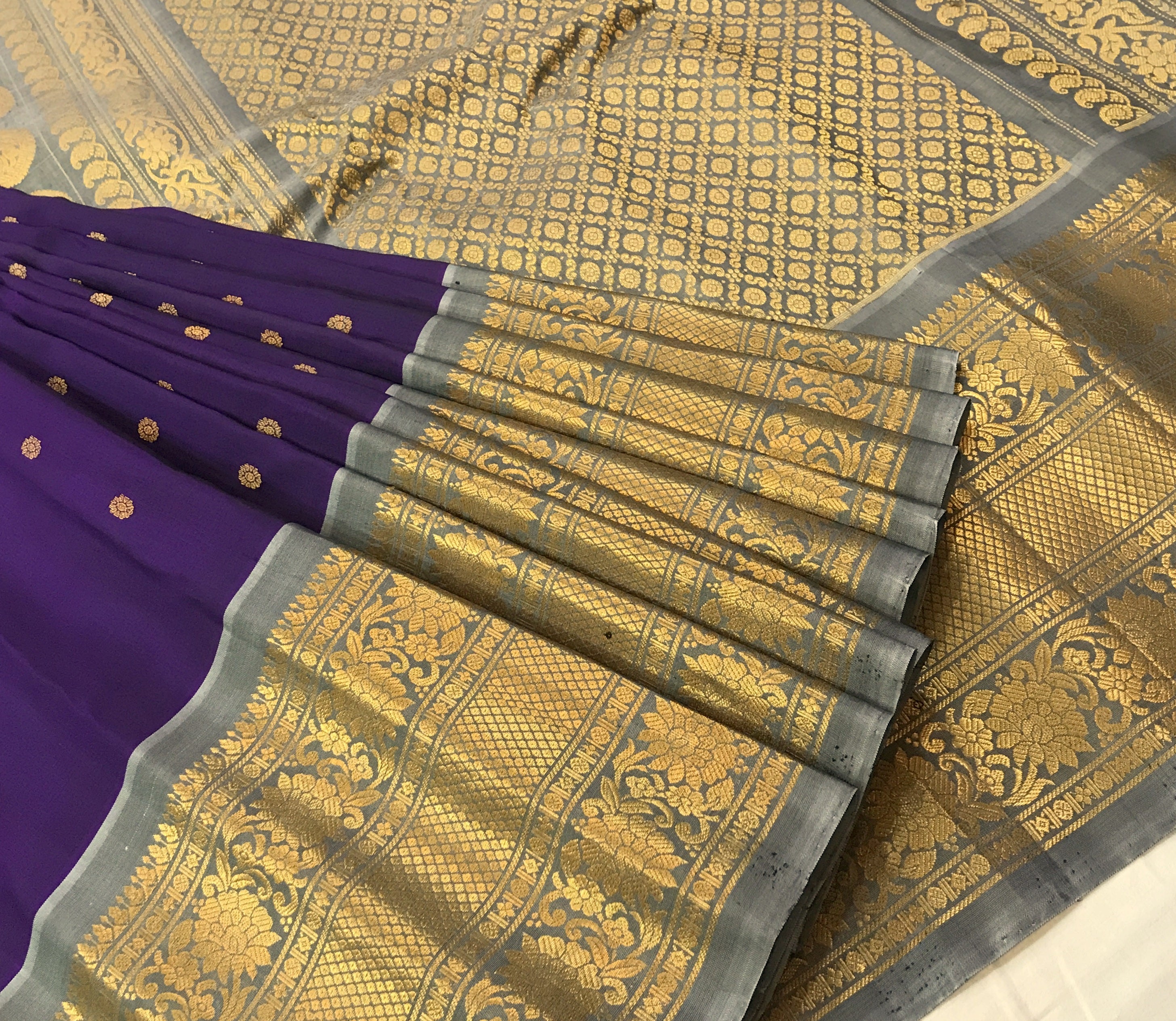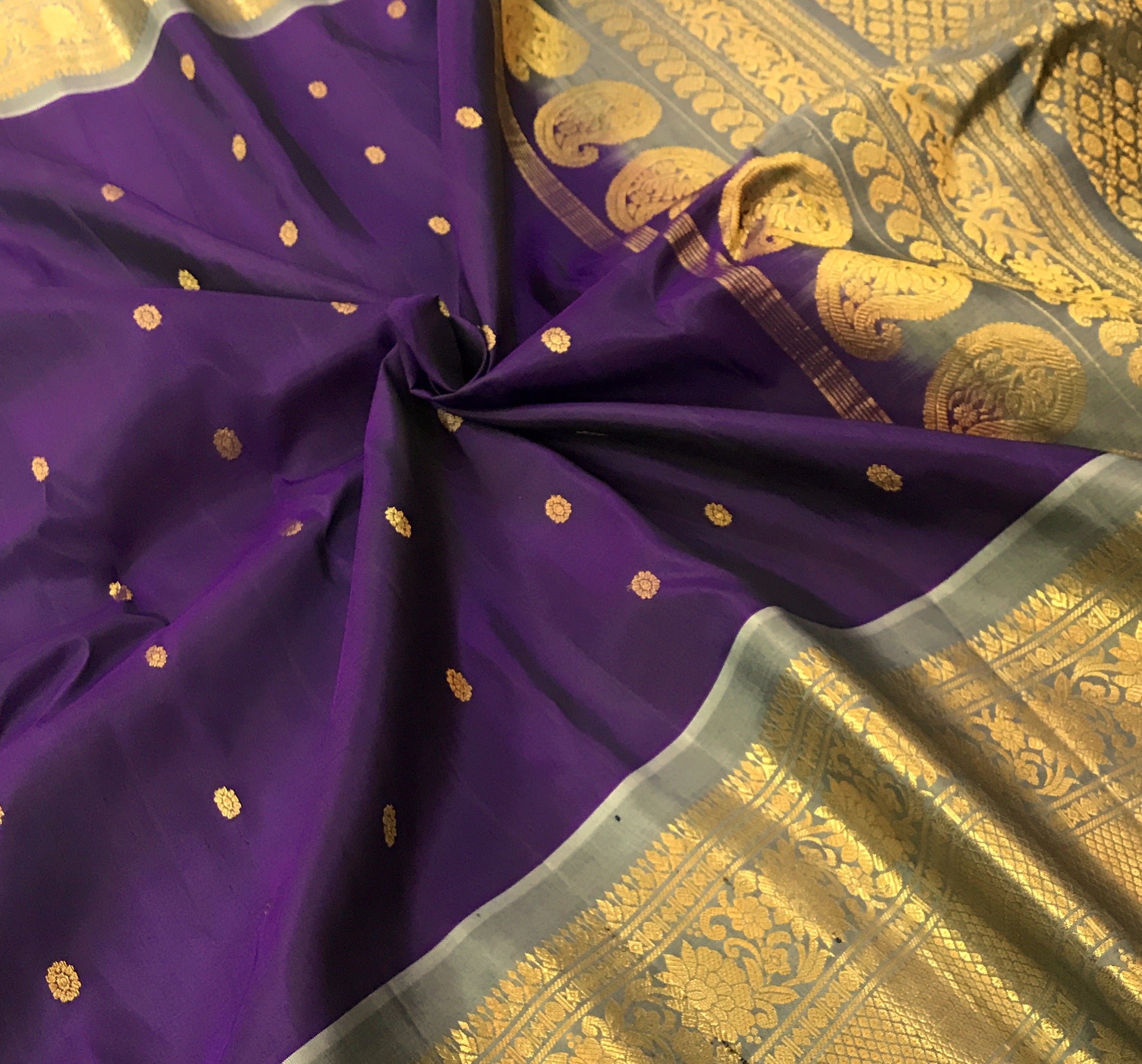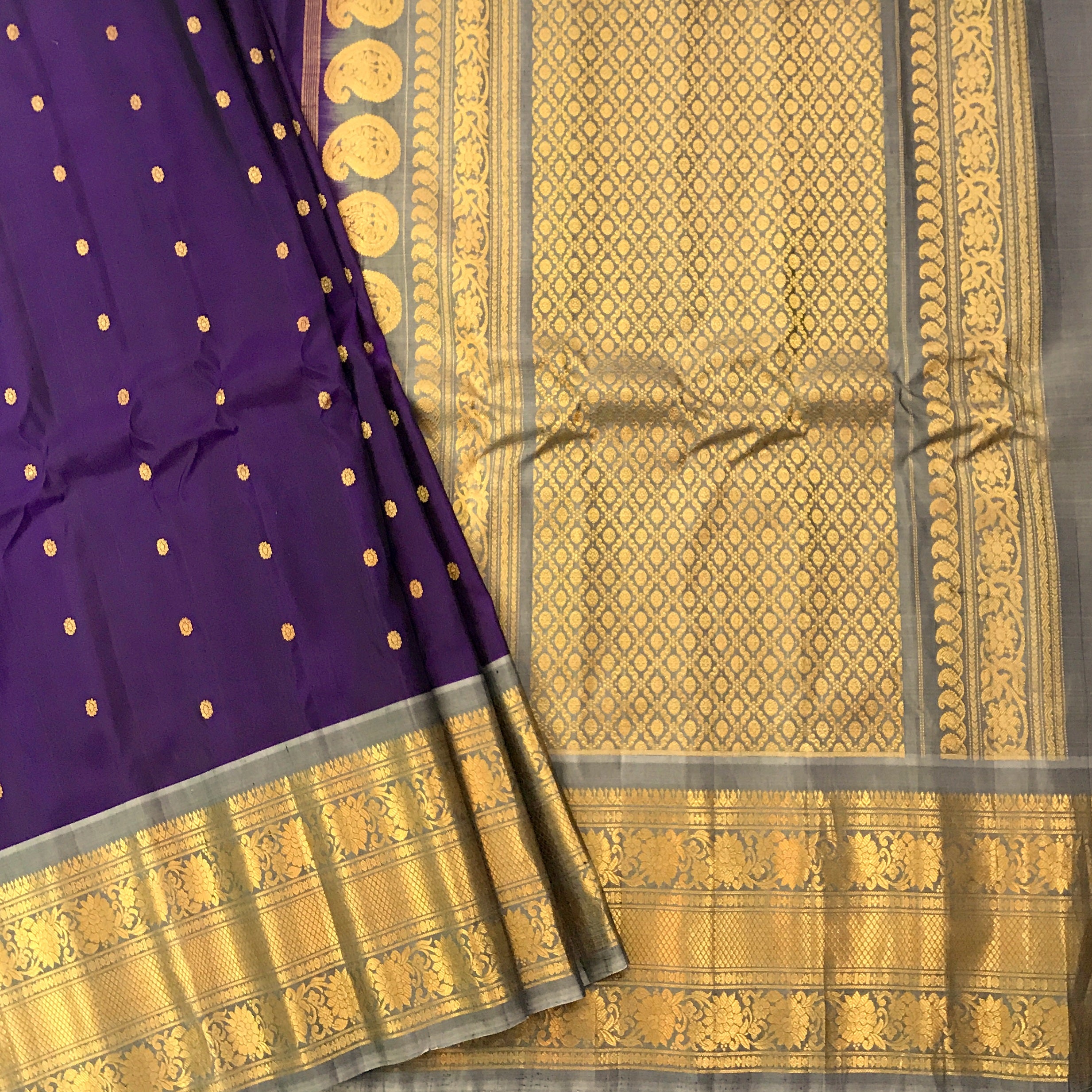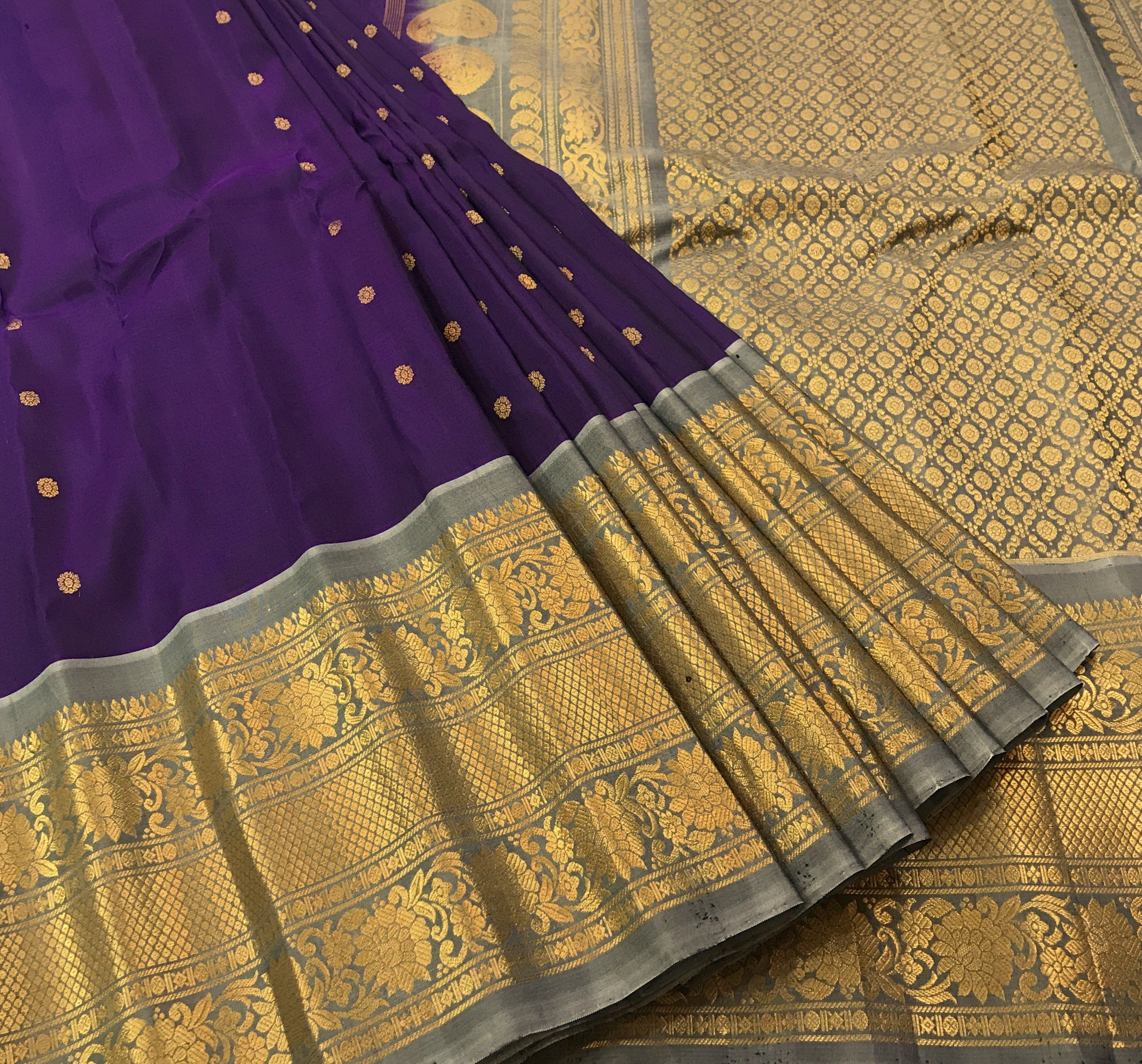This saree exudes timeless grace and regal charm! The rich deep purple body, adorned with delicate golden butti, looks vibrant and sophisticated. Paired beautifully with the elegant silver-grey border, the saree stands out with its intricately woven golden zari patterns, floral designs, and fine craftsmanship. The pallu is richly detailed with grand zari weaving, adding a luxurious shimmer and completing its classic traditional appeal. This striking contrast of purple and silver-grey makes it a perfect choice for weddings, festive occasions, and special celebrations.