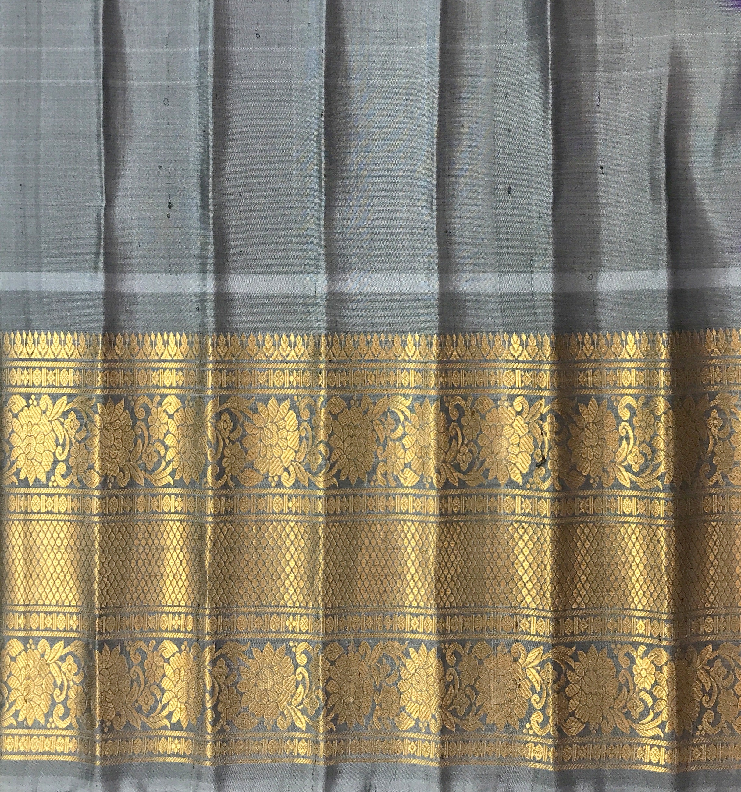 Blouse Colour: Contrast (Silver-grey with golden zari border)