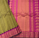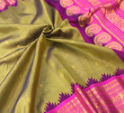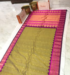 A classic Gadhwal creation, this saree features a delightful blend of colors that is always appealing. The vibrant, fresh shade of olive green beautifully with the pink, creating a stunning visual effect. Made of silk, it drapes elegantly and flows gracefully. The saree boasts a intricate design temple border, complemented by intricate floral butti and a zari pallu, enhancing its overall charm and adding to the serene elegance of this exquisite weave.