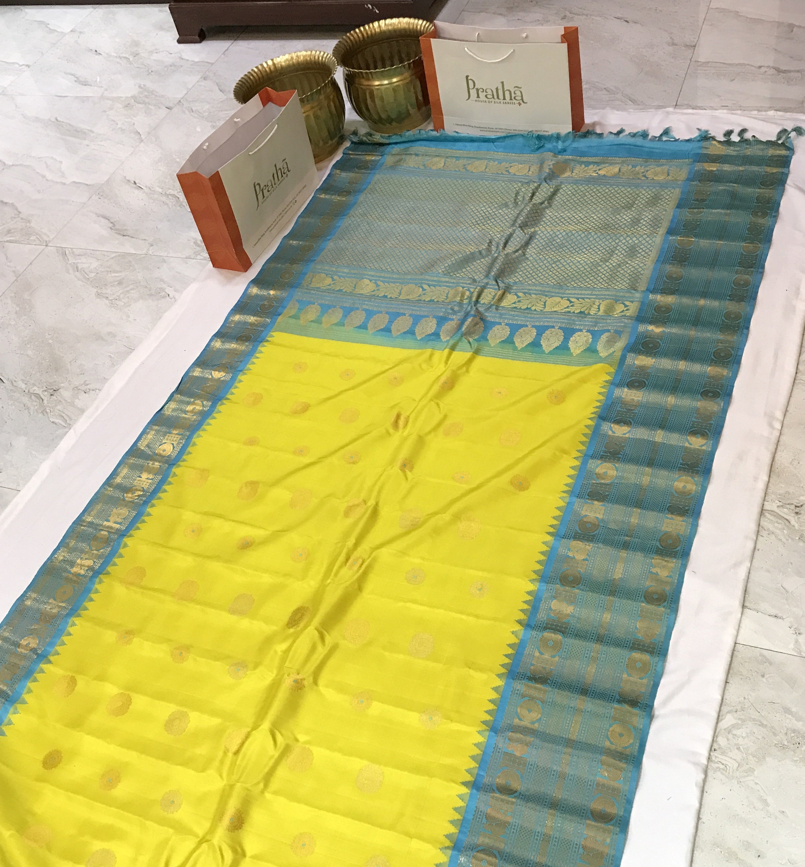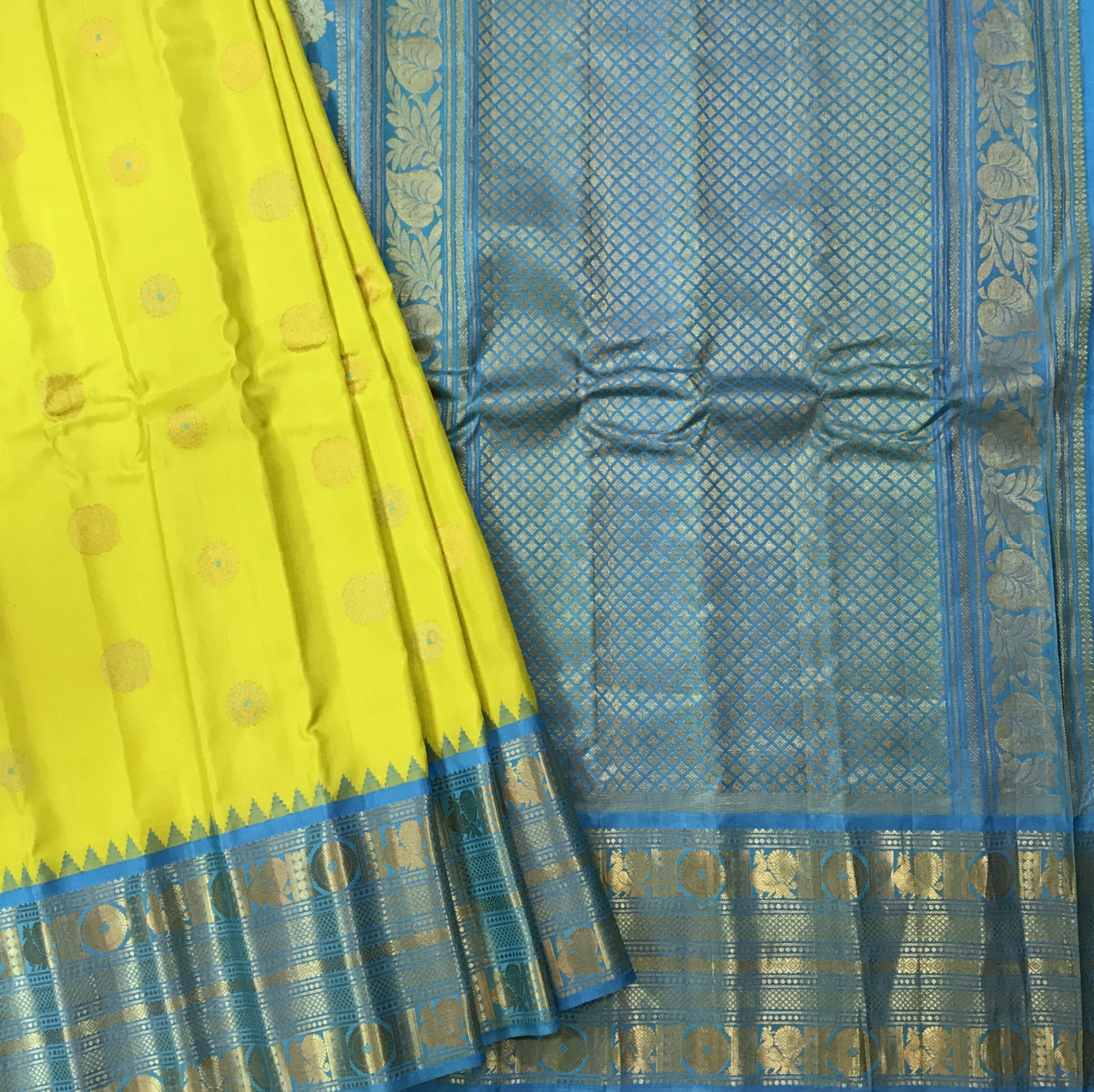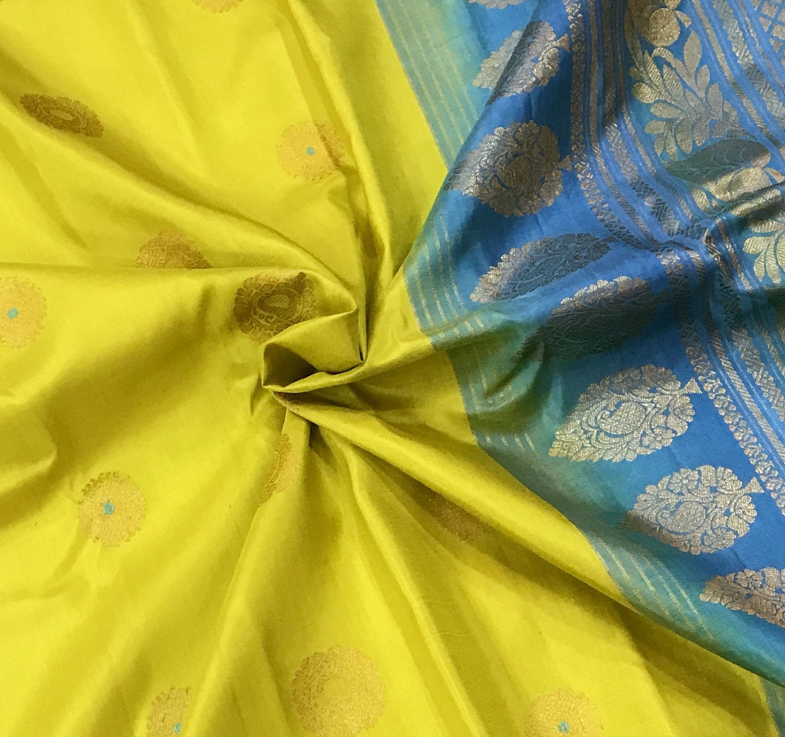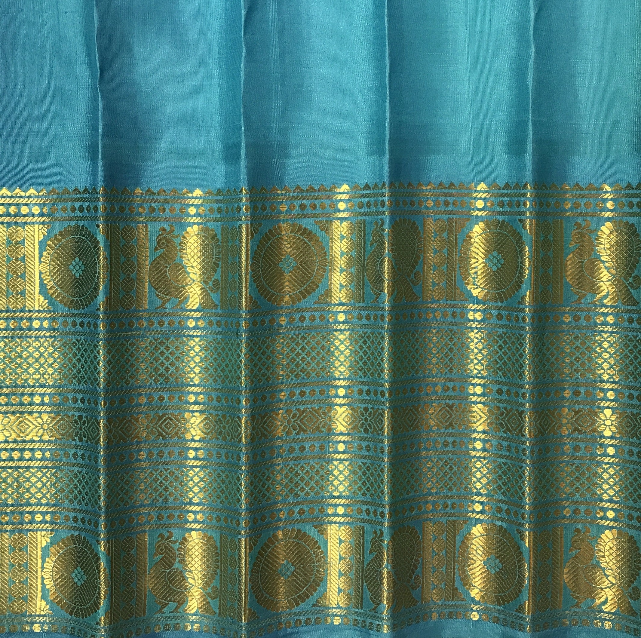 This is a gorgeous and unusual combination of Gadhwal! Green with a greenish-blue zari border and pallu. The traditional style woven border makes the green stand beautifully against the blue saree! The butti design of this saree is equally beautiful in forms of big circle shape with meenakari and contrast zari pallu . For those who are on the lookout for something unique, this one is just for you!