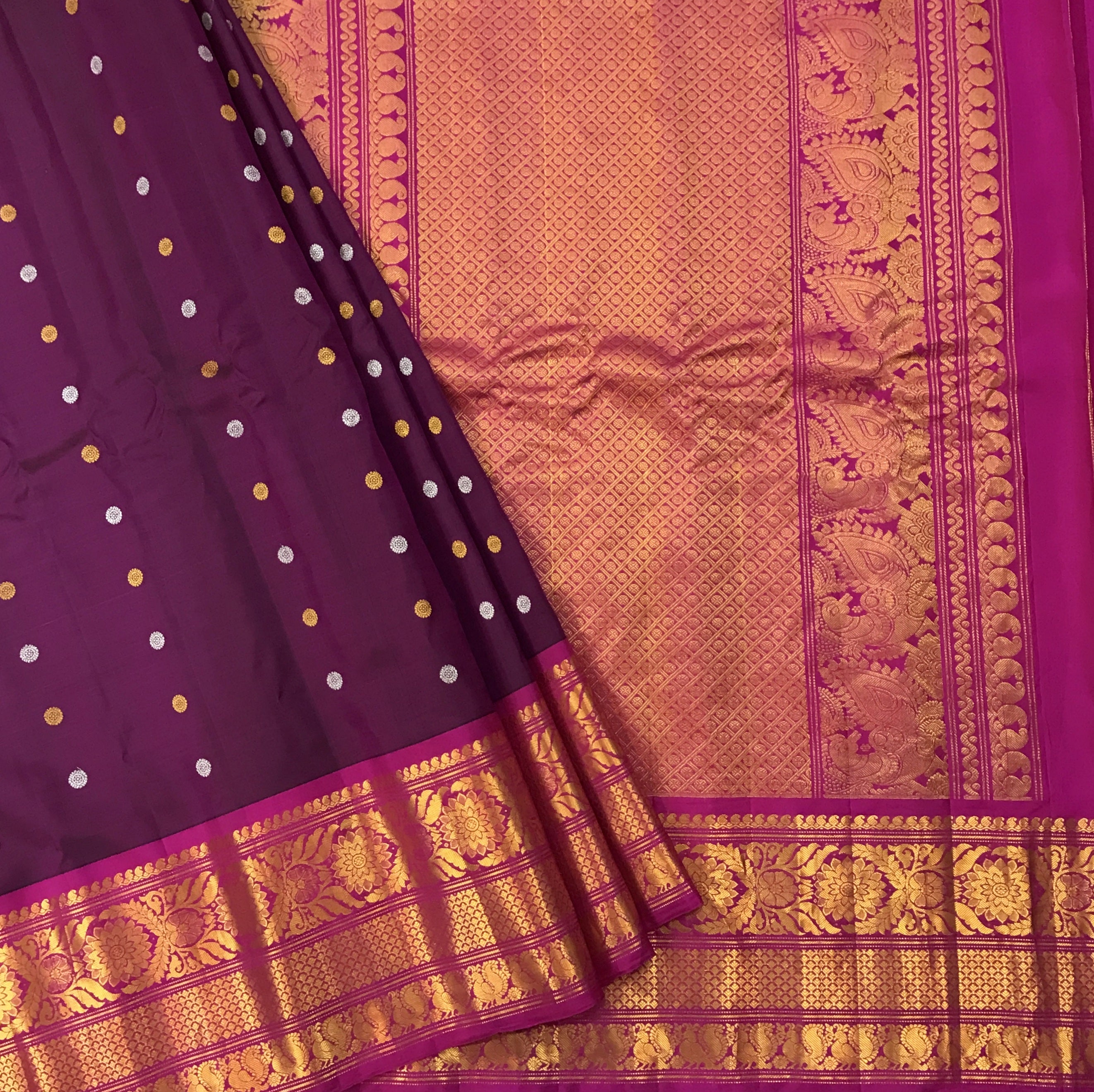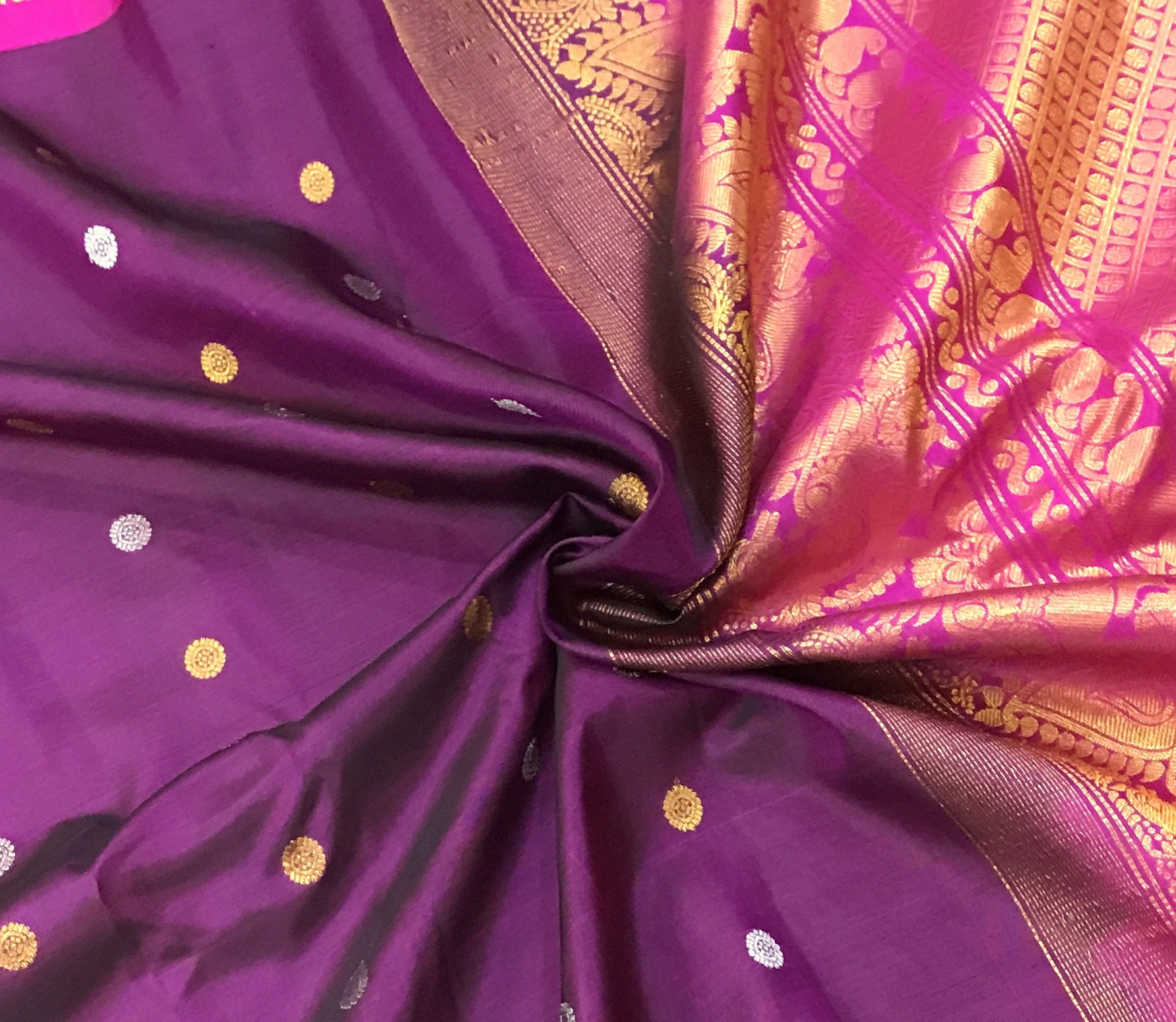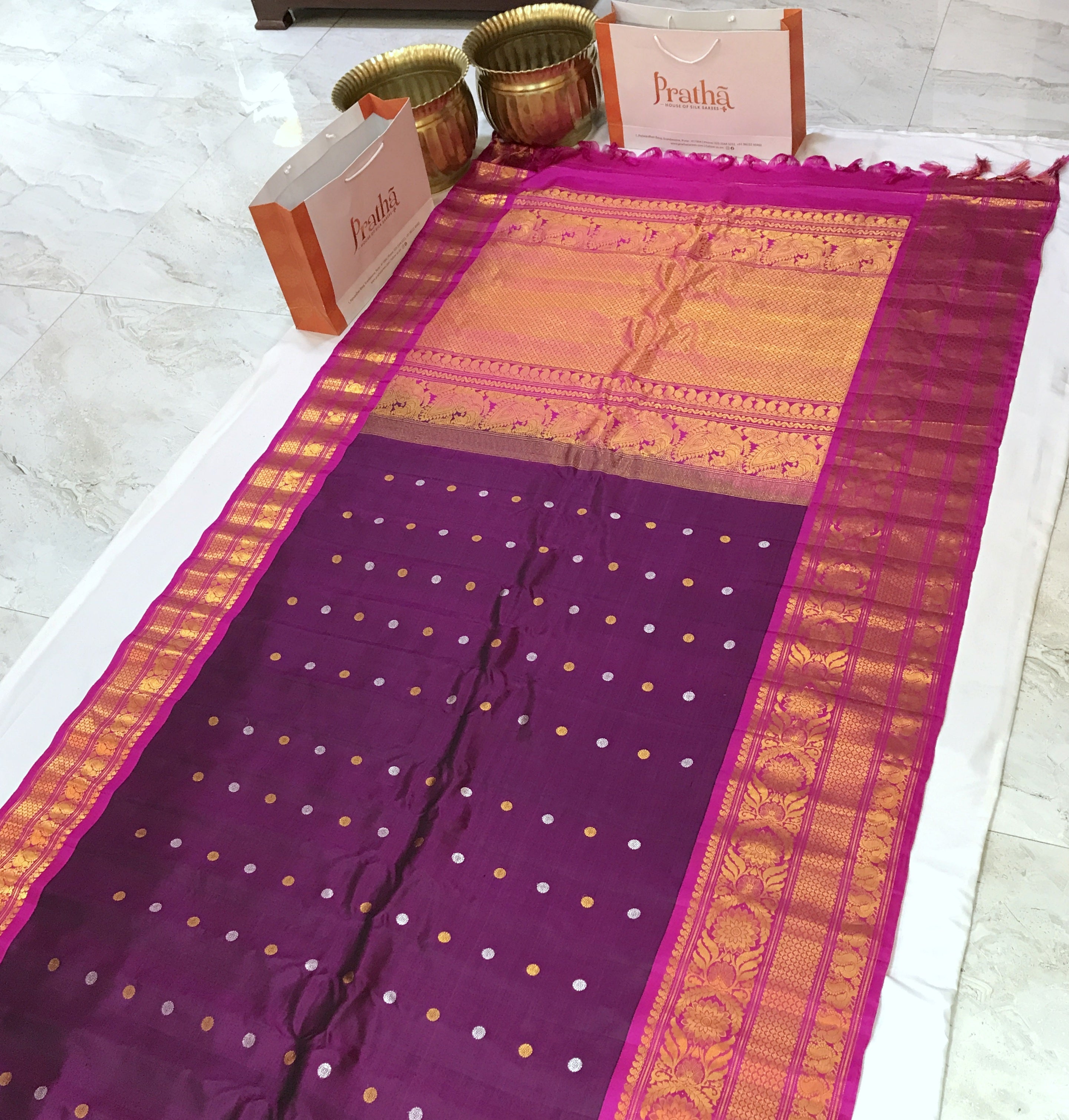 The soothing shade of Magenta-wine and pink combination wins hearts across traditions and cultures! This beautiful Gadhwal, the 'floral' design intricate butti woven in zari ,the pink golden zari border make this weave a charmer! The intricately woven pallu adds to the beauty of this saree!