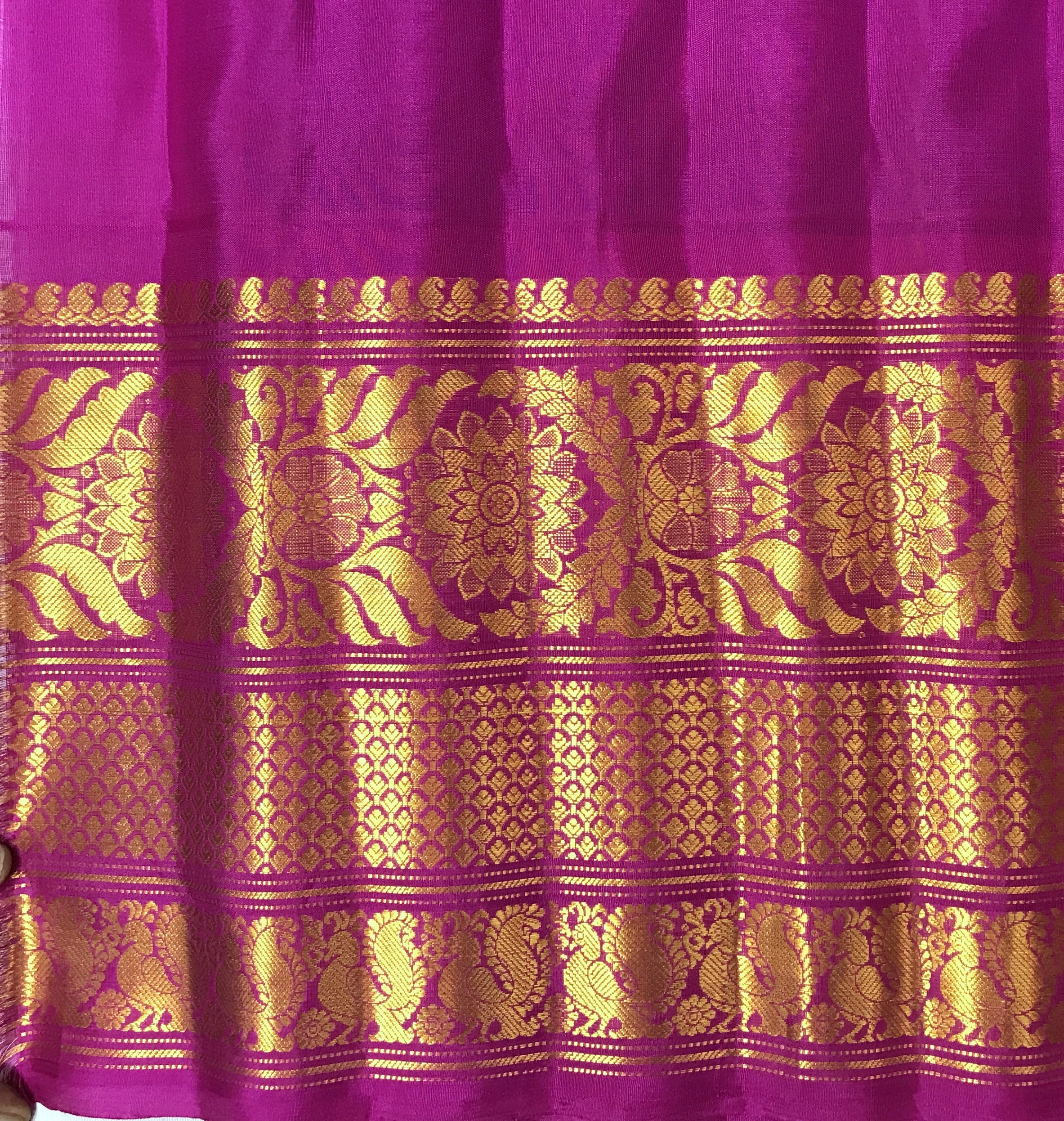 Blouse Colour: Contrast ( Pink with Golden zari border )