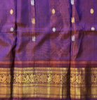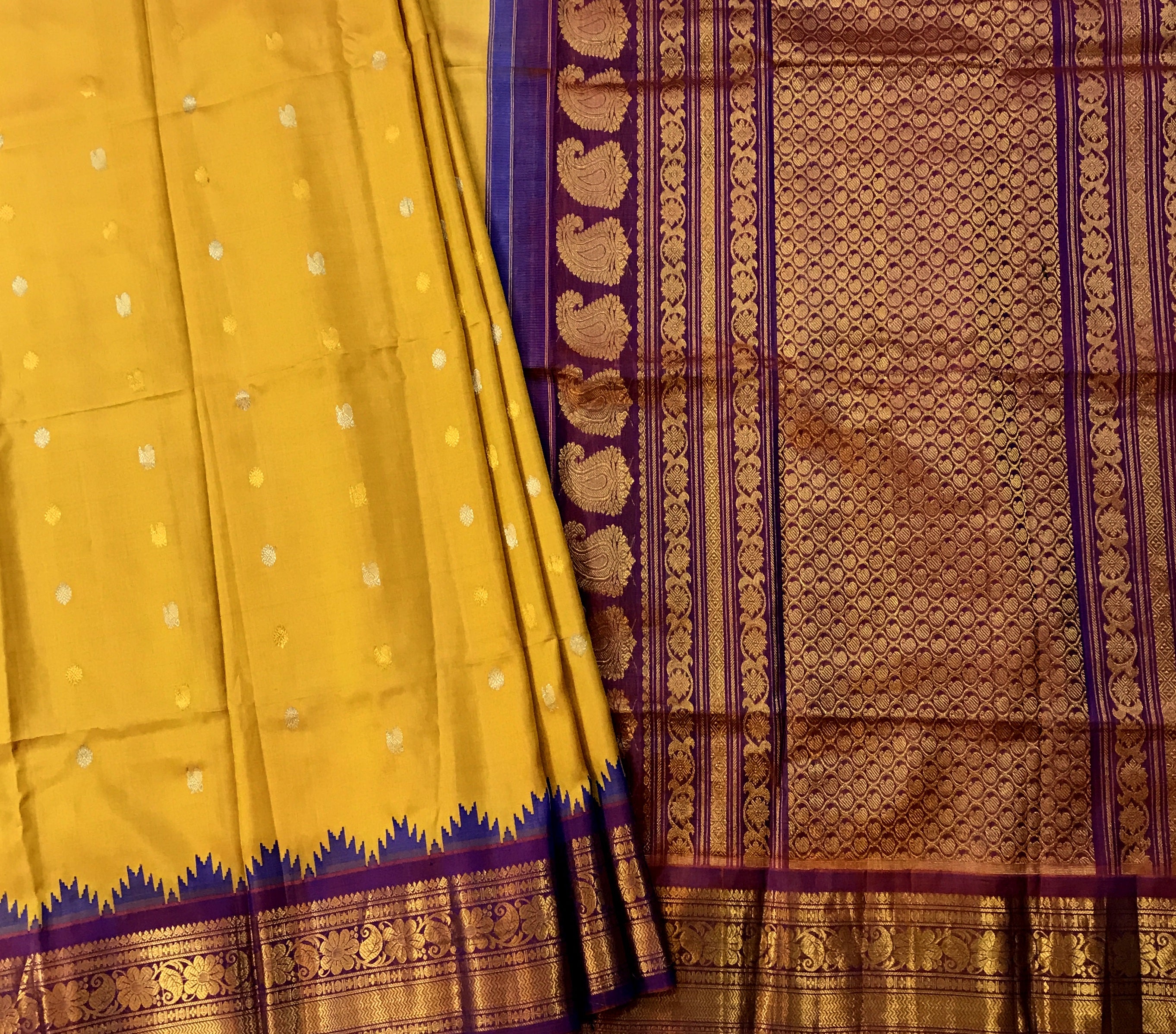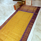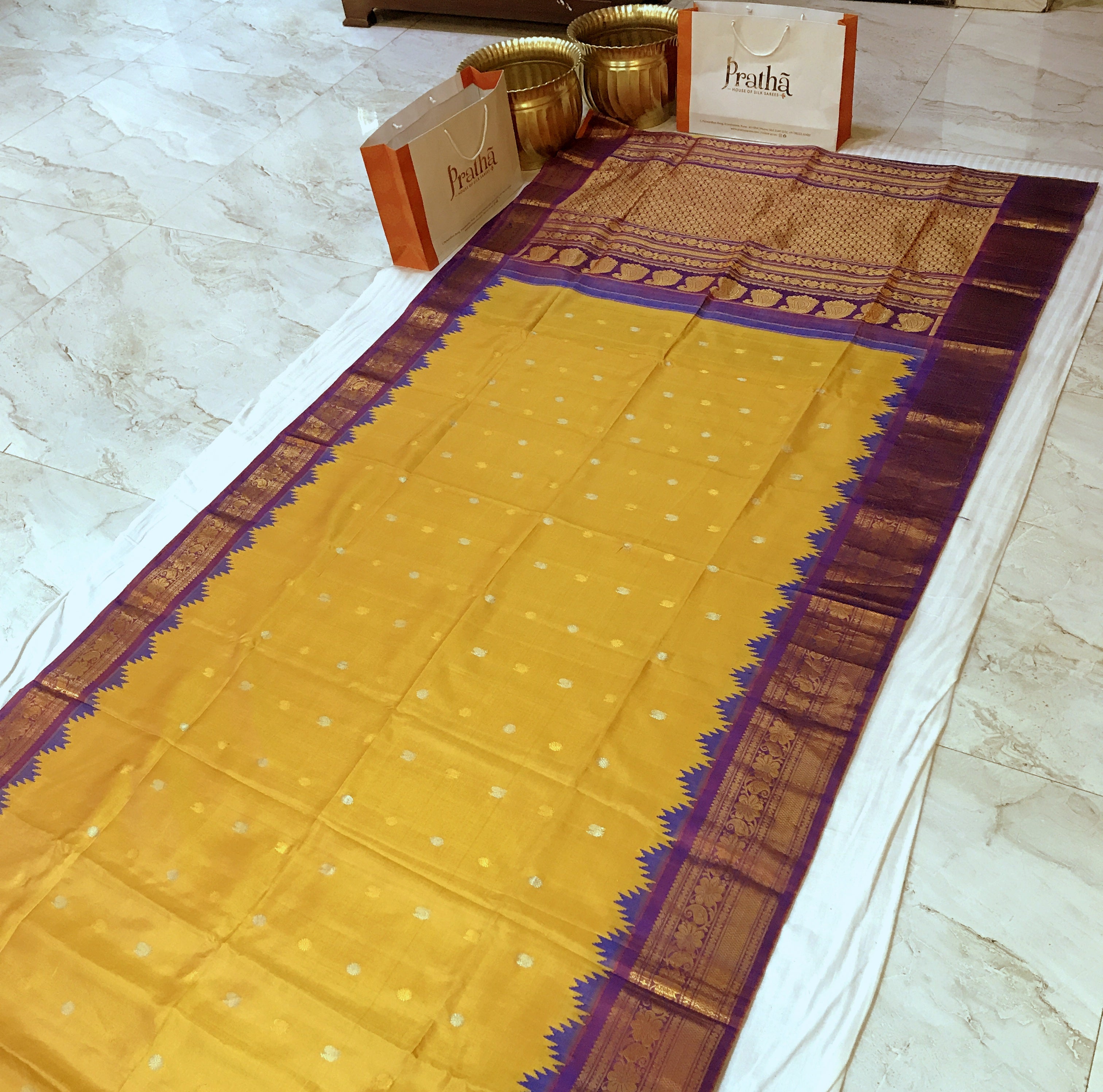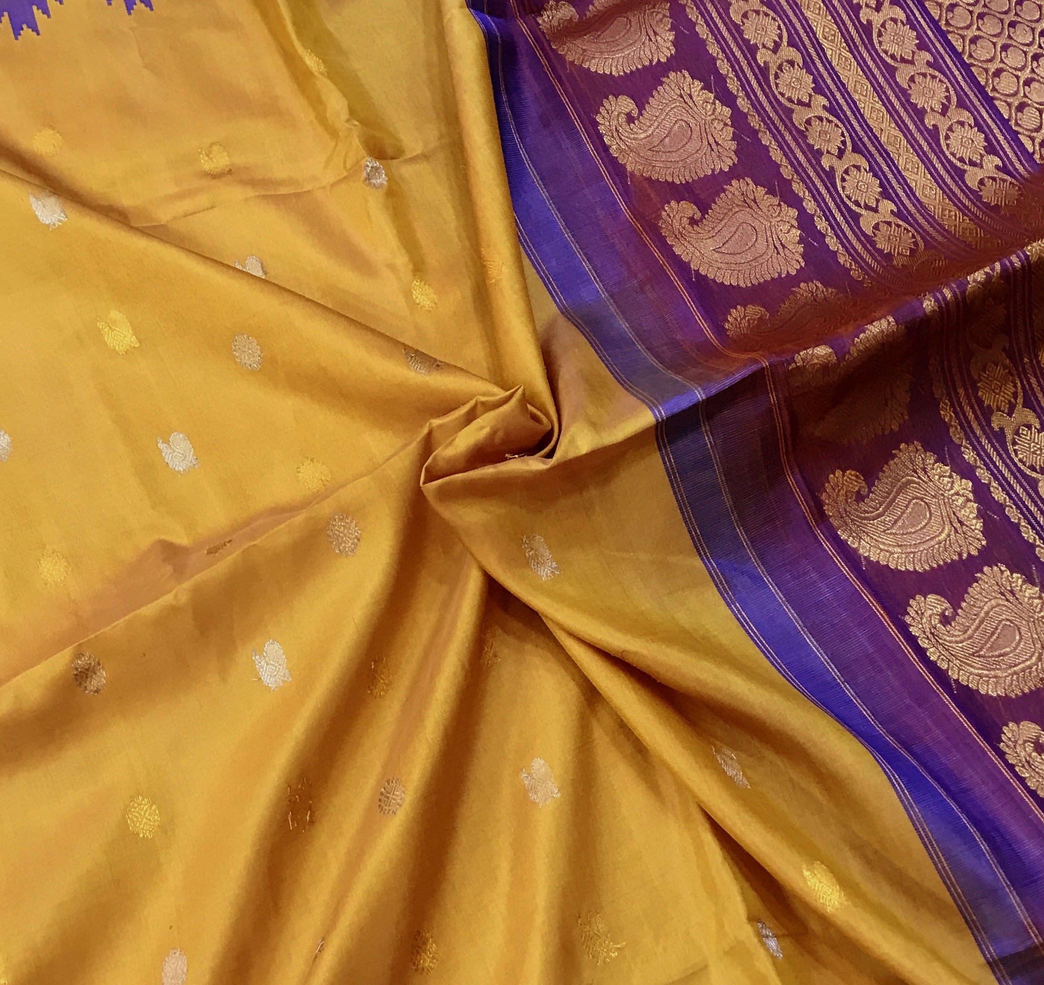 This saree showcases a vibrant deep yellow body, beautifully complemented by a rich magenta zari border and pallu, creating a captivating contrast. The traditionally woven border enhances the charm, allowing the purple to pop against the yellow backdrop. Intricate golden and silver zari butti motifs, featuring alternating peacock and floral designs, adorn the body, adding a sense of grandeur. The contrast magenta and golden zari pallu further elevates the luxurious appeal. Perfect for those seeking an exclusive and standout piece, this saree is an exceptional choice.