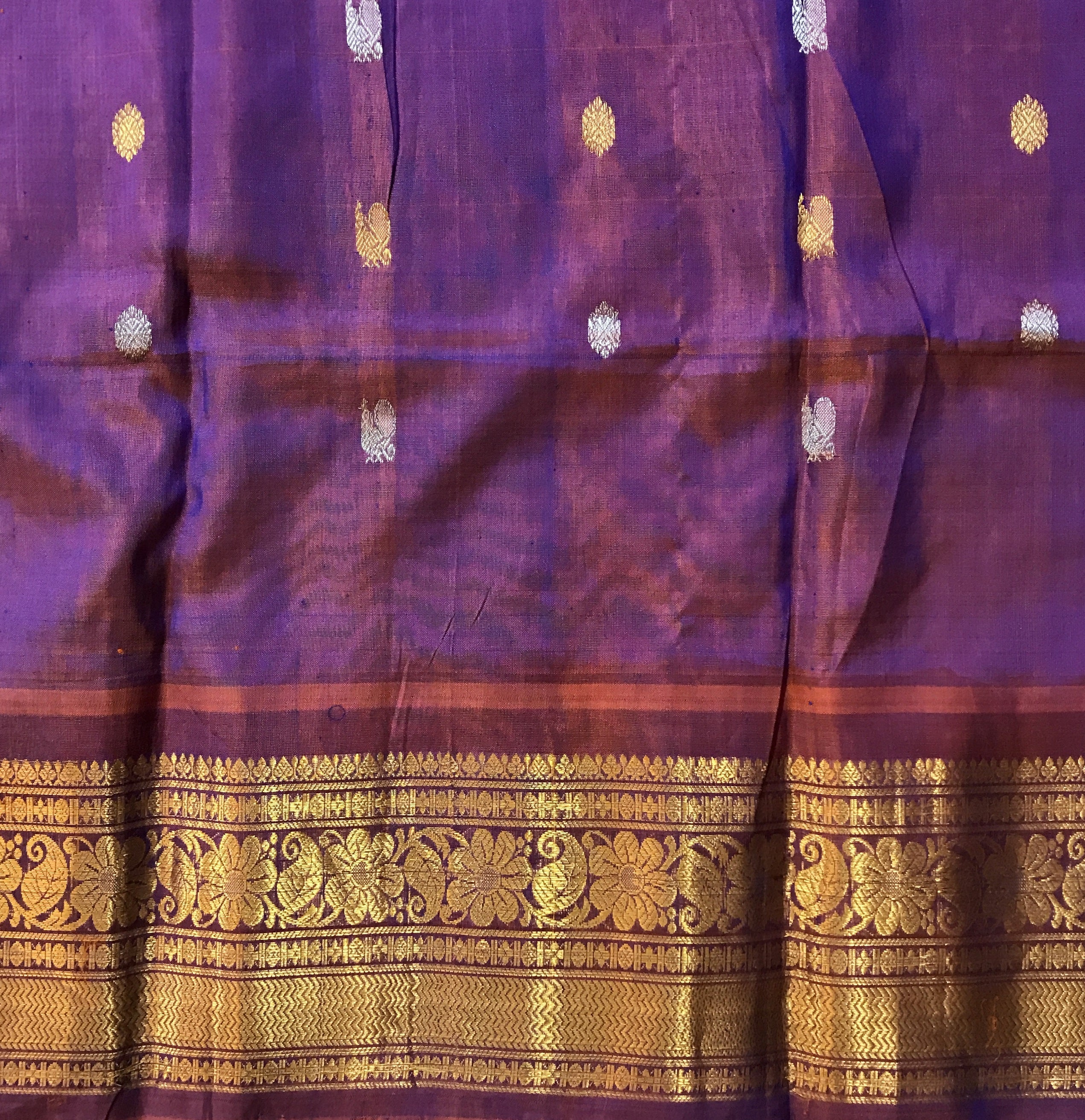 Blouse Colour : Contrast ( rotating shade of magenta with golden and silver zari butti and golden zari border )