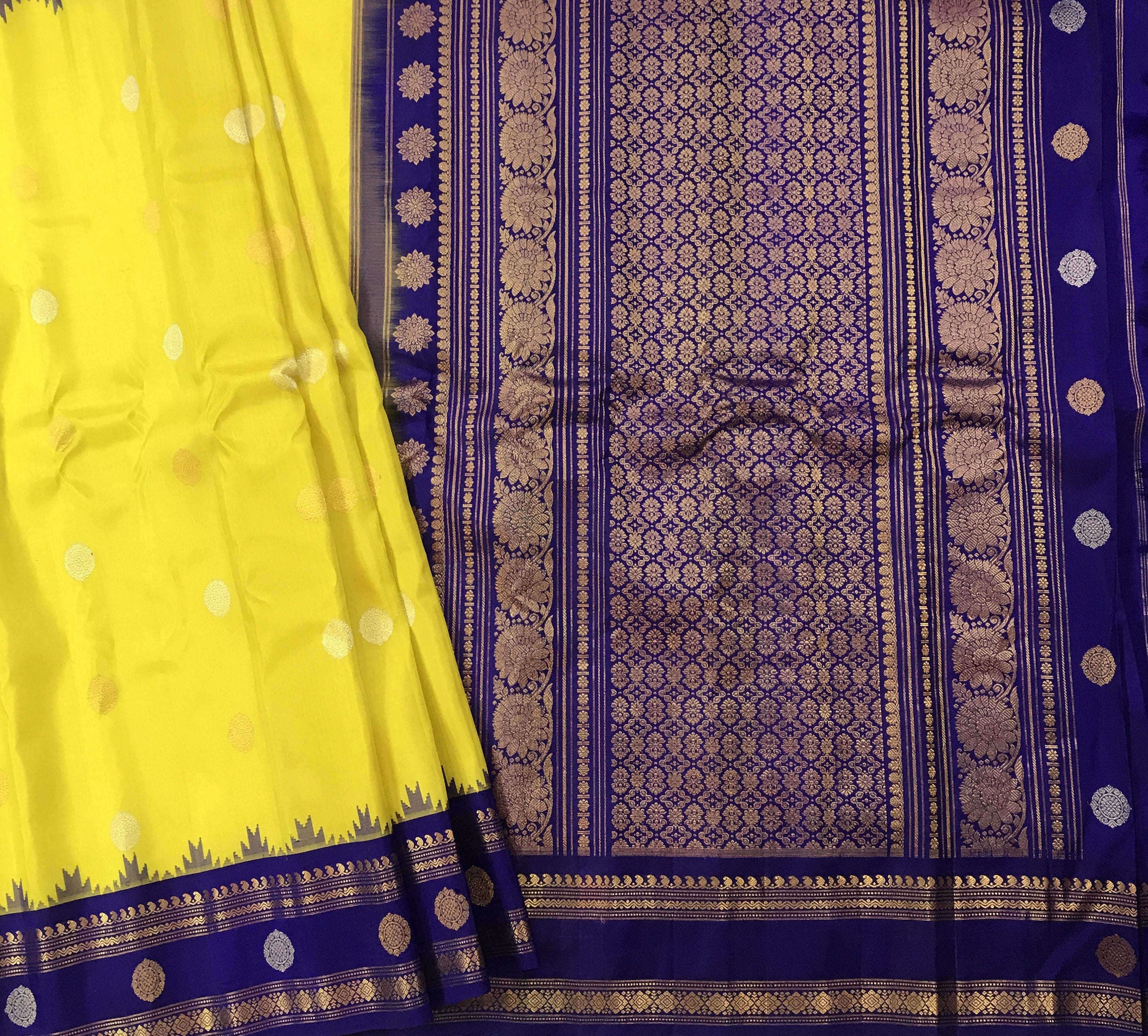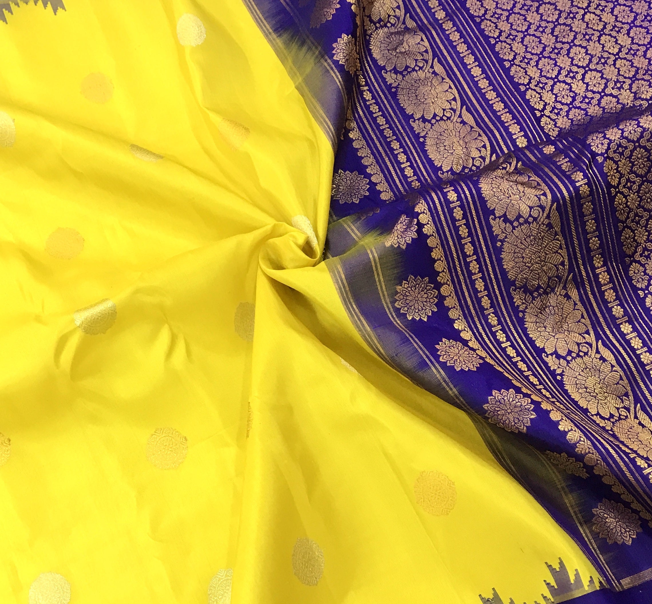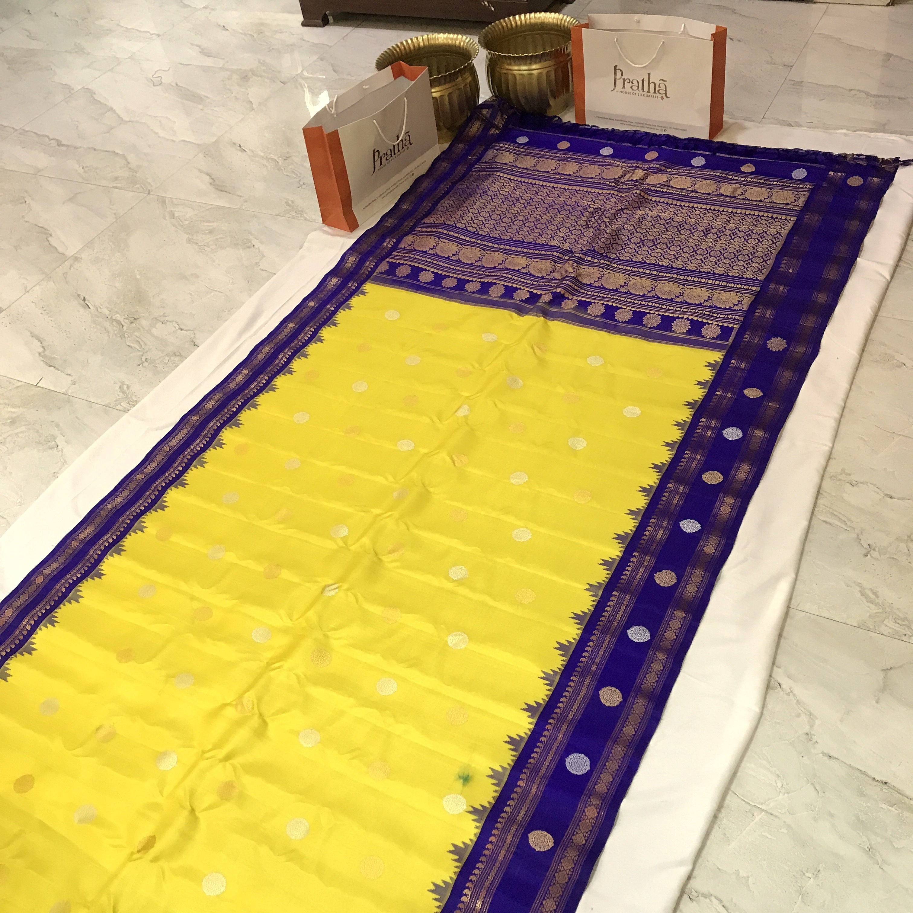 The most traditional style Gadhwal , this one is a classic! The fresh yellow colour with the fantastic blue coloured zari border and pallu - makes this saree an all time hit! Looks beautiful through all age groups and all skin tones. The intricately woven silver-golden zari butti is extremely unique in shape. This stunning combination makes this weave a perfect wedding wear.