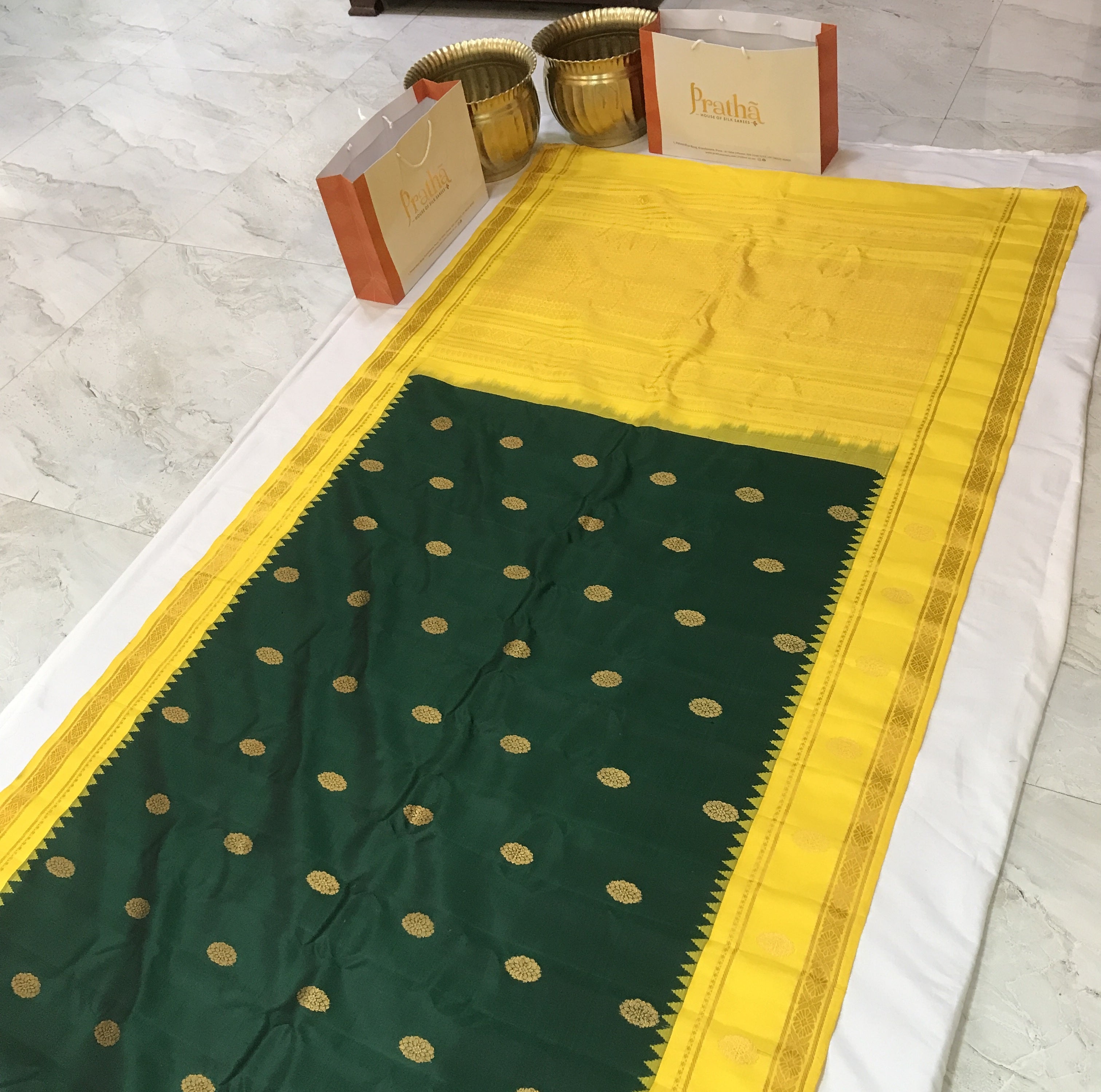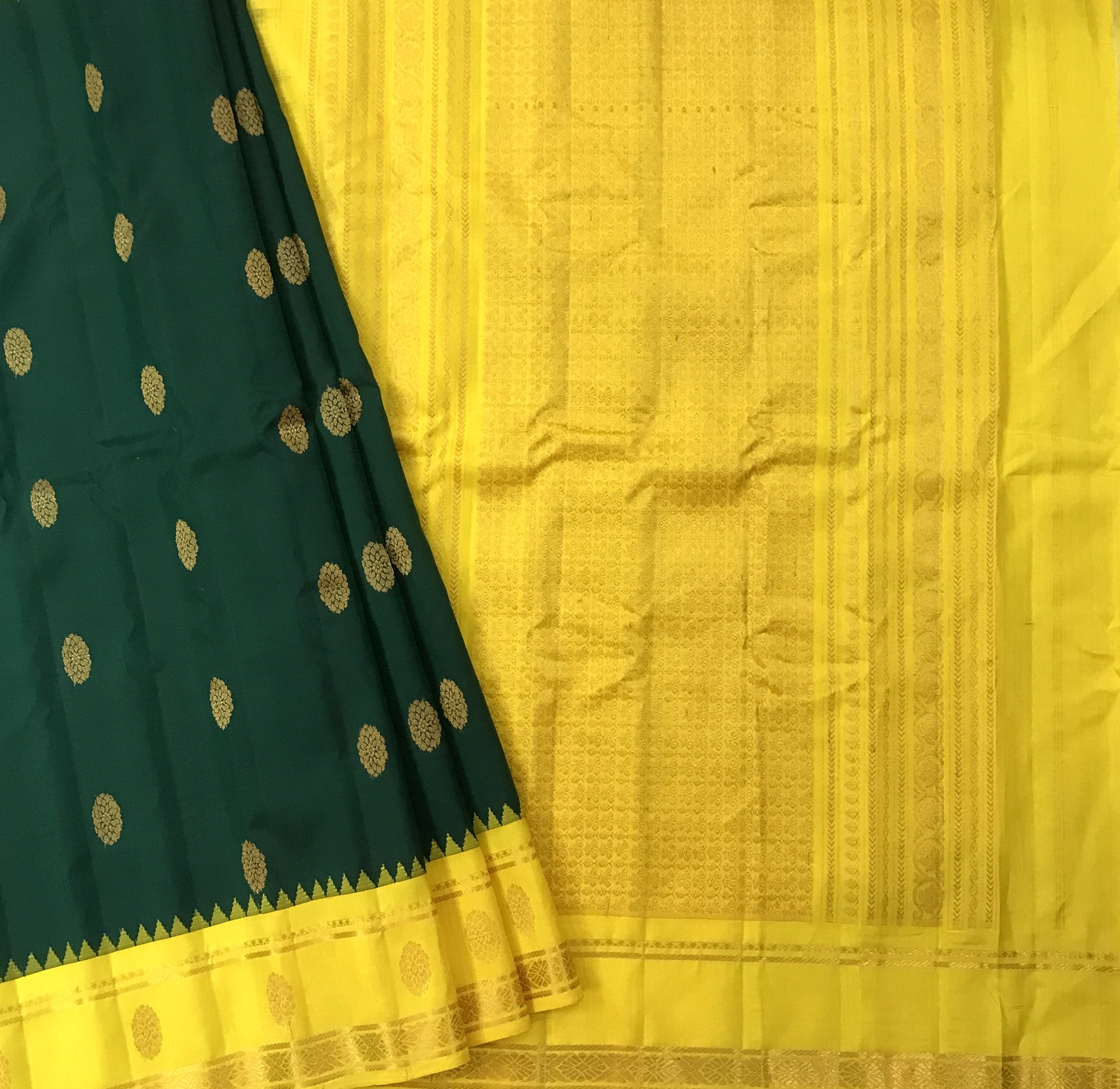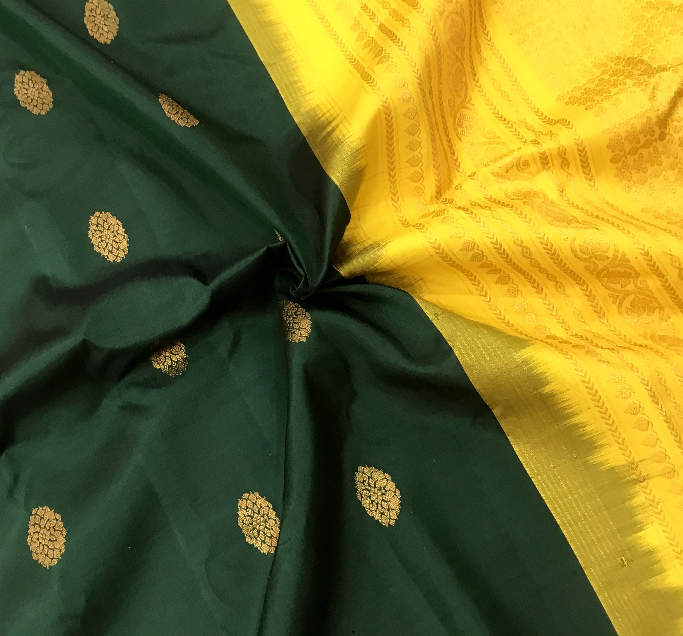 This is a gorgeous and unusual combination and a unique one too! Bottle green with a yellow zari border and pallu. The traditional style woven border makes the yellow stand beautifully against the green saree! The butti design of this saree is equally beautiful in forms of big circle shape with contrast yellow golden zari pallu . For those who are on the lookout for something unique, this one is just for you!